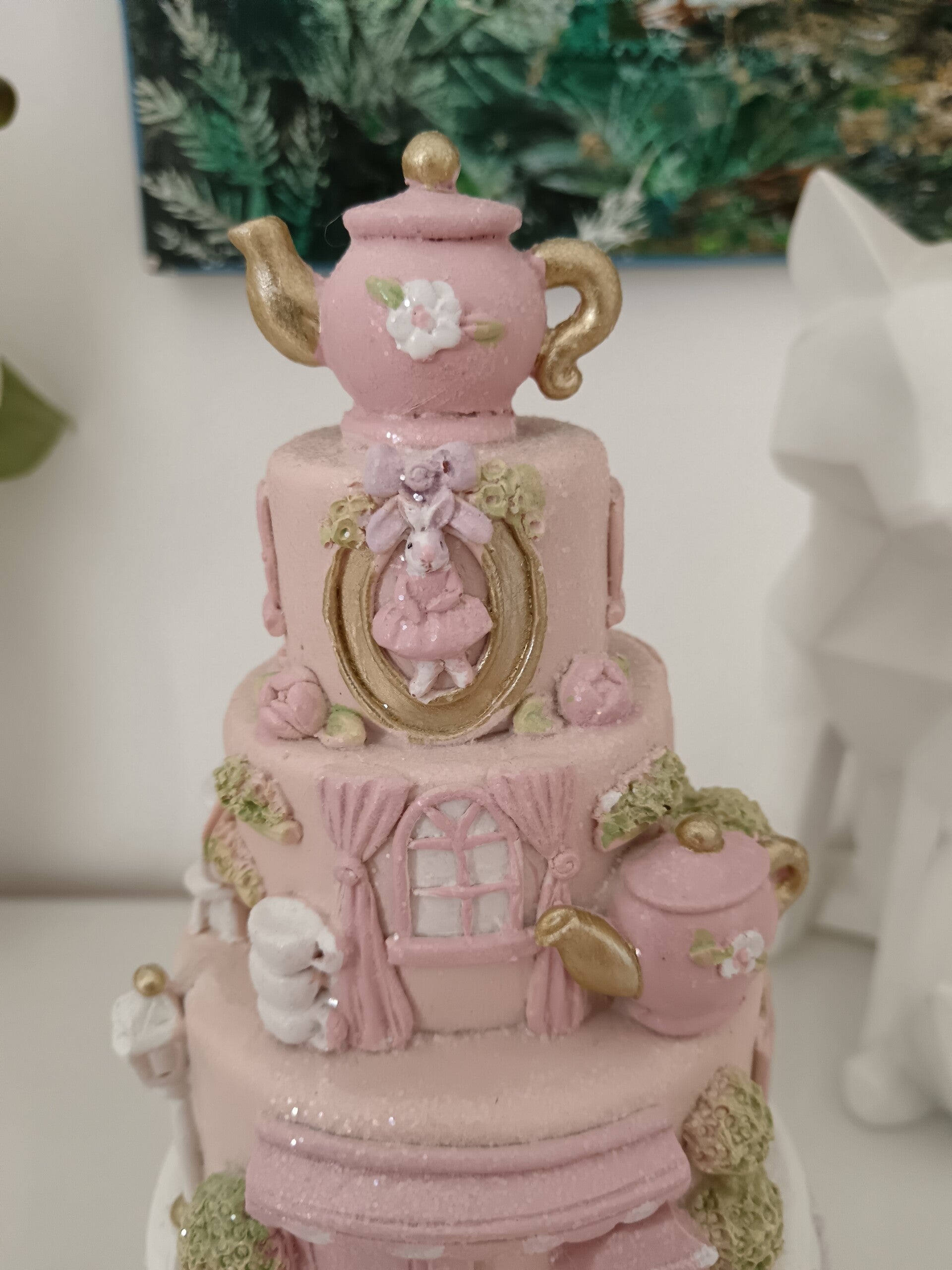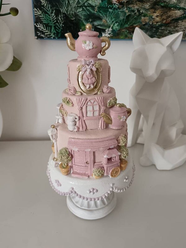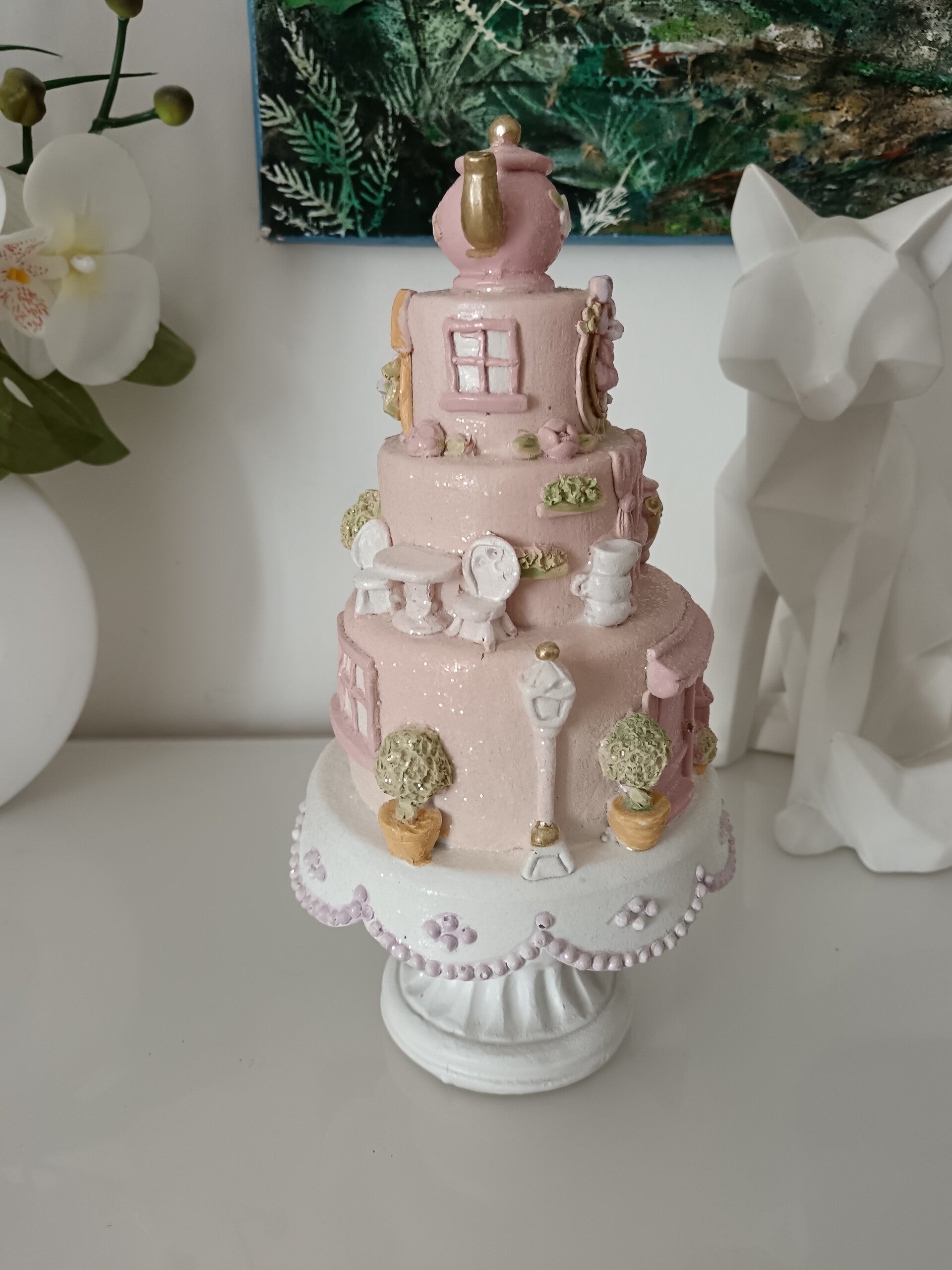 Craquez pour cette superbe décoration en forme de gâteau shabby chic, un véritable clin d’œil à l’univers romantique et vintage ! Avec ses tons pastel délicats, ses petites théières dorées, ses fleurs et ses détails raffinés (fenêtres, lanternes, topiaires), ce gâteau décoratif apporte une touche poétique et gourmande à votre intérieur. En polyrésine et paillettes.