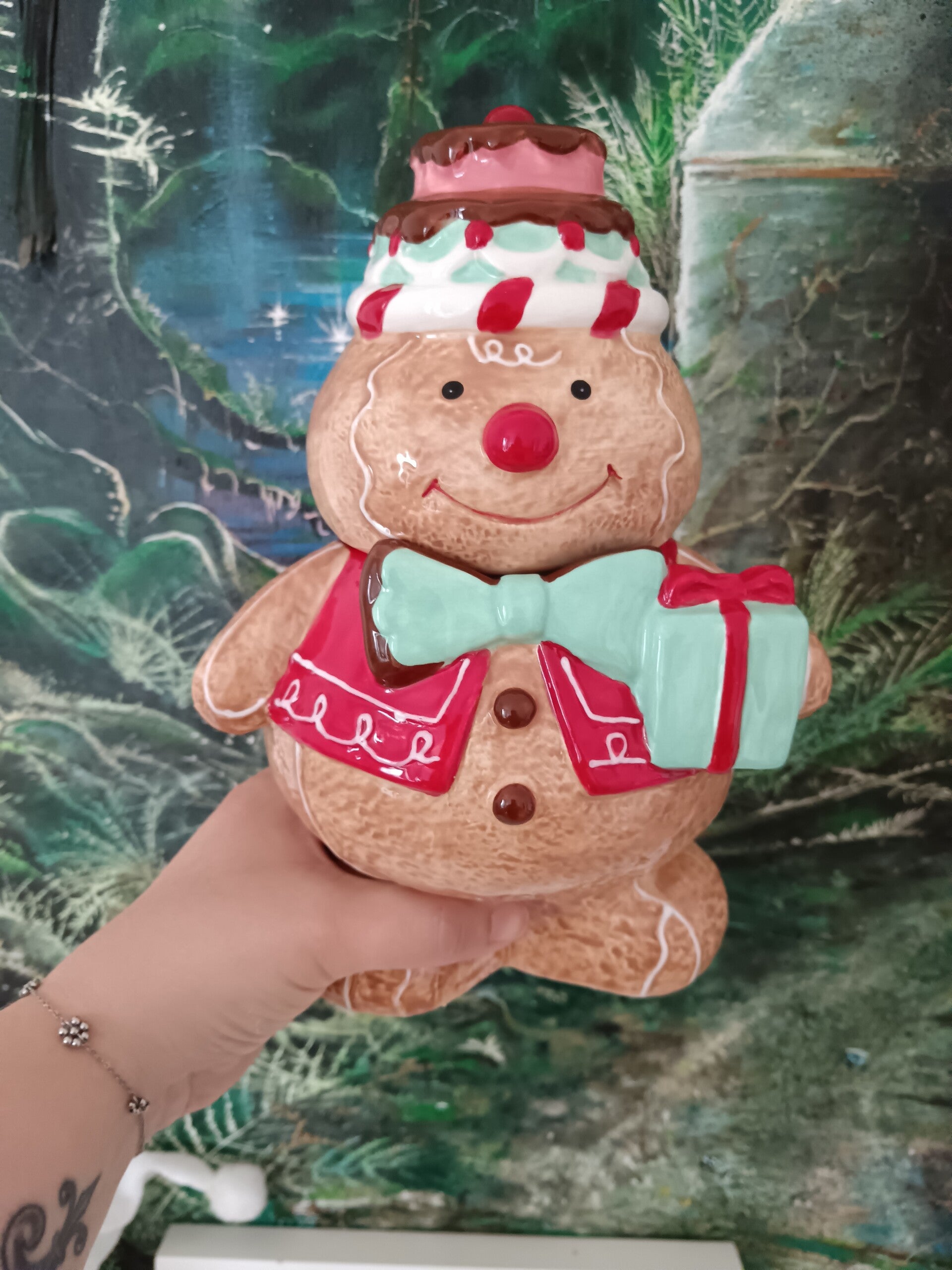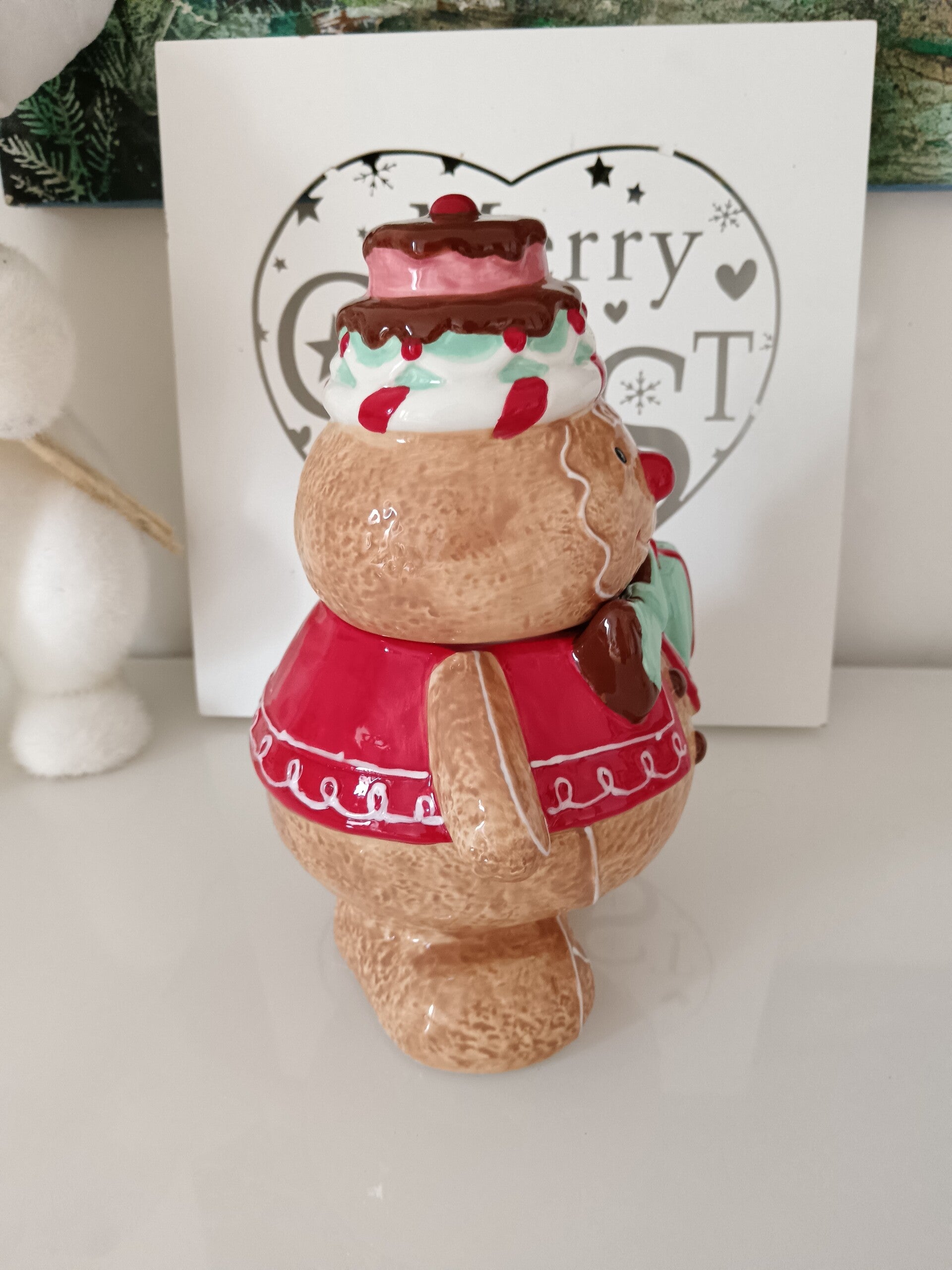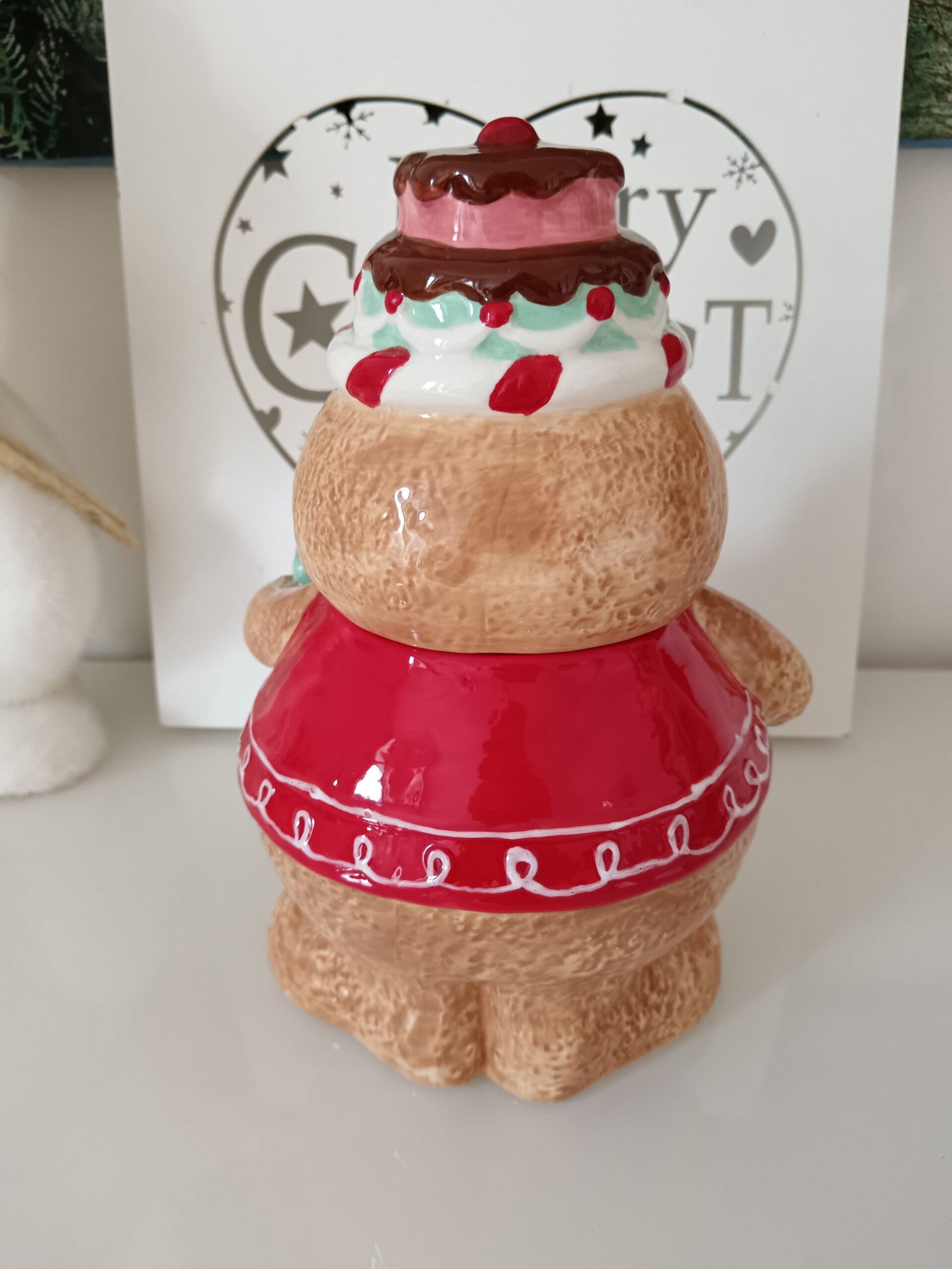 Ajoutez une dose de fantaisie et de douceur à votre cuisine ou votre table de fête avec ce charmant pot alimentaire en forme de bonhomme pain d’épices ! Habillé de son petit gilet rouge, nœud papillon vert menthe et coiffé d’un délicieux glaçage gourmand décoré de bonbons et d’un donut, il tient un joli cadeau prêt à offrir… ou à cacher vos petites douceurs préférées ! En céramique.