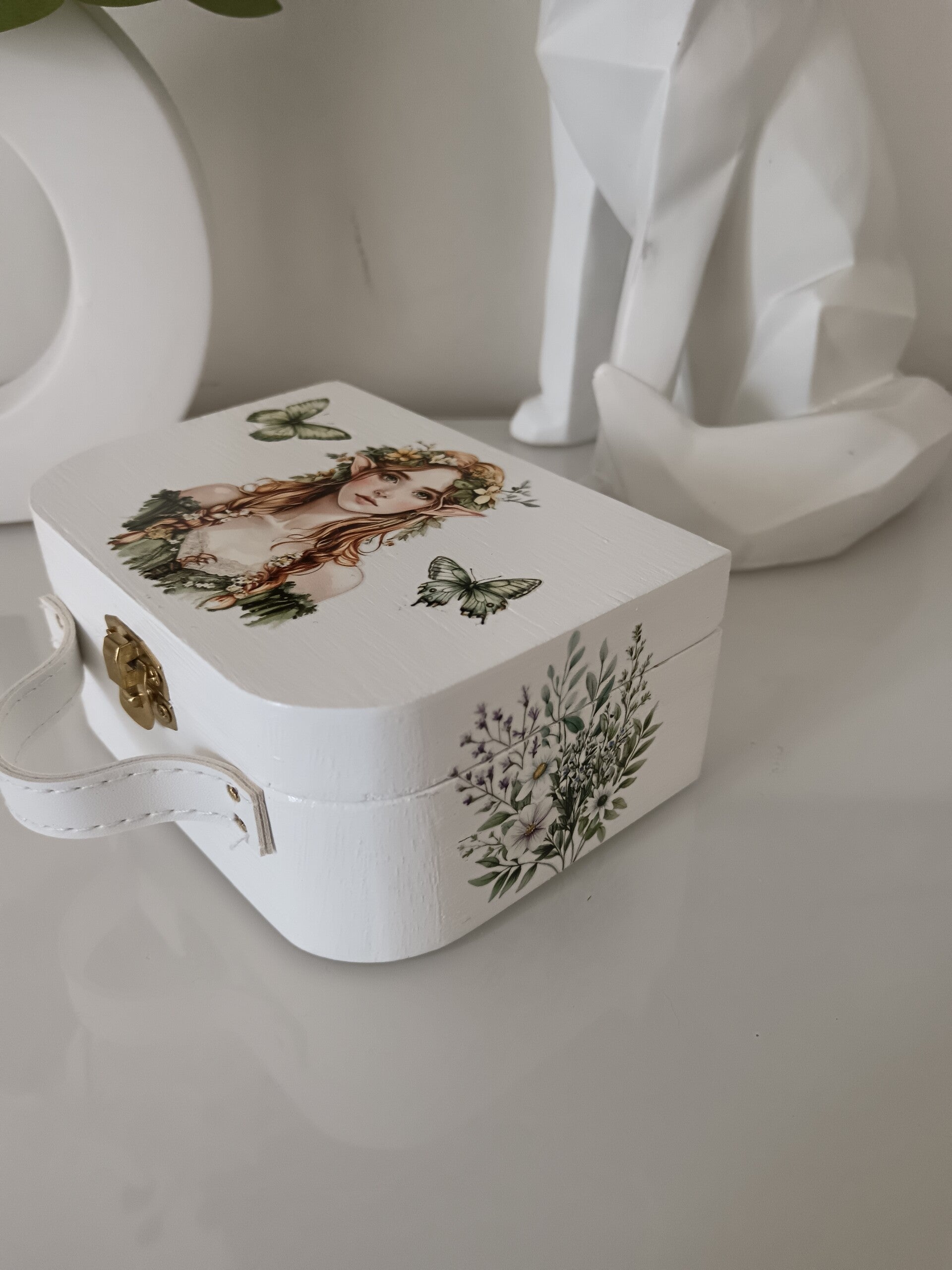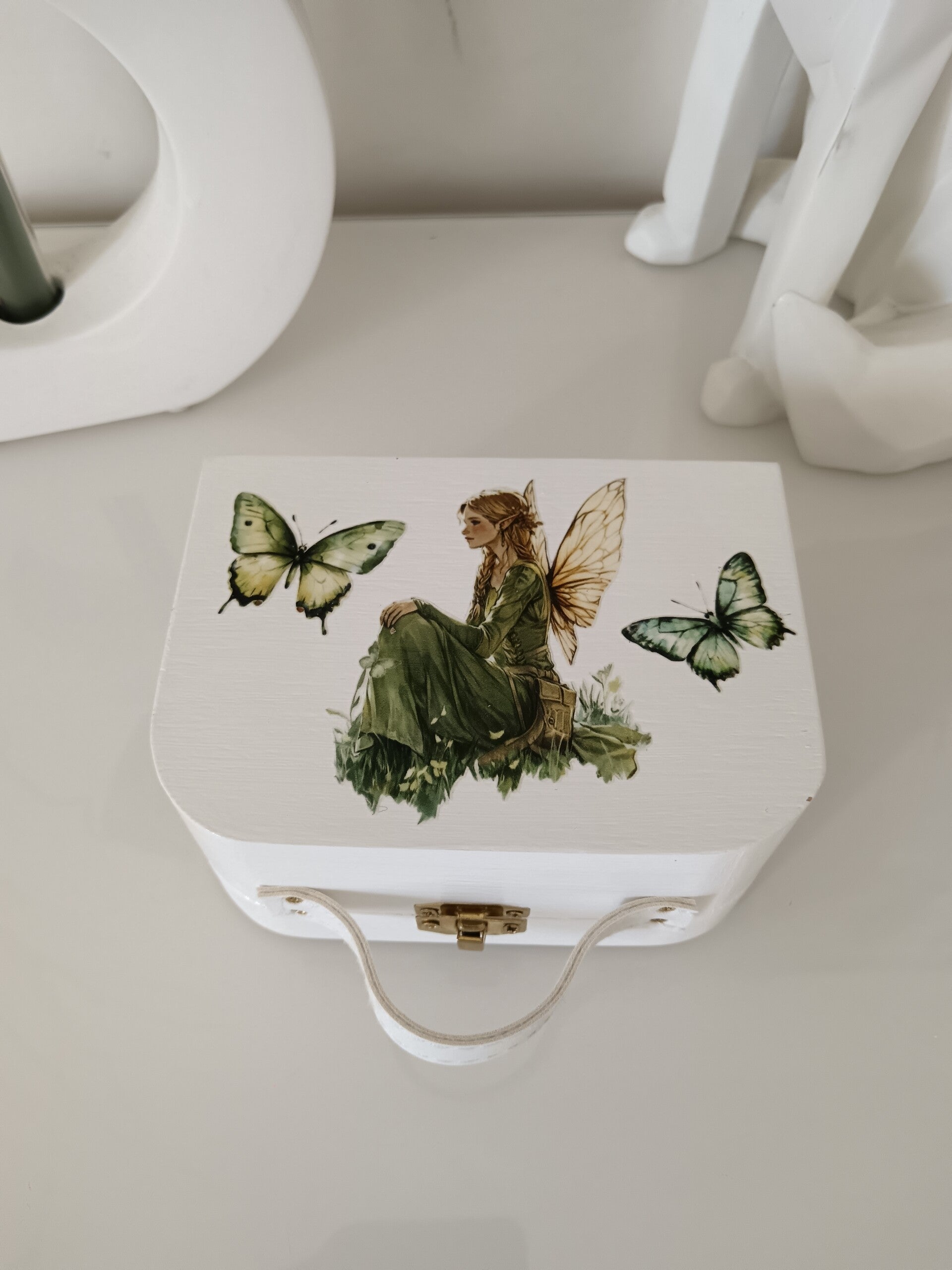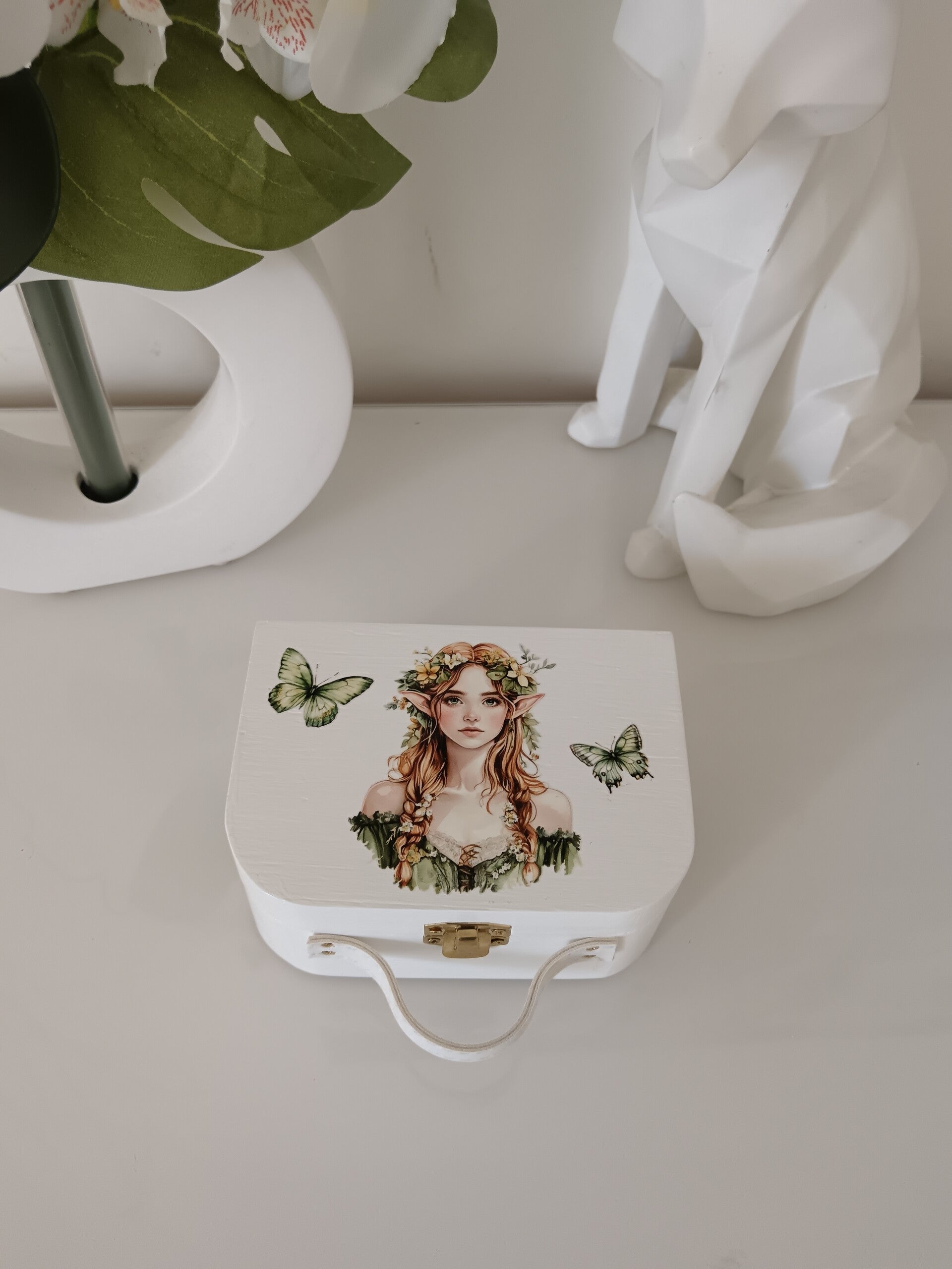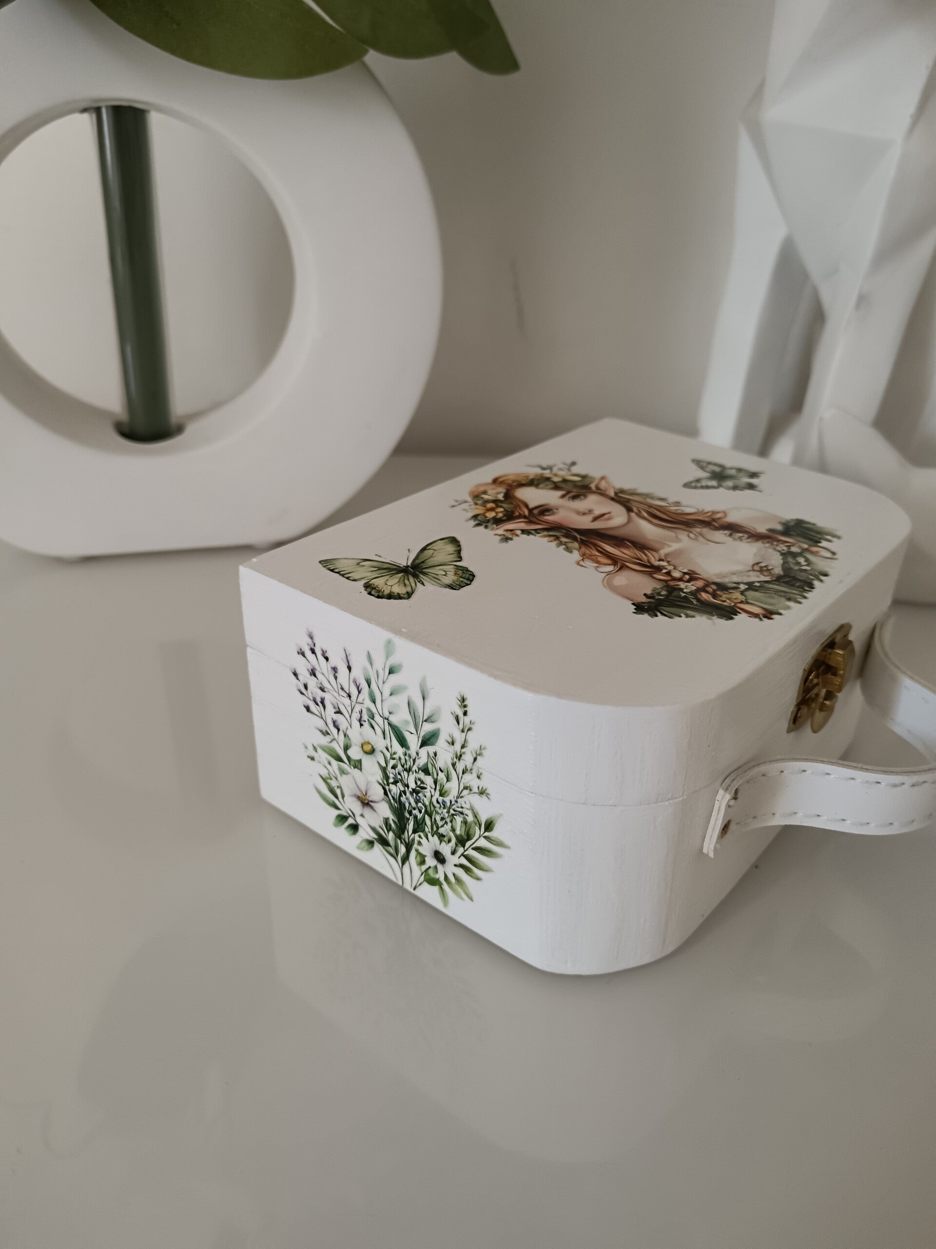 Apportez une touche de magie à votre intérieur avec cette magnifique petite boîte en bois en forme de valise. Peinte en blanc et décorée avec soin, elle présente des illustrations féériques représentant de délicates fées, des papillons verts et des plantes botaniques, pour un style naturel et enchanteur. Fermeture en métal doré : Pour garder vos petits trésors bien en sécurité. Création artisanale et unique protégée par plusieurs couches de vernis.