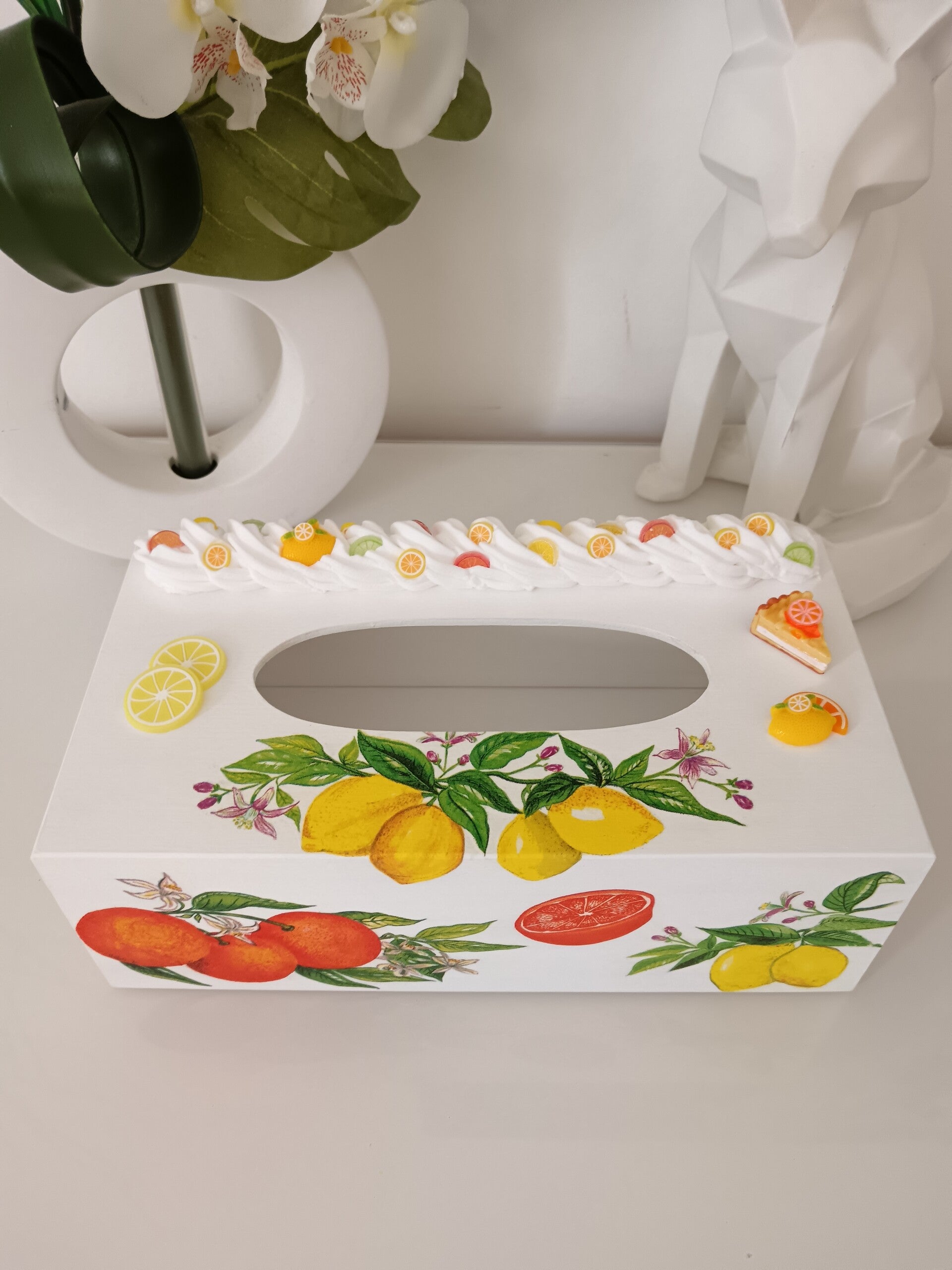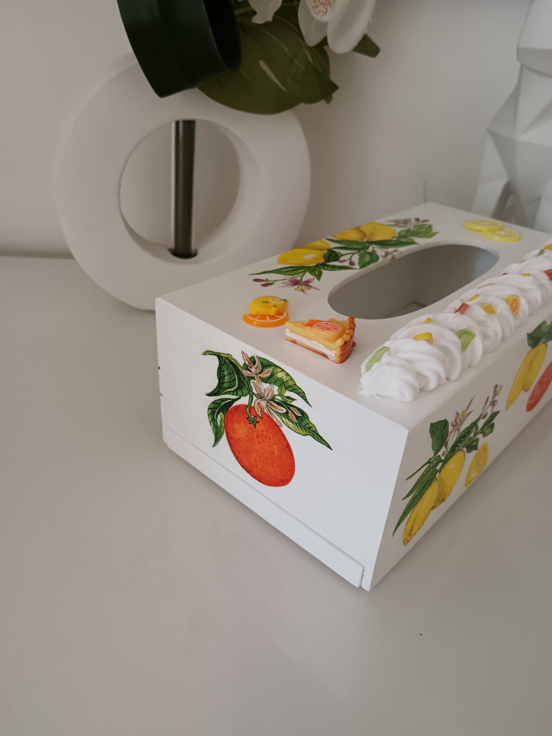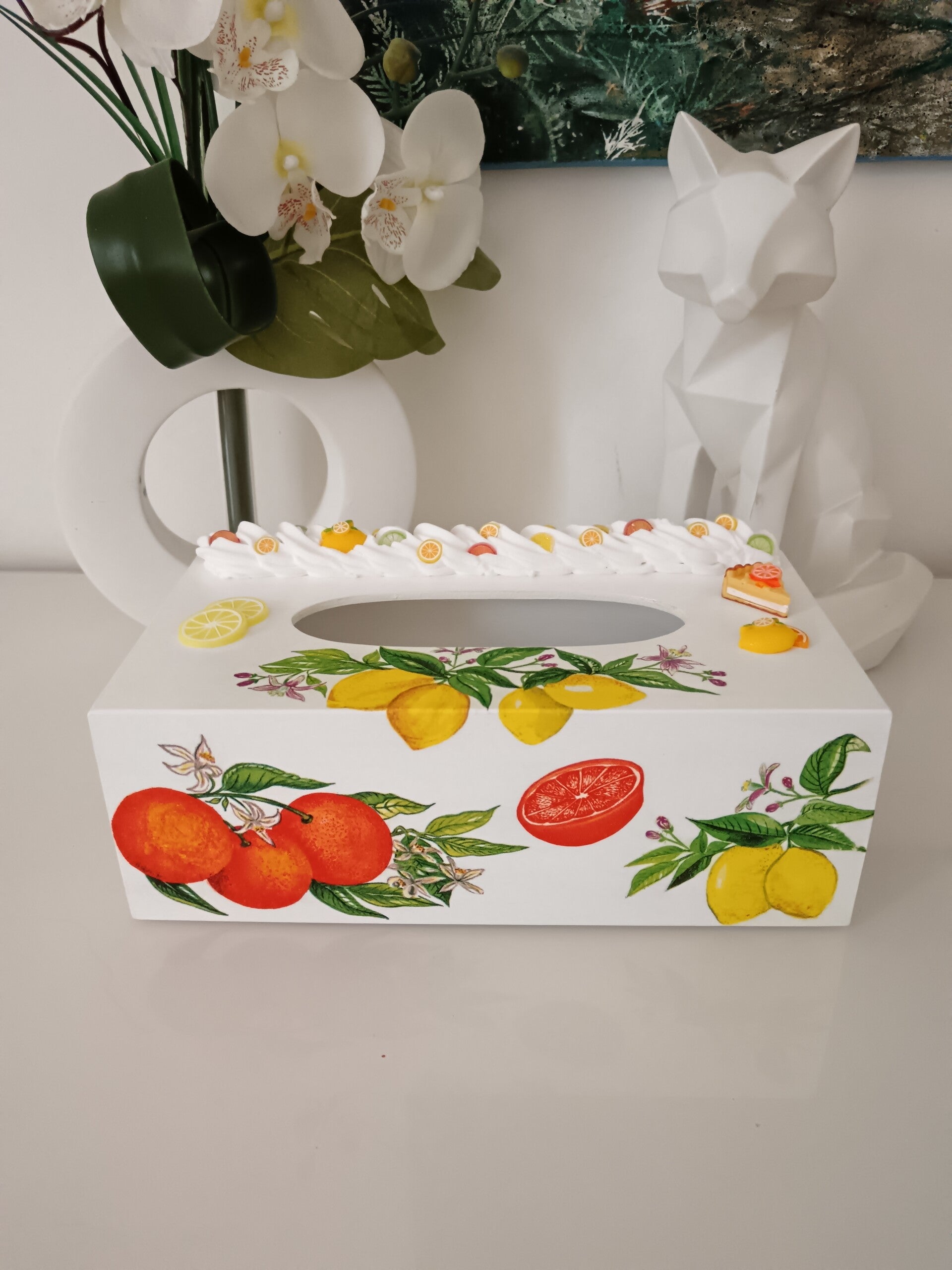 Ajoutez une touche de fraîcheur à votre intérieur avec cette jolie boîte à mouchoirs en bois, décorée à la main avec la technique du serviettage. Illustrée de citrons, oranges et fleurs colorées, elle est sublimée par un faux glaçage "chantilly" et de petites décorations (fruits et pâtisseries). Création unique.
