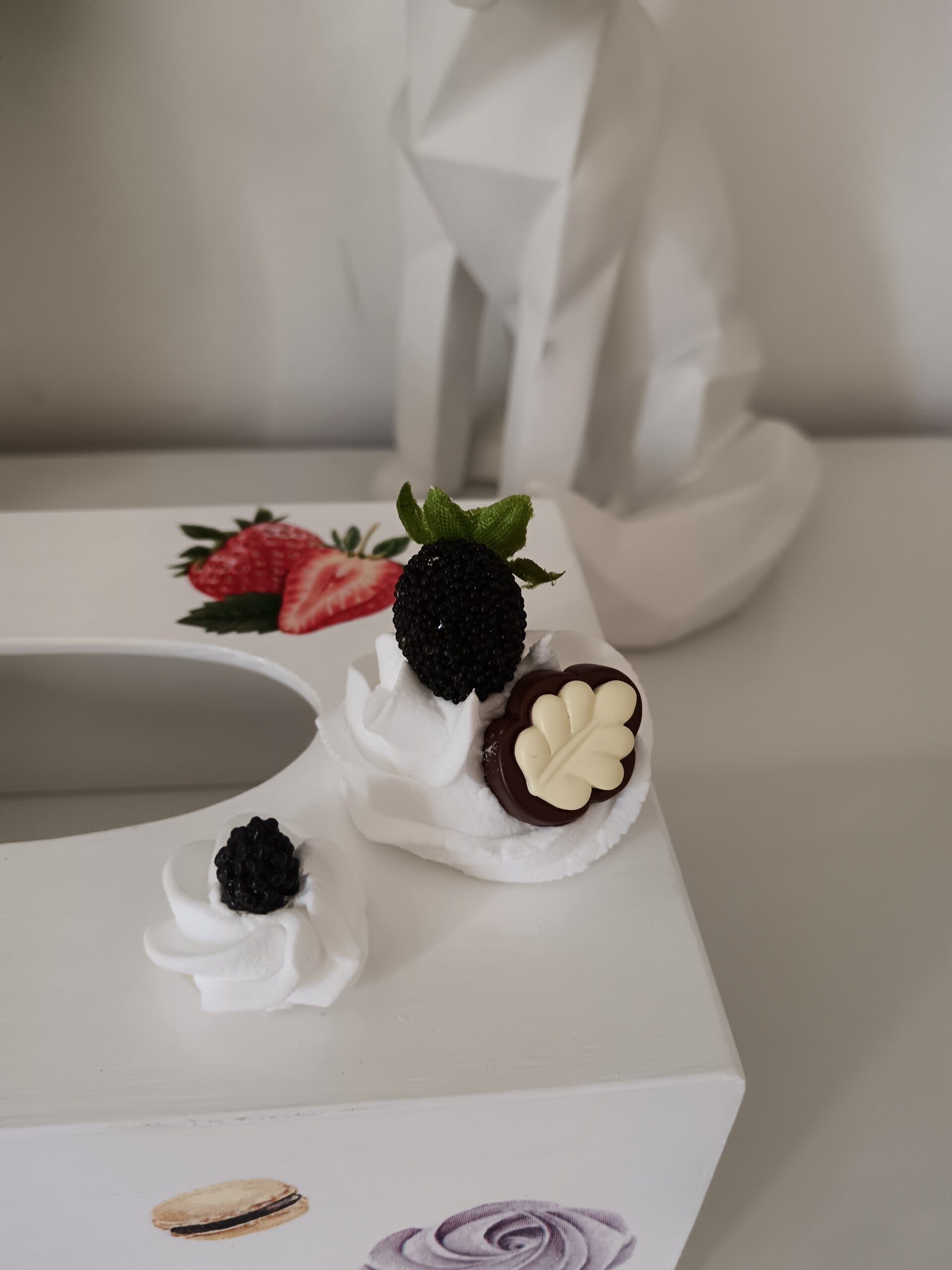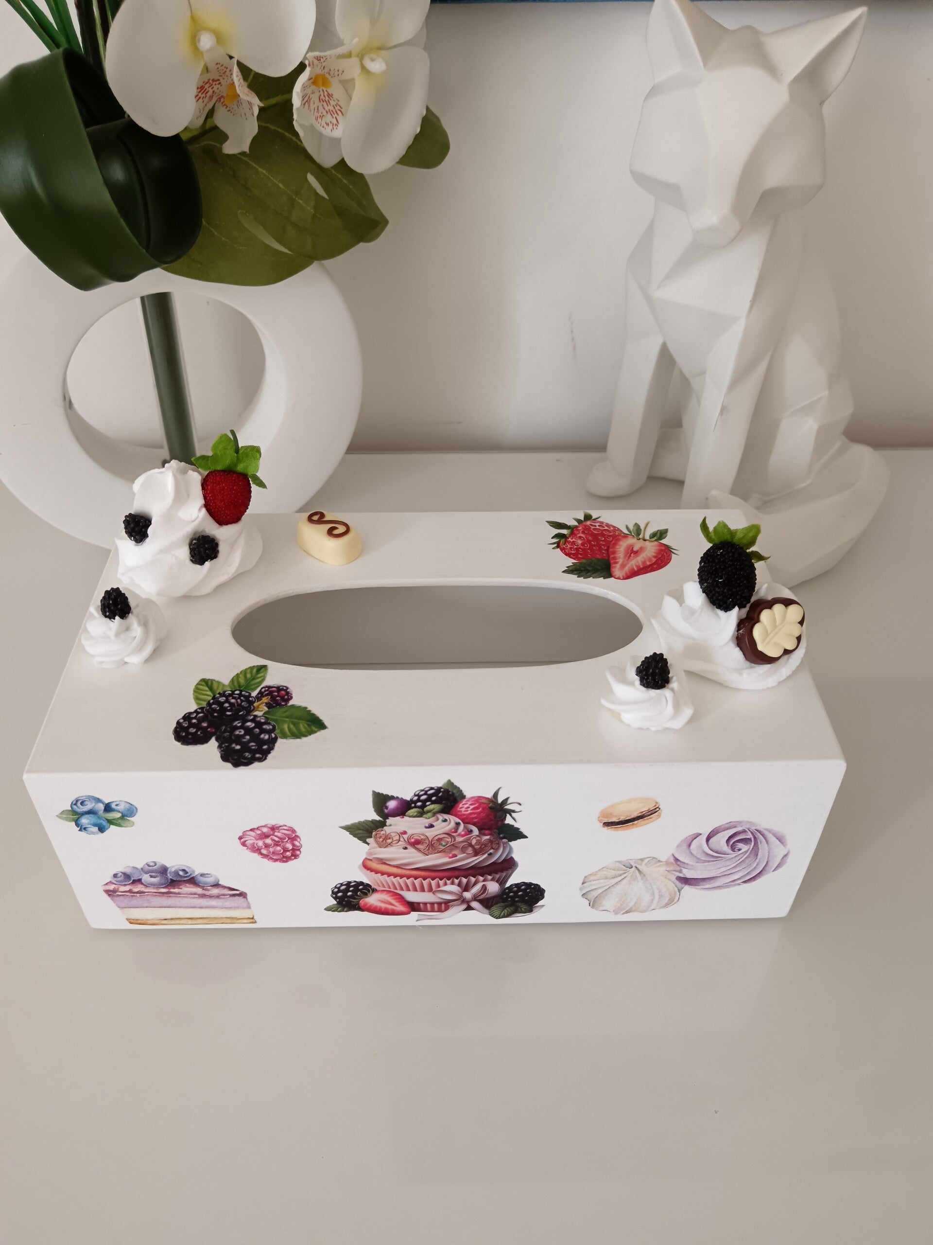 Apportez une touche sucrée à votre intérieur avec cette magnifique boîte à mouchoirs en bois, décorée à la main avec la technique du serviettage. Ornée de fruits, pâtisseries et chantilly en relief, elle séduit par son originalité et ses détails ultras réalistes.