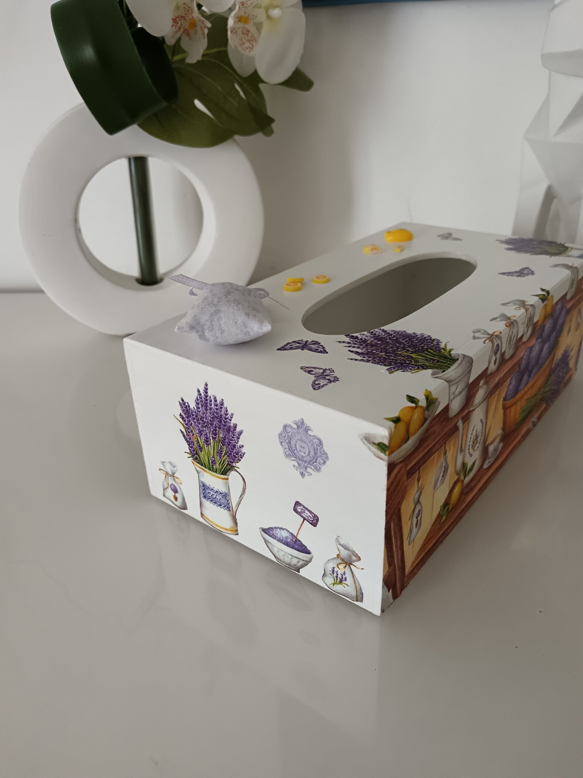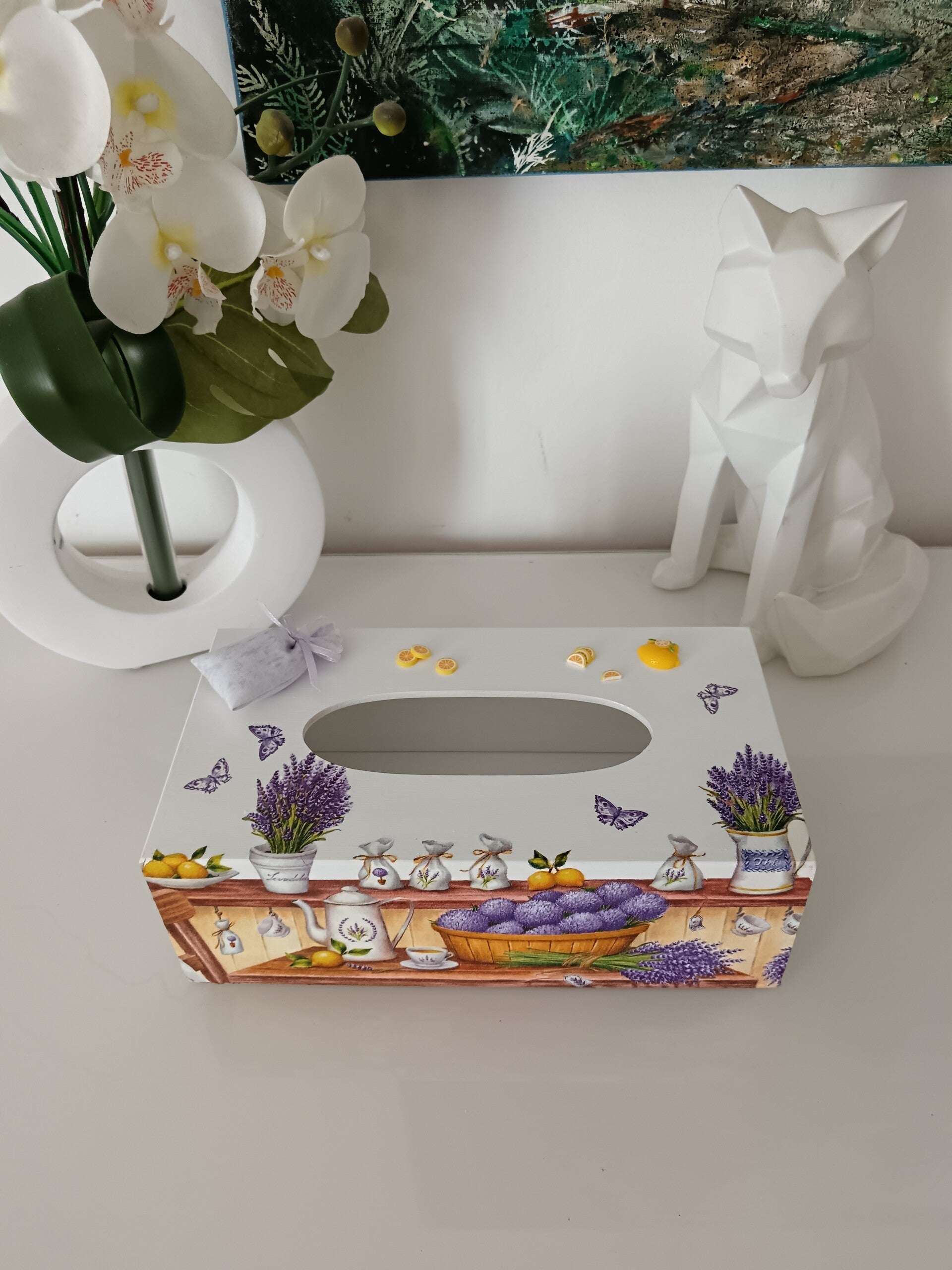 Apportez une touche d’élégance à votre intérieur avec cette boîte à mouchoirs en bois décorée à la main en serviettage. Lavande, citrons et petits détails champêtres créent une ambiance douce et chaleureuse. Idéale pour sublimer salon, salle de bain ou chambre avec style ! Elle est protégée par plusieurs couches de vernis. Création unique et artisanale.
