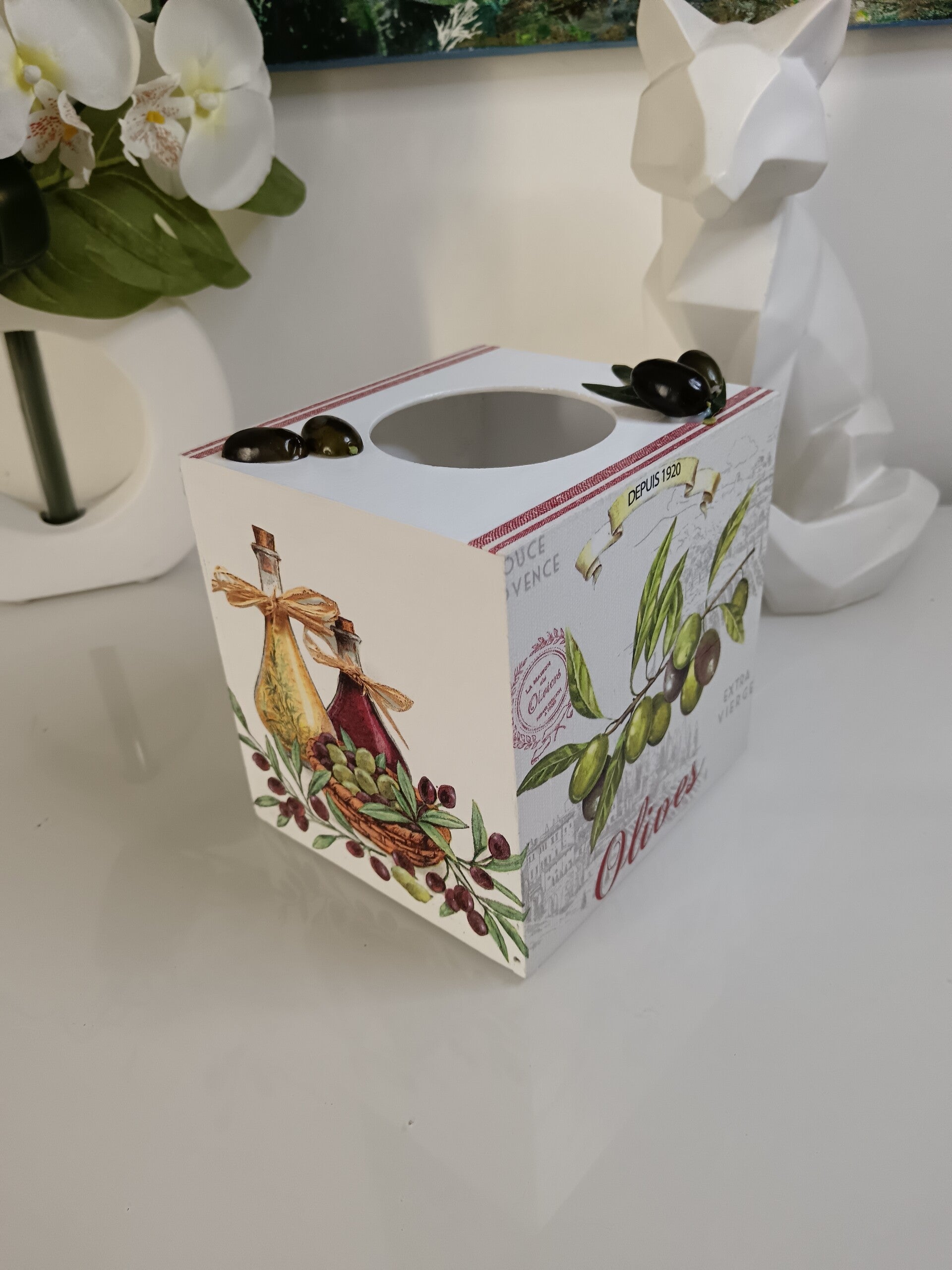 Apportez une touche méditerranéenne à votre intérieur avec cette élégante boîte à mouchoirs en bois, décorée à la main avec la technique du serviettage. Ornée de motifs d’olives et de bouteilles d’huile, elle est sublimée par des olives et feuillages en relief pour un rendu authentique et raffiné. Pratique et décorative, elle s'intègre parfaitement dans une cuisine, un salon ou une salle de bain au style provençal ou champêtre. Protégée par plusieurs couches de vernis. Pièce unique, idéale pour un cadeau original !