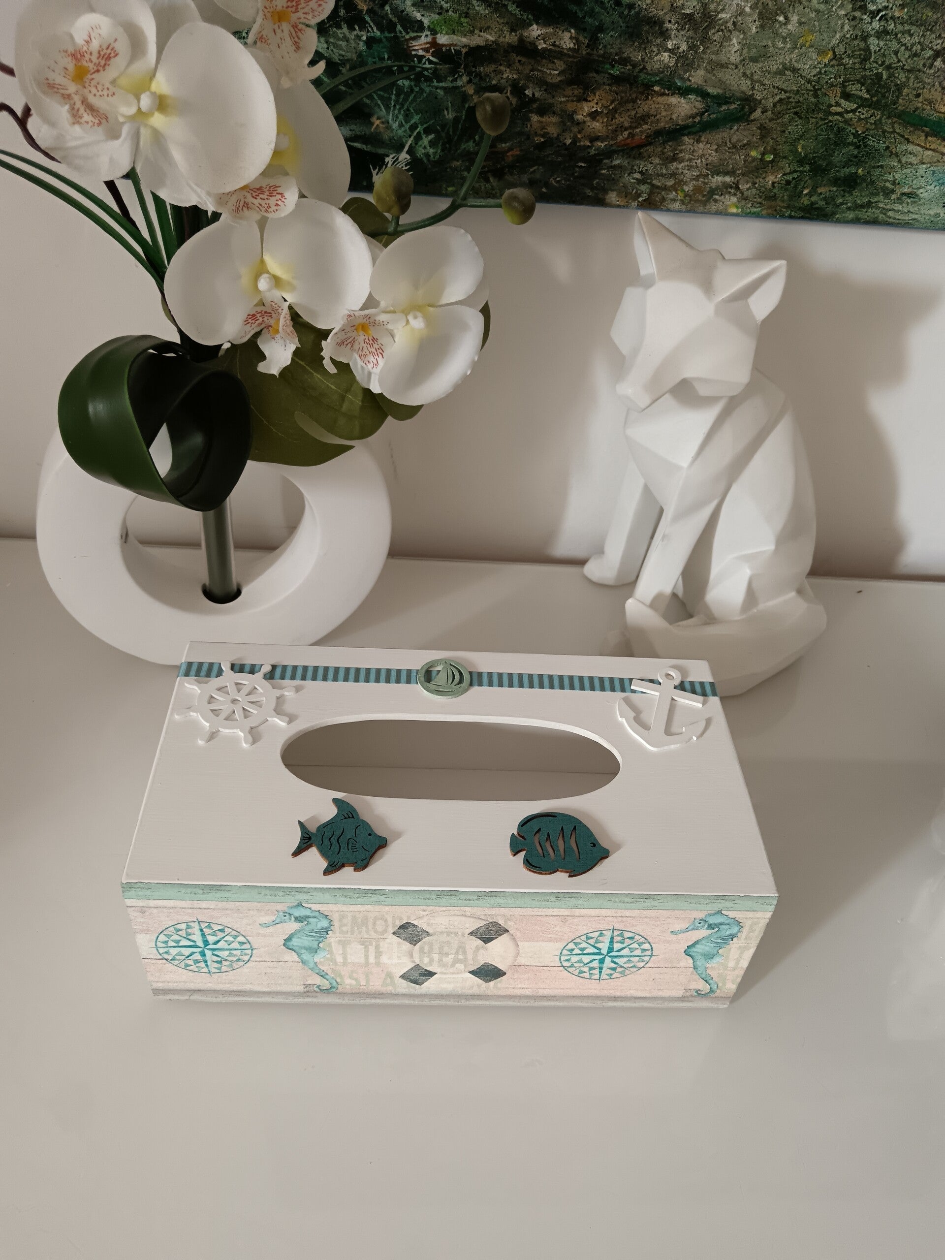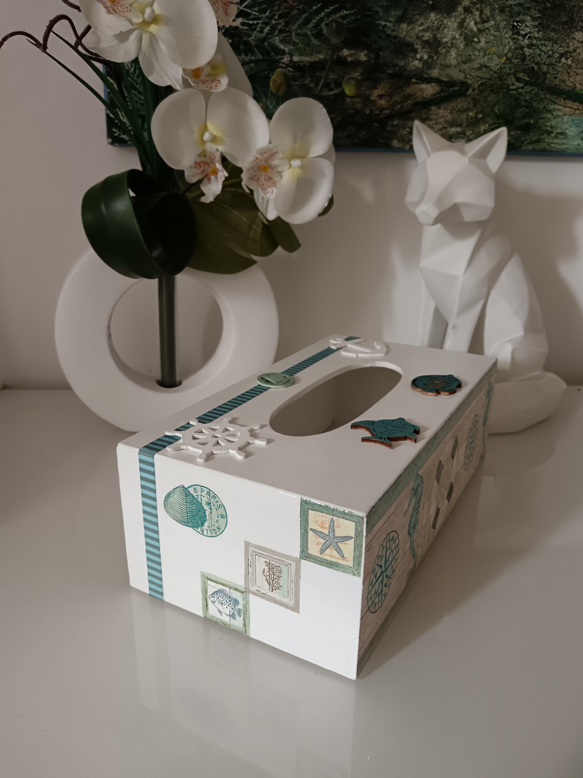 Apportez une touche marine à votre intérieur avec cette élégante boîte à mouchoirs en bois, décorée à la main avec soin grâce à la technique du serviettage. Son design aux motifs nautiques, poissons, ancres, étoiles de mer et boussoles, évoque les vacances au bord de l’eau et crée une ambiance douce et apaisante. Chaque détail a été pensé pour allier praticité et décoration, faisant de cette boîte un véritable objet de charme. Parfaite pour une salle de bain, un salon ou une maison de bord de mer. Pièce artisanale unique !