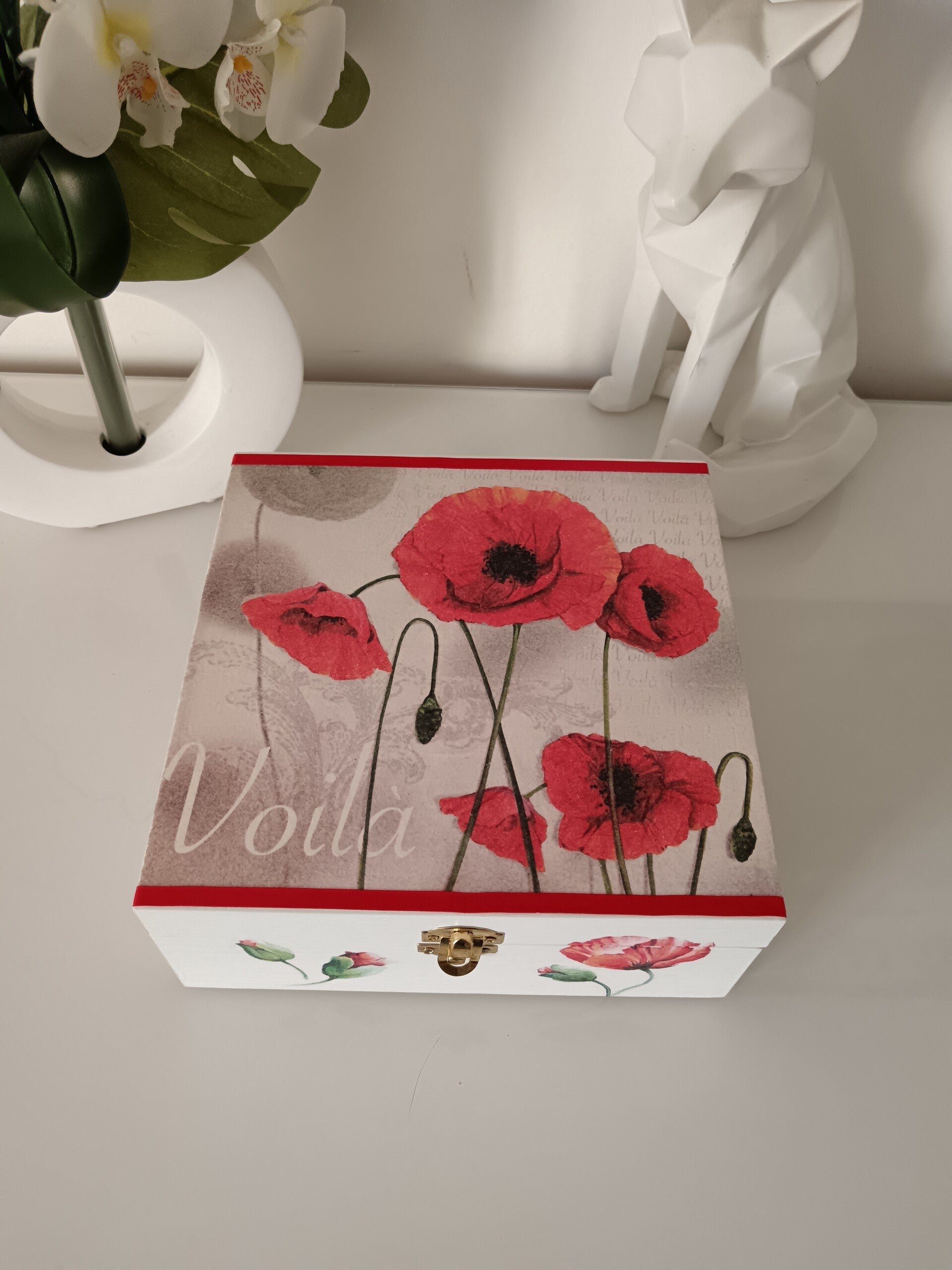 Offrez-vous cette élégante boîte en bois entièrement décorée à la main. Réalisée avec soin grâce à la technique du serviettage, elle est ornée de magnifiques coquelicots aux couleurs vives qui apportent une touche de fraîcheur et de raffinement. Intérieur compartimenté idéal pour organiser sachets de thé, bijoux, petits accessoires ou souvenirs.