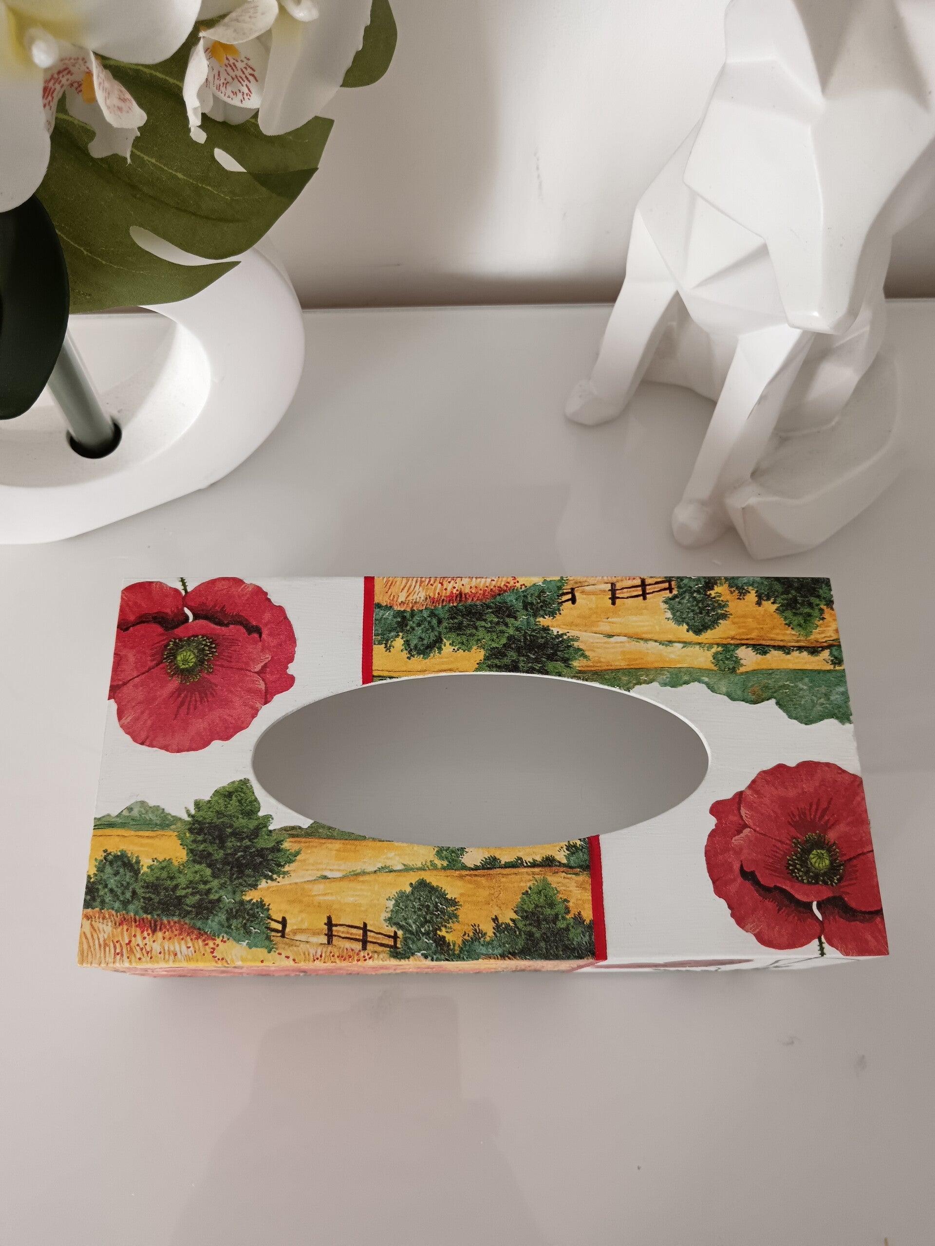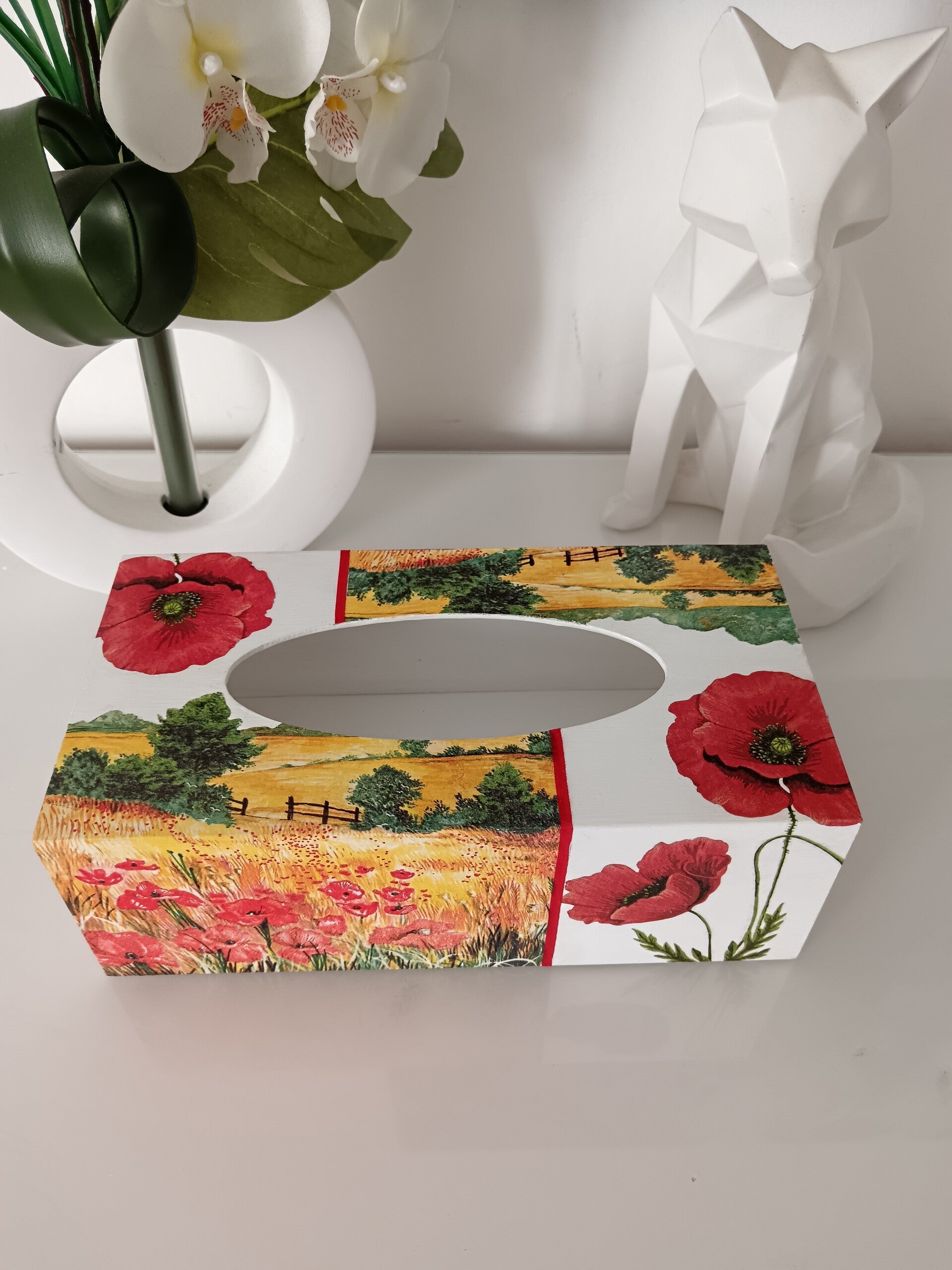 Transformez un objet du quotidien en décoration raffinée ! Cette boîte à mouchoirs en bois, décorée à la main avec la technique du serviettage, apporte fraîcheur et élégance à votre intérieur. Son décor champêtre de coquelicots et son joli nœud satiné en font une pièce unique et pleine de charme.