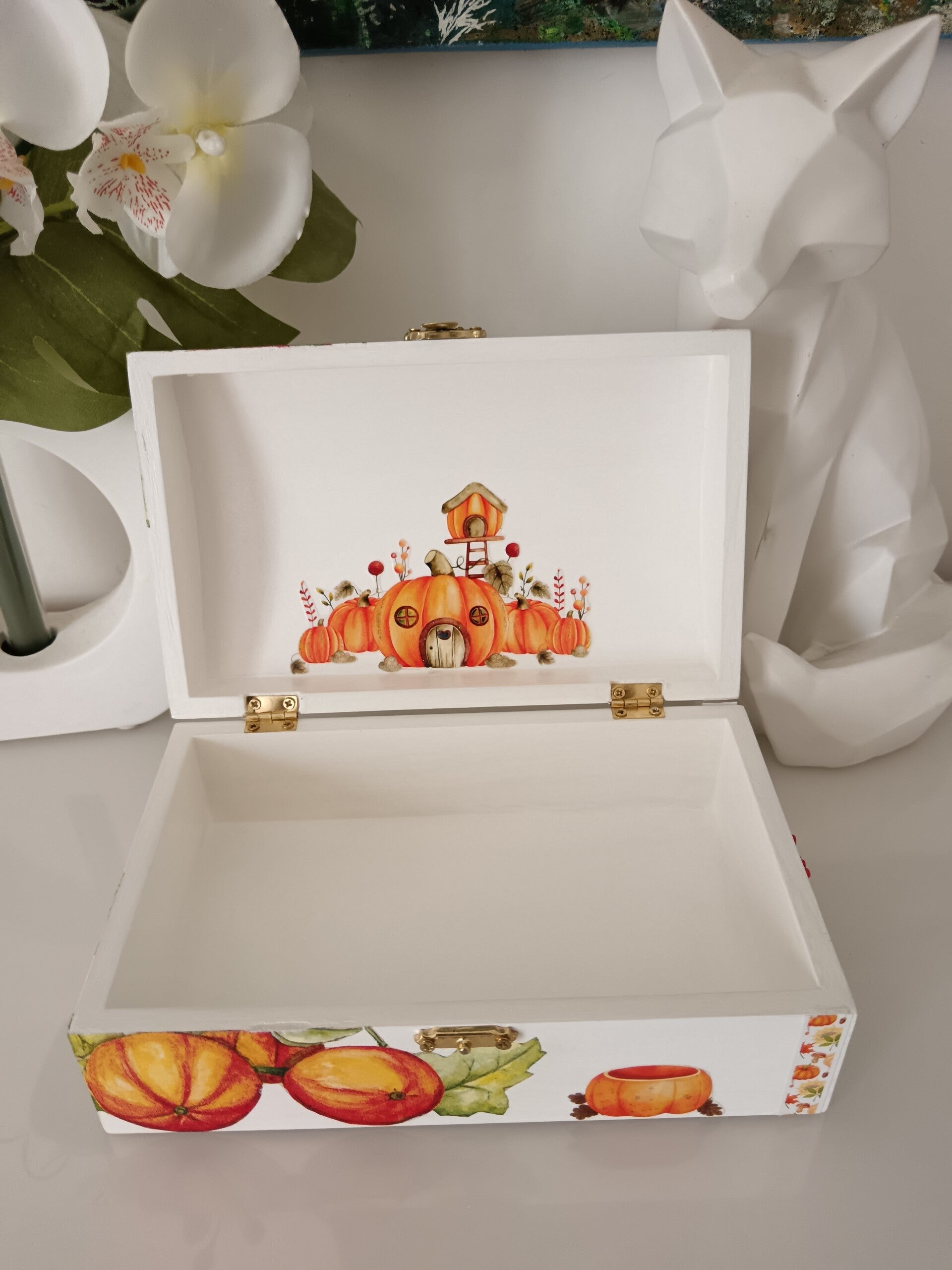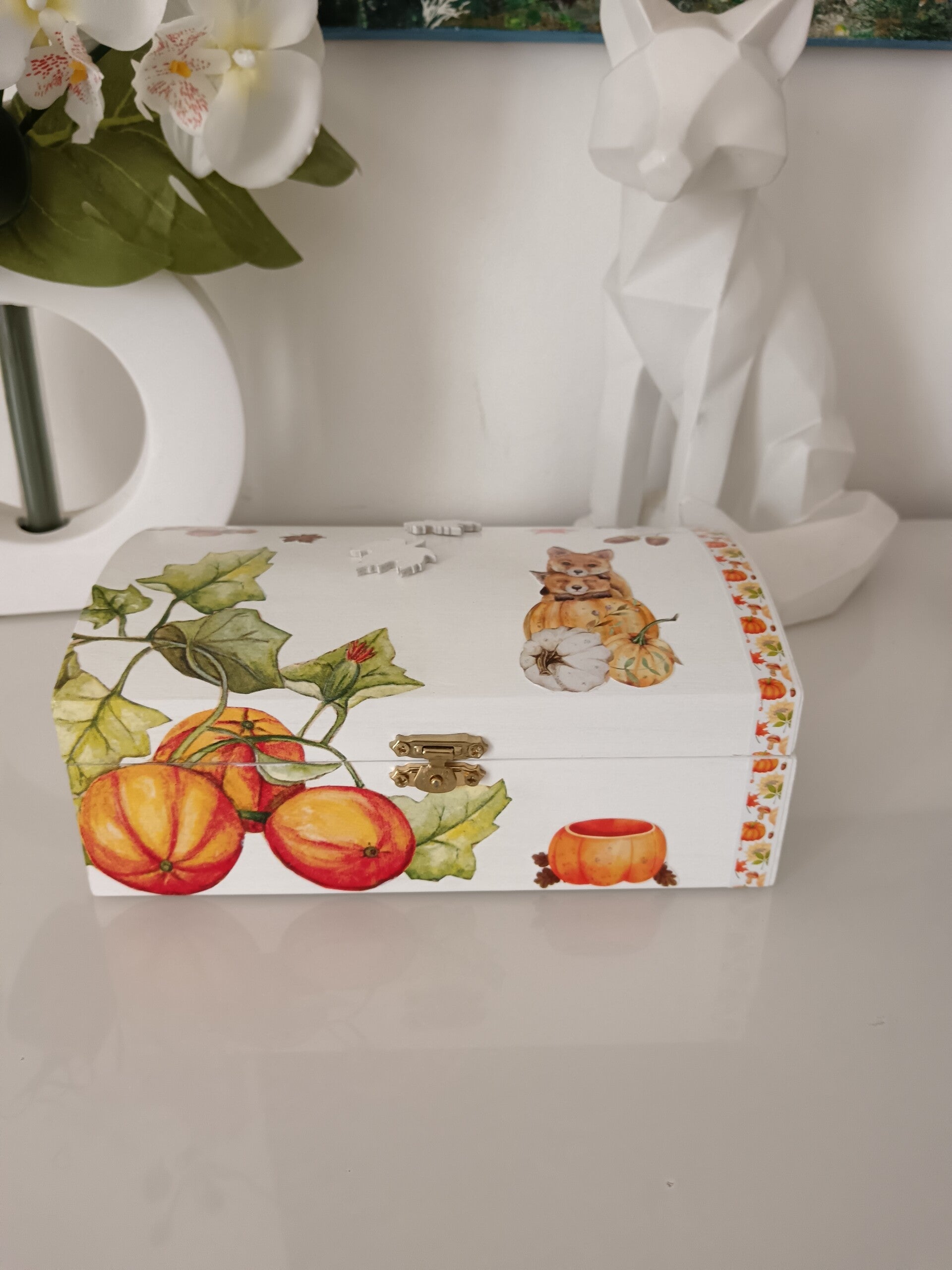 Apportez une touche chaleureuse et unique à votre intérieur avec ce joli coffret en bois décoré à la main grâce à la technique du serviettage. Orné de motifs automnaux: renards, citrouilles, feuilles et champignons, il est parfait pour ranger vos petits trésors ou offrir un cadeau original et artisanal. Protégé par plusieurs couches de vernis.