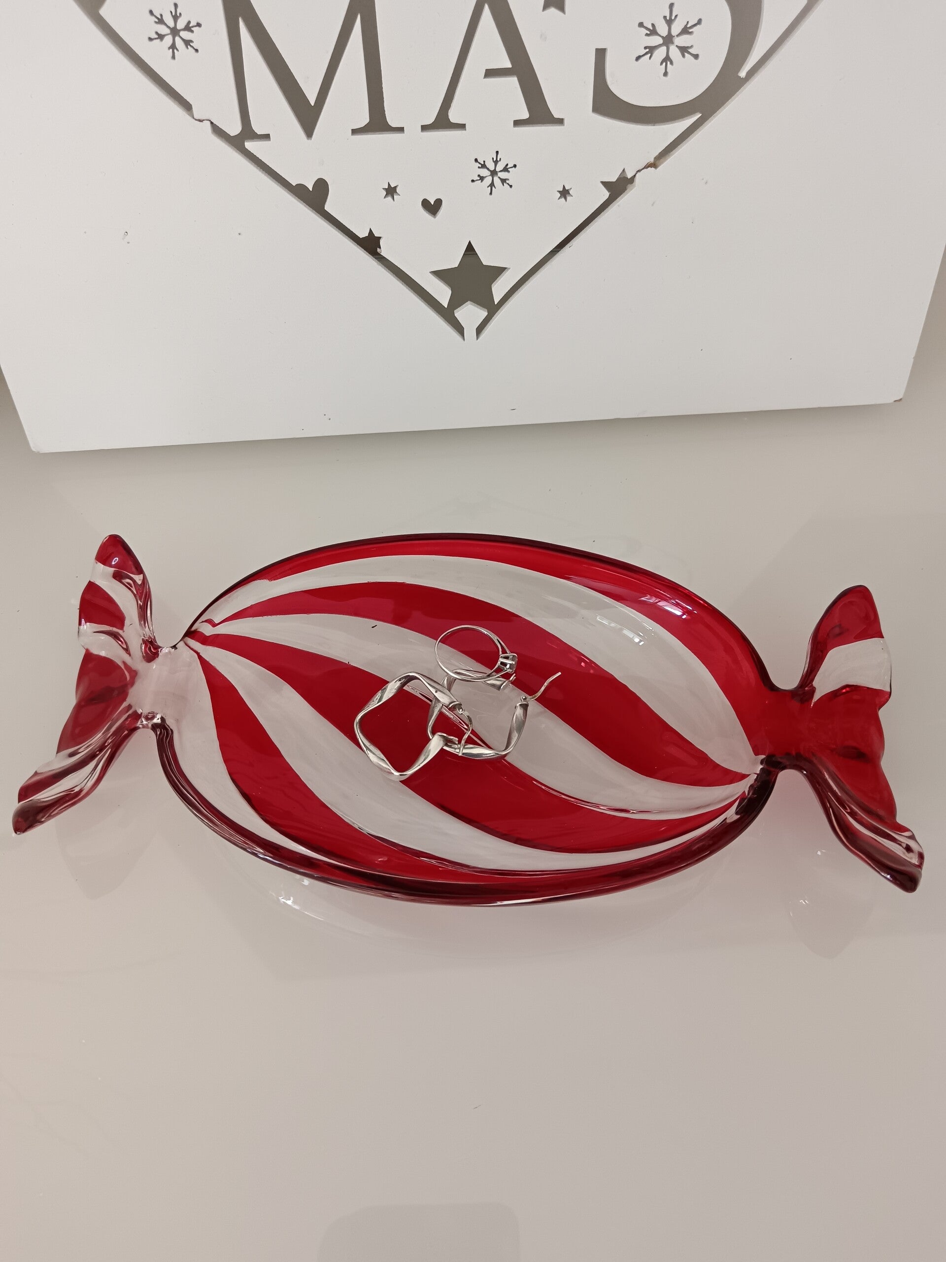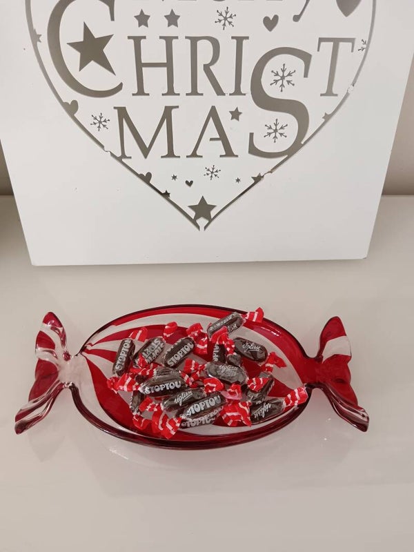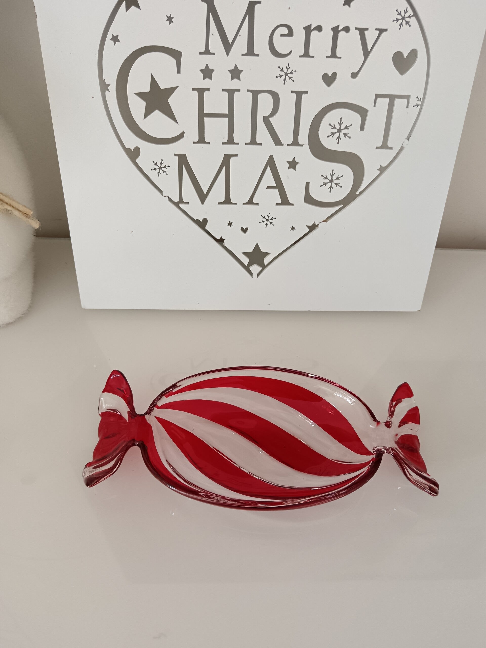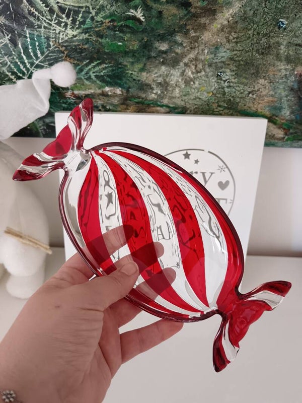 Apportez une touche gourmande et élégante à votre intérieur avec cette superbe coupelle en verre en forme de bonbon. Son design original, mêlant transparence et bandes rouges torsadées, évoque les célèbres sucreries d’antan tout en ajoutant une note festive et raffinée à votre décoration.