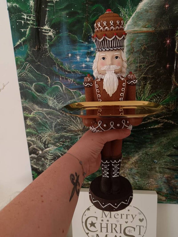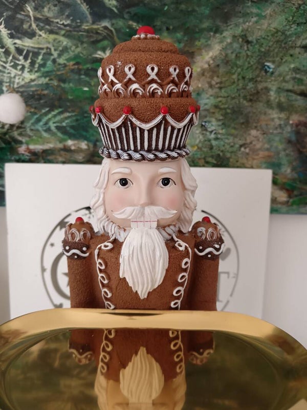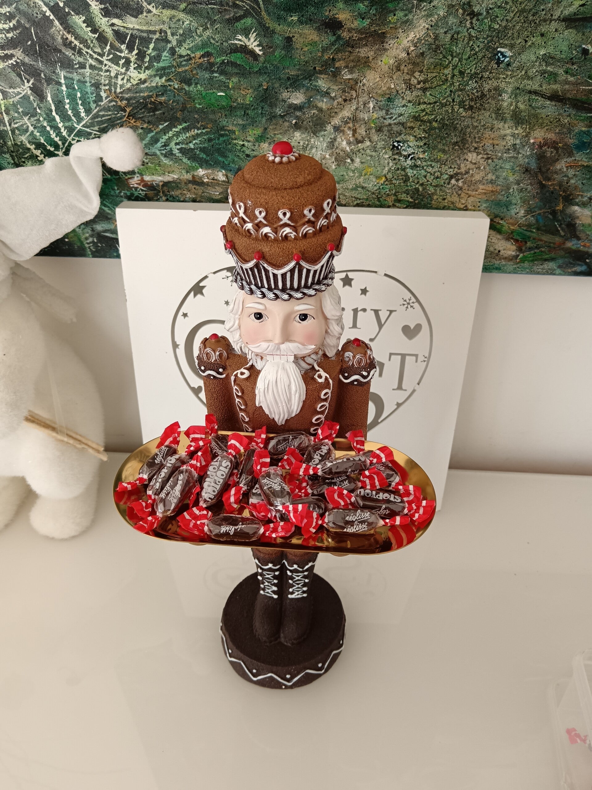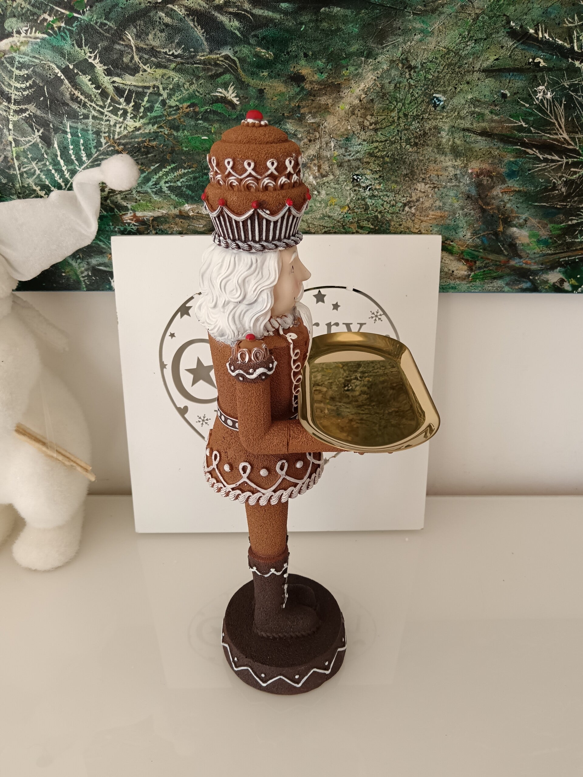 Apportez une ambiance féérique et gourmande à vos fêtes avec ce grand casse-noisette au style pain d’épices, tenant un plateau doré. Alliant tradition et originalité, il revisite le célèbre personnage de Noël dans une version chocolatée et sucrée qui émerveillera petits et grands.