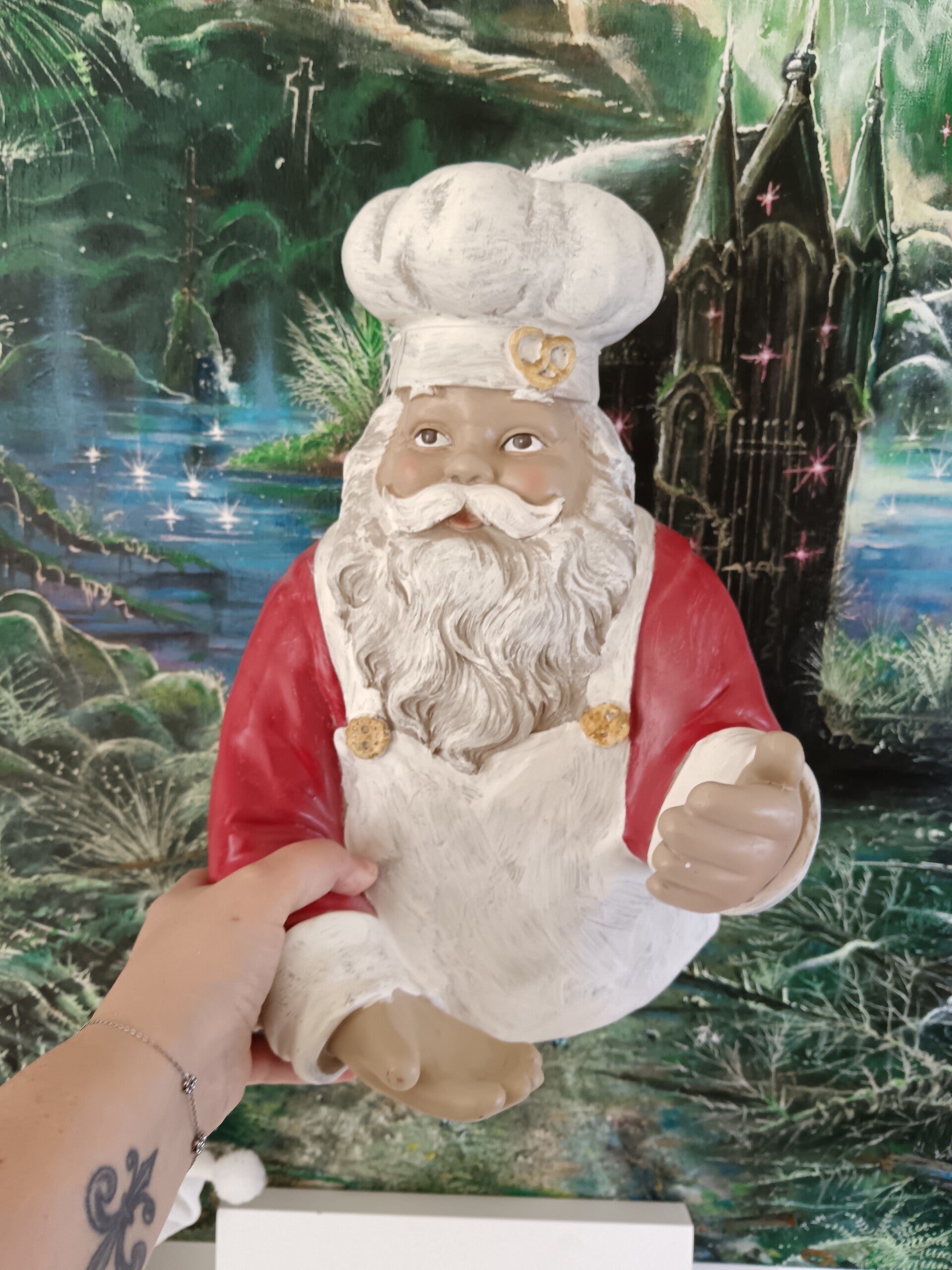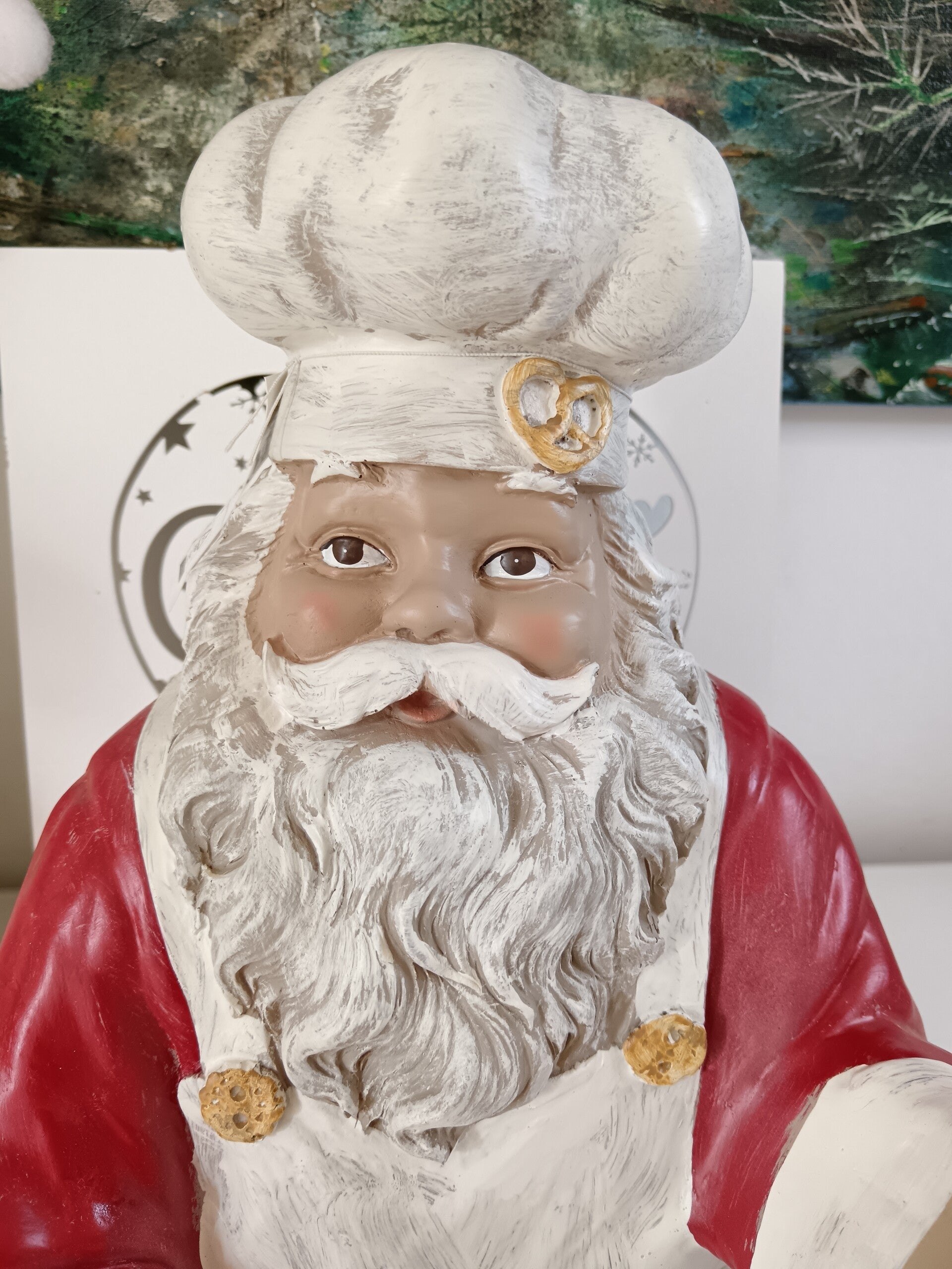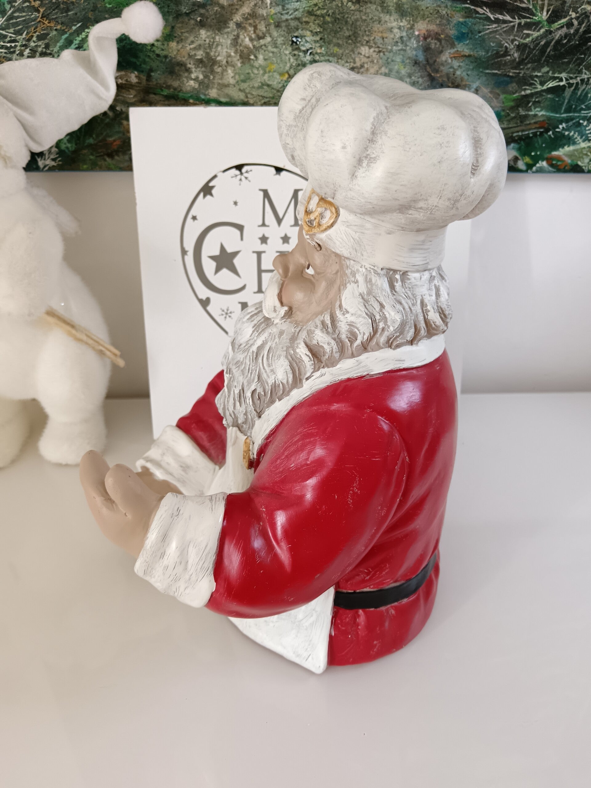 Ce joyeux Santa, vêtu de son habit rouge et coiffé d’une toque de chef, tient fièrement une bouteille de vin, prêt à régaler vos convives. Idéal pour habiller votre table de Noël, décorer votre bar ou offrir en cadeau à un amateur de vin et de belles décorations.