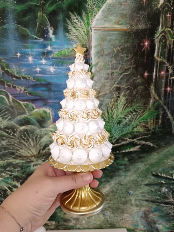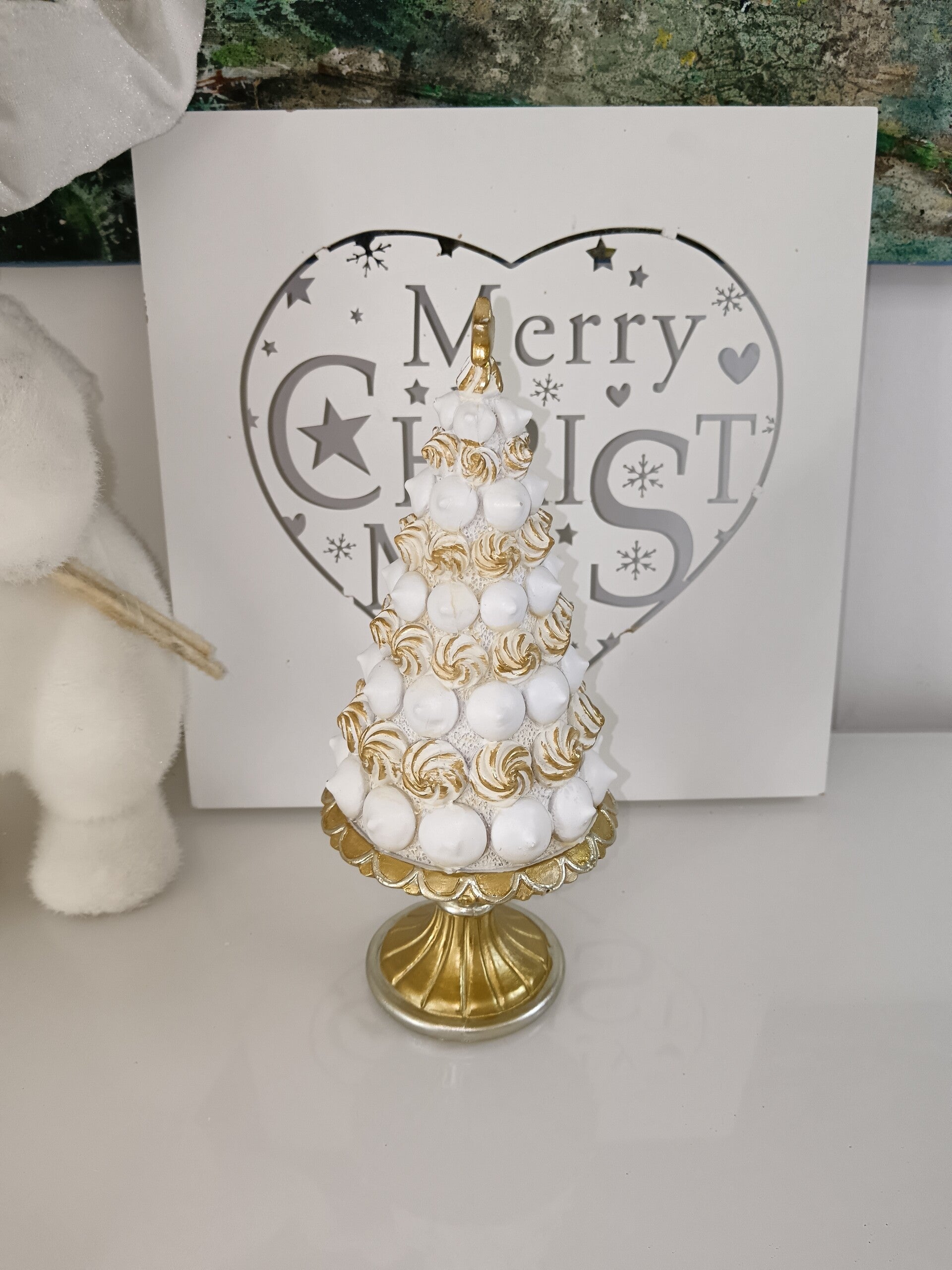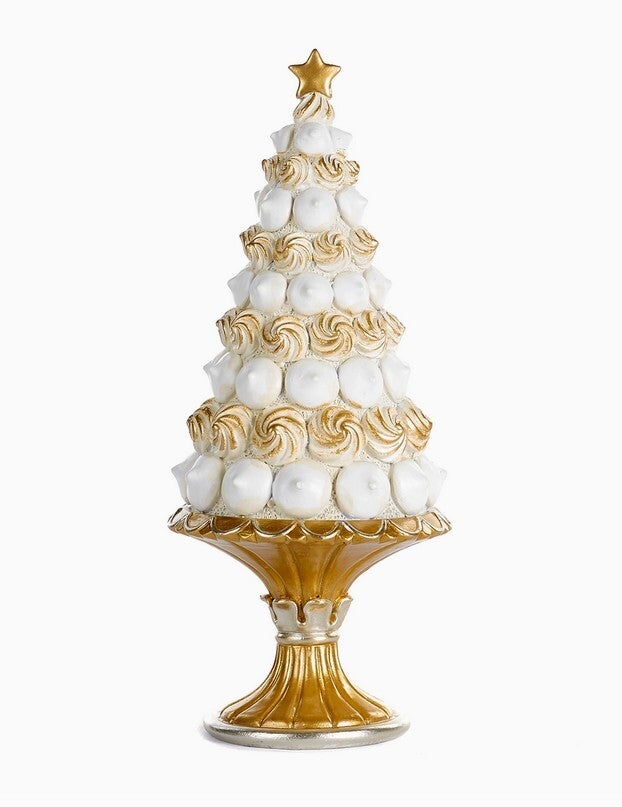 Éblouissez vos fêtes de fin d’année avec cette somptueuse décoration en forme de sapin gourmand, signée Goodwill. Présenté comme une pièce montée de choux et meringues délicatement glacés, ce sapin trône fièrement sur un élégant socle doré, surmonté d’une étoile brillante. Un objet raffiné qui mêle gourmandise et féérie, idéal pour sublimer votre table de fête, une vitrine ou un intérieur élégant. En polyrésine.