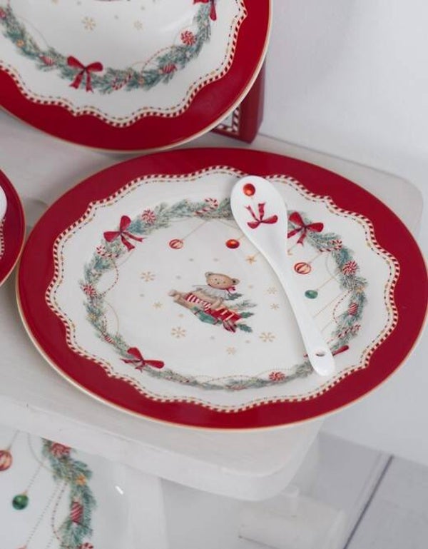 Apportez une touche de magie à votre table de fête avec cette superbe assiette à dessert. Son design délicatement rétro met en scène un adorable ourson entouré d’une couronne de houx, de rubans rouges et de décorations festives, le tout bordé d’un élégant liseré rouge et doré.