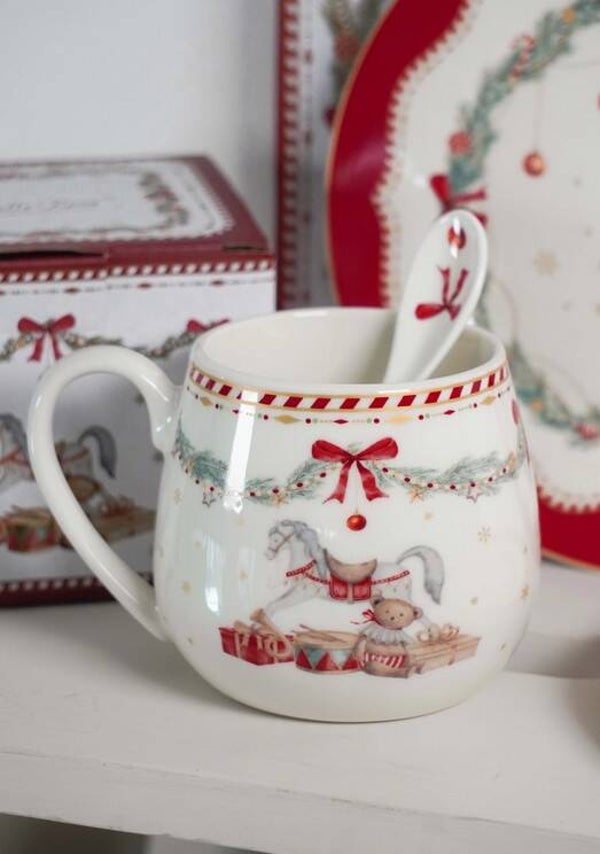 Savourez vos boissons chaudes dans une ambiance féerique avec ce magnifique mug "Cheval à bascule" signé Isabelle Rose. Son design délicat met en scène un adorable cheval à bascule entouré de jouets et de guirlandes, rappelant les Noëls d’enfance. Le bord rouge et blanc façon sucre d’orge ajoute une touche festive et gourmande à ce mug de charme. Sa belle boîte en fera un cadeau parfait pour les collectionneurs.