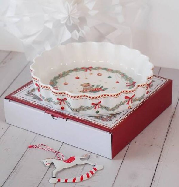 Son design délicatement festif présente une adorable scène d’ours entouré de guirlandes, de rubans rouges et de boules de Noël. Les bords ondulés et les finitions raffinées aux accents rouge et or ajoutent une élégance intemporelle.
