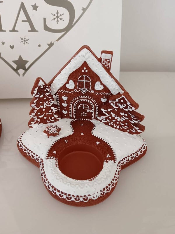Créez une atmosphère chaleureuse et féerique avec ce bougeoir en forme de maison pain d’épices. Détails délicats, glaçage blanc effet neige, sapins enneigés : chaque élément évoque la douce magie de Noël. Placez une bougie chauffe-plat au centre et laissez la lumière danser pour un effet cocooning irrésistible. Parfait pour décorer votre table, rebord de fenêtre ou cheminée, il ajoute une touche gourmande et enchantée à votre intérieur. En polyrésine.