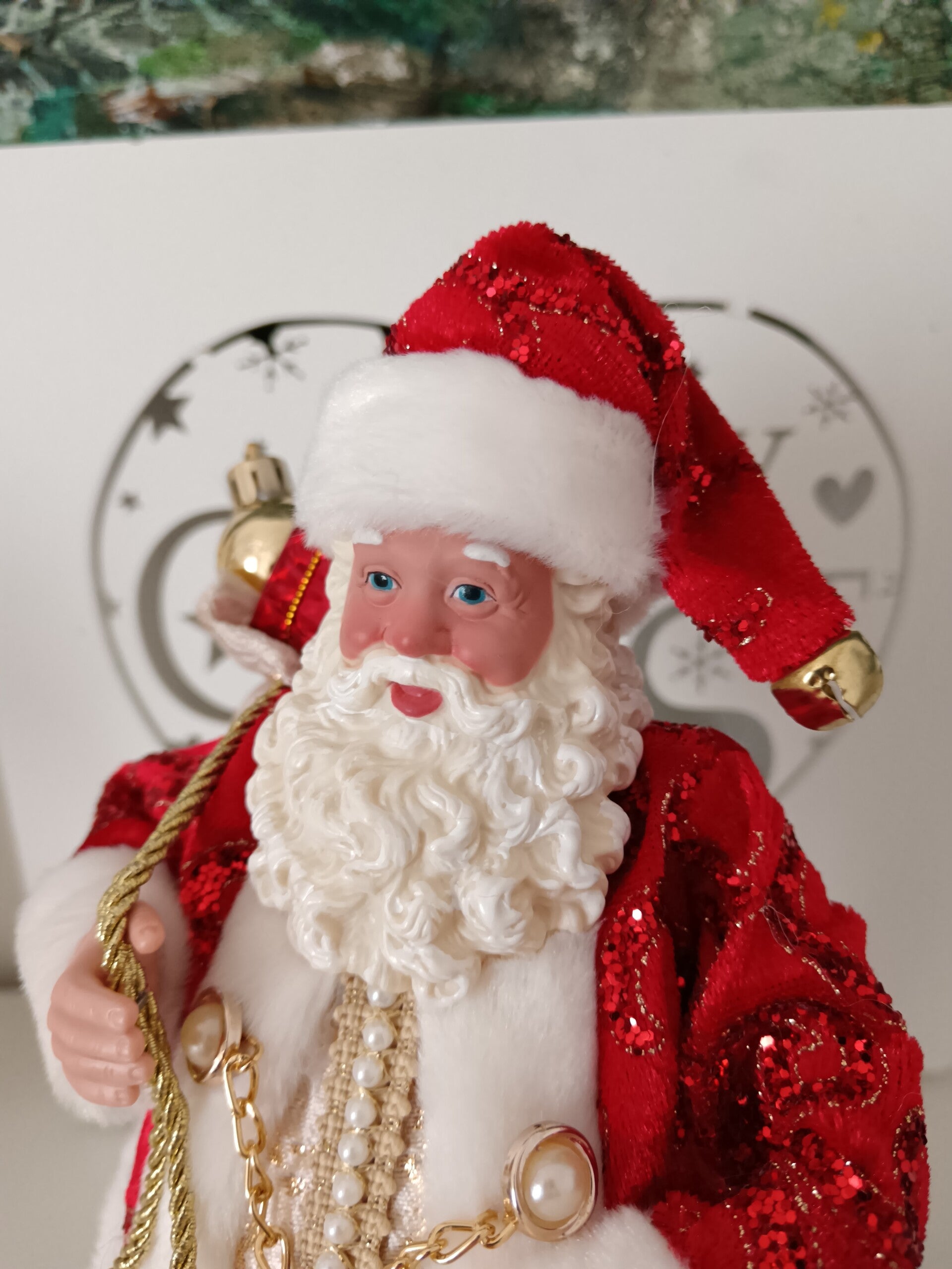Sublimez votre décoration de Noël avec ce somptueux Père Noël vêtu de rouge et d’or. Avec son sac rempli de cadeaux scintillants et ses finitions raffinées, il apporte une touche d’élégance et de féérie à votre intérieur. Idéal pour une déco traditionnelle et chaleureuse ! En polyuréthane et tissu.