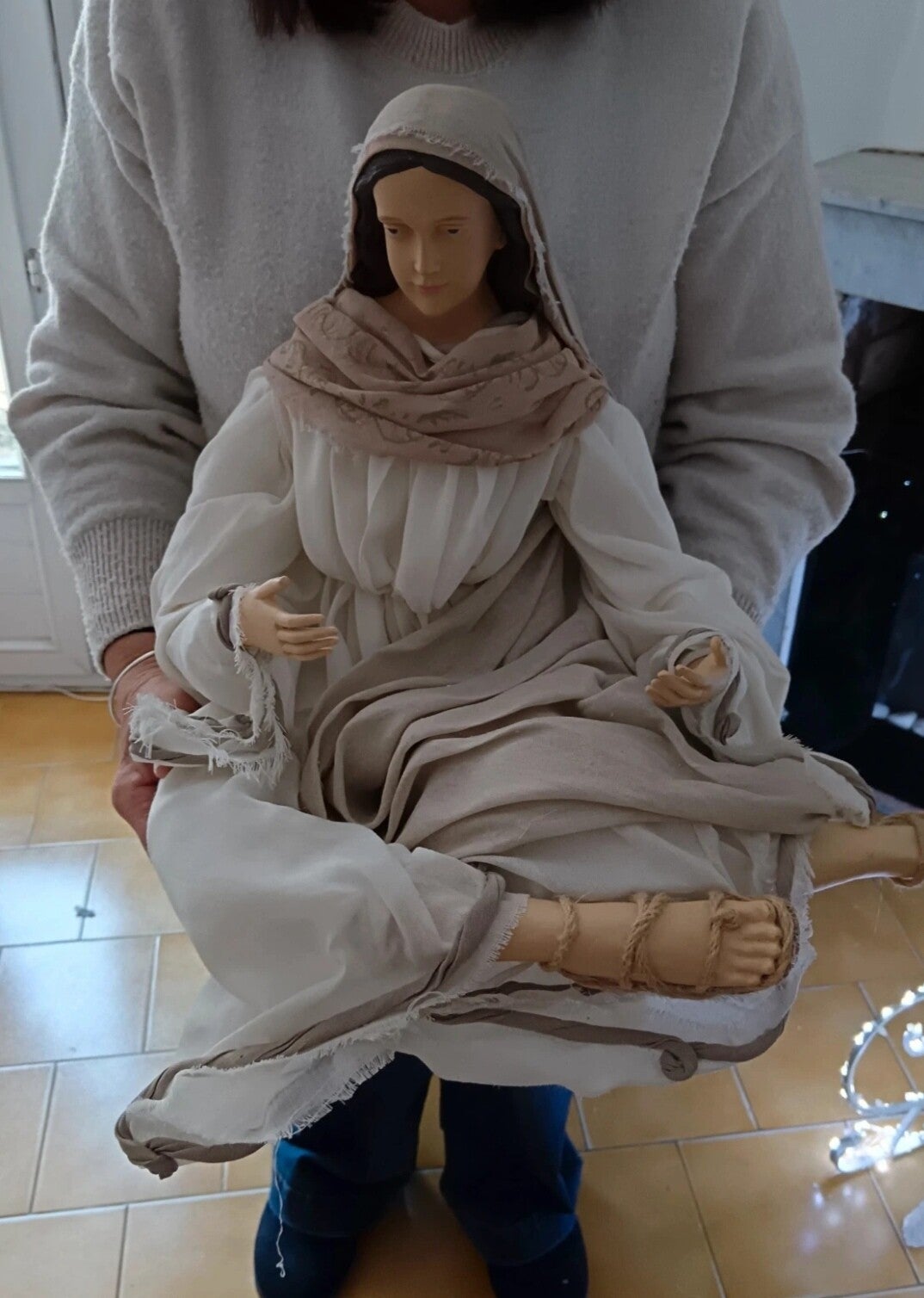 Style doux et réaliste, avec vêtements en tissu et détails soignés. En résine, travaillée et peinte à la main. Parfaite pour une décoration chaleureuse et spirituelle pendant les fêtes.