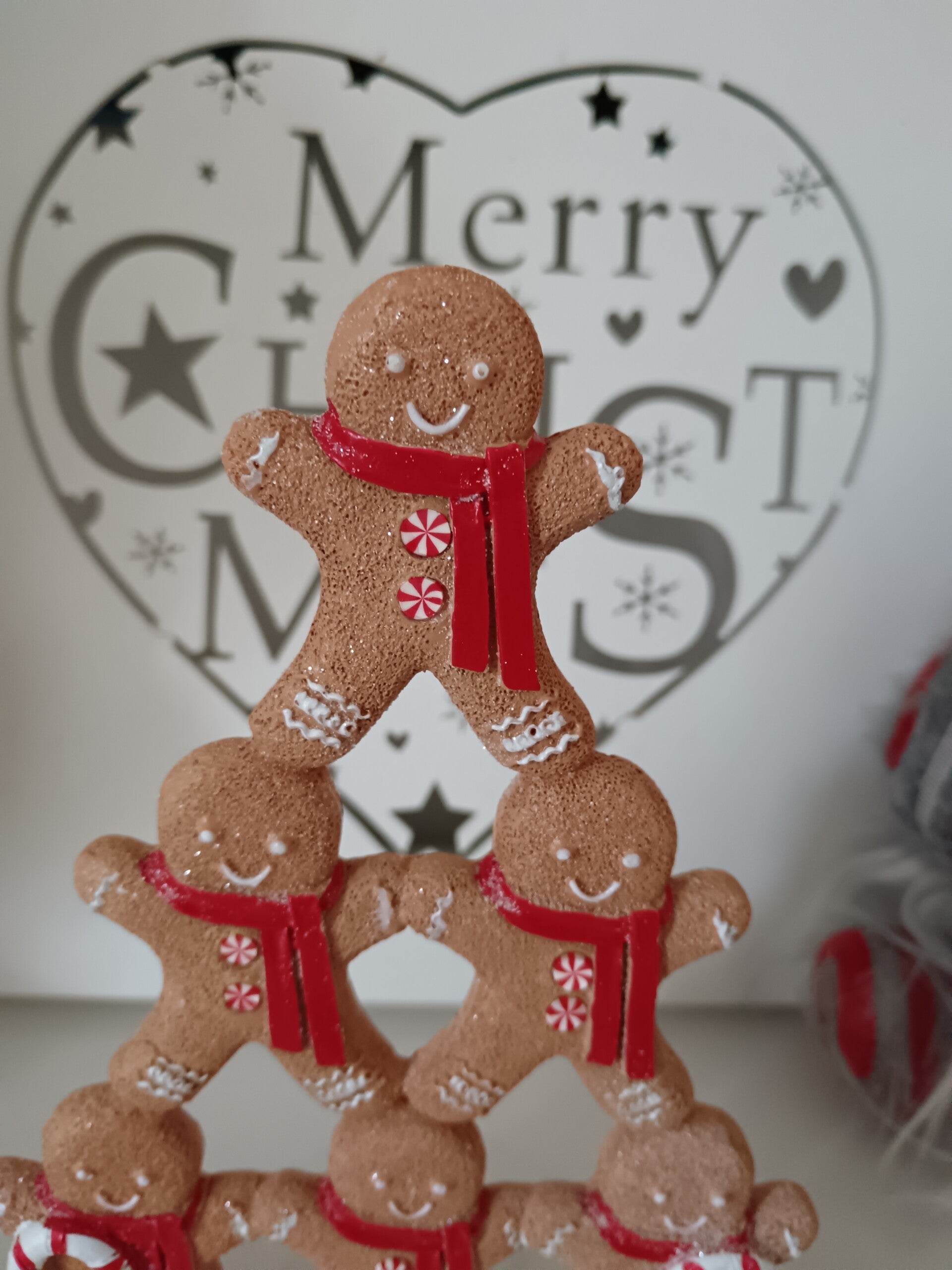 Décoration de Noël en forme de pyramide composée de bonshommes en pain d’épices souriants, ornés d’écharpes rouges et de sucres d’orge. Posée sur un socle effet neige, elle apporte une touche chaleureuse et festive à votre intérieur. Idéale pour une décoration de table, d’étagère ou de buffet pendant les fêtes. En polyrésine.