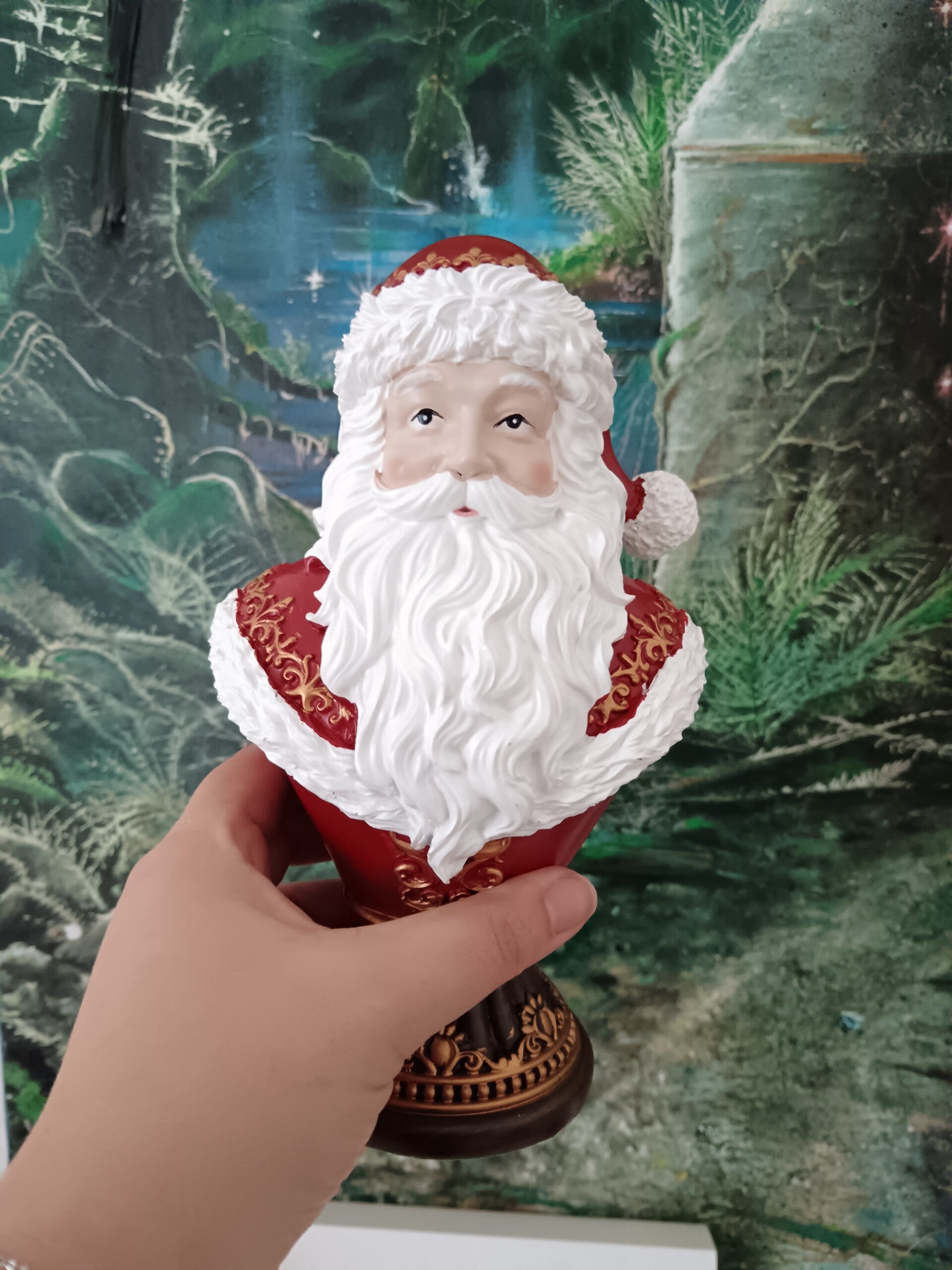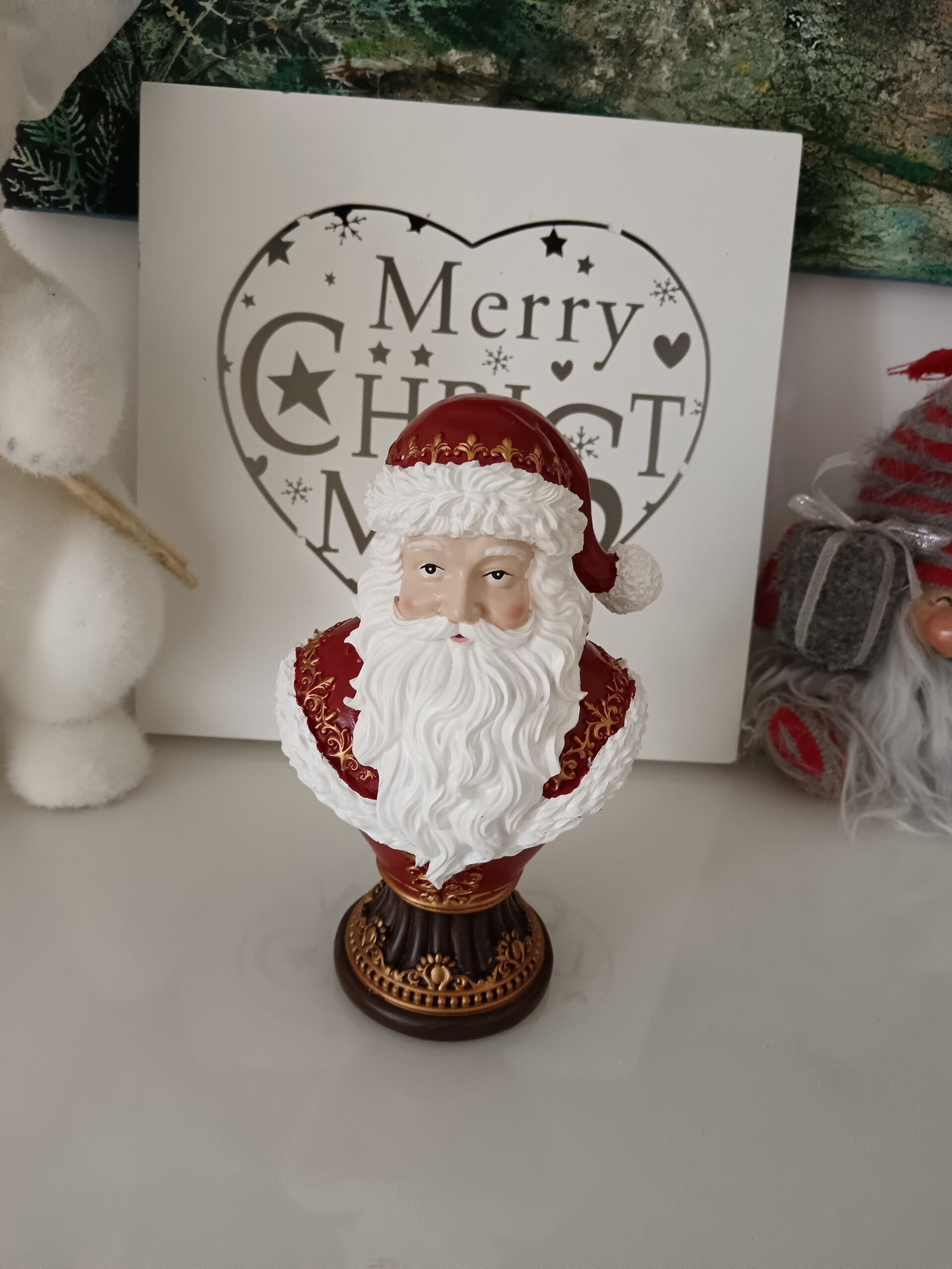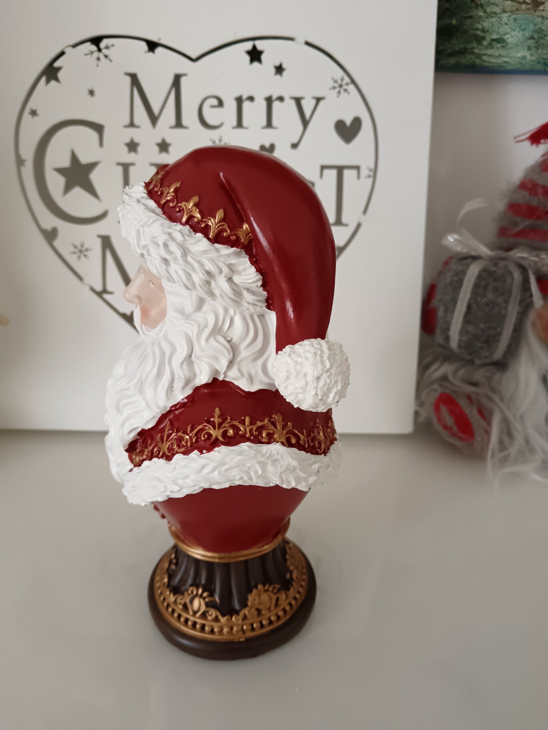 Buste décoratif du Père Noël en résine, finement détaillé avec finitions rouge et or. Élégant et intemporel, il apporte une touche chic et traditionnelle à votre décoration de Noël, parfait sur un meuble ou une table de fête. En polyrésine.