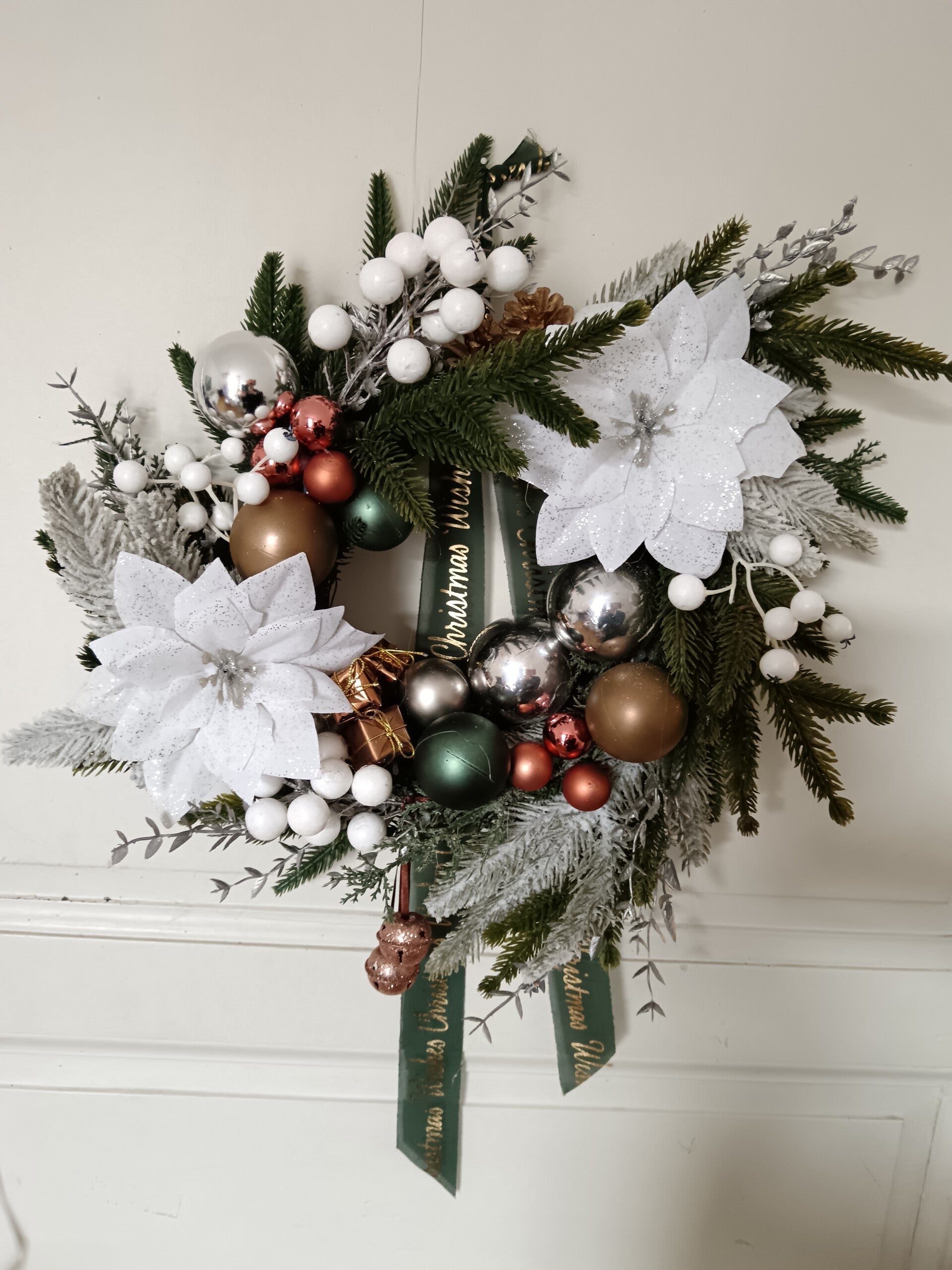 Couronne de Noël artisanale, élégante et raffinée, composée de feuillages hivernaux, de baies blanches, de boules aux tons vert, doré et cuivré, et de fleurs blanches scintillantes. Une création faite main qui apporte une touche chaleureuse et festive à votre décoration. Création unique.