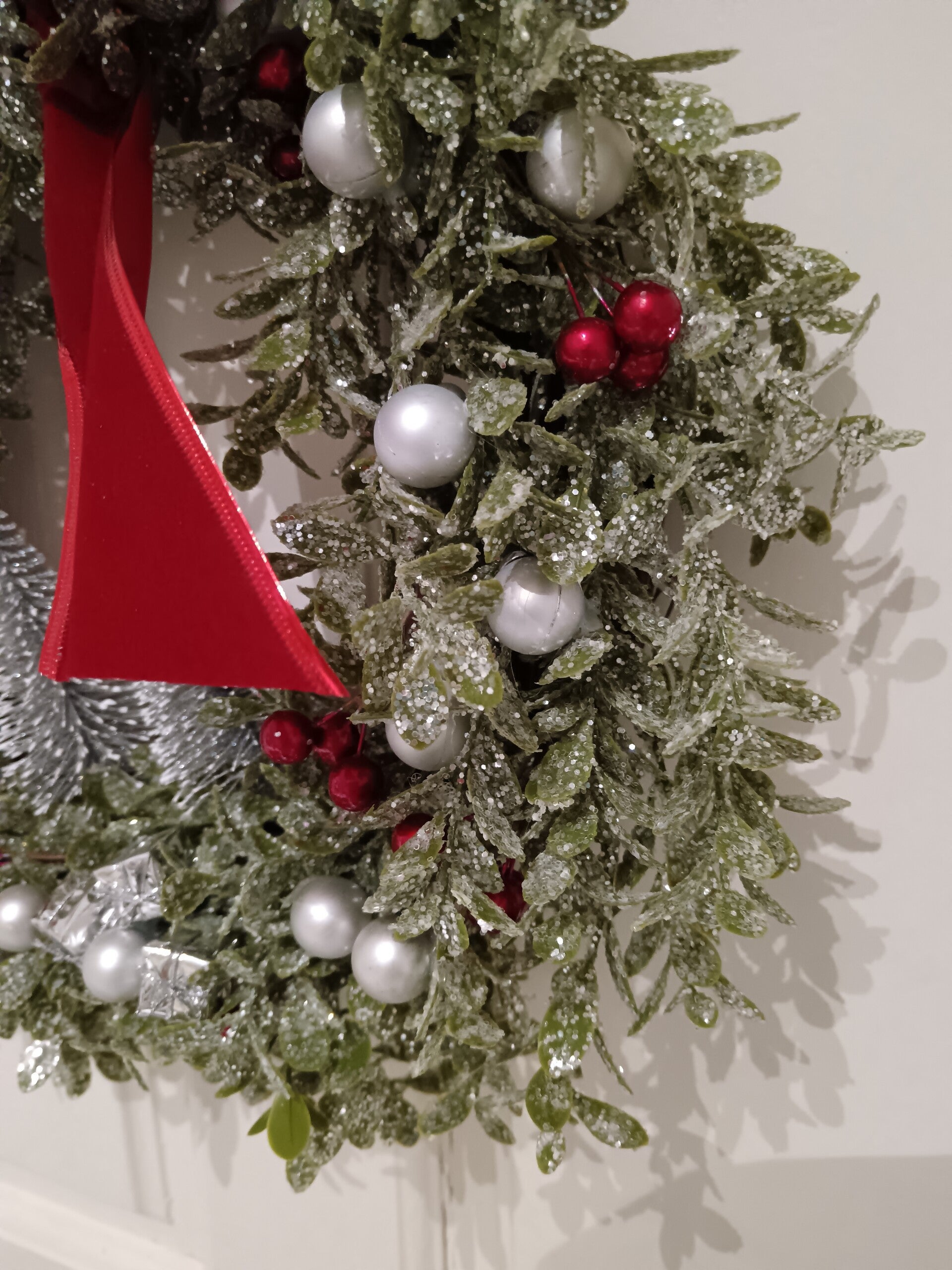 Couronne de Noël décorée à la main au style traditionnel et chaleureux. Son feuillage givré est sublimé par un large nœud rouge satiné, des baies festives, des boules élégantes et de délicats sapins argentés au centre. Parfaite pour habiller une porte ou un mur et créer une ambiance de Noël chic et authentique. Création unique.