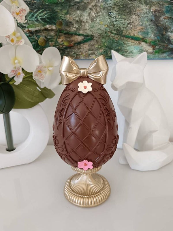 Un élégant œuf de Pâques imitation chocolat, délicatement décoré de fleurs printanières et surmonté d’un nœud doré, renfermant un adorable lapin. Une pièce raffinée et festive, idéale pour sublimer vos décorations de Pâques ou offrir un cadeau plein de charme. En polyrésine.