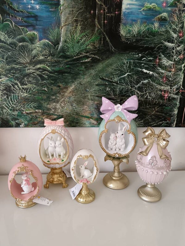 Œuf décoratif rose poudré au style baroque, richement orné de perles, de détails ciselés et d’un somptueux nœud doré. Une pièce élégante et délicate, parfaite pour une décoration de Pâques chic et raffinée. En polyrésine.