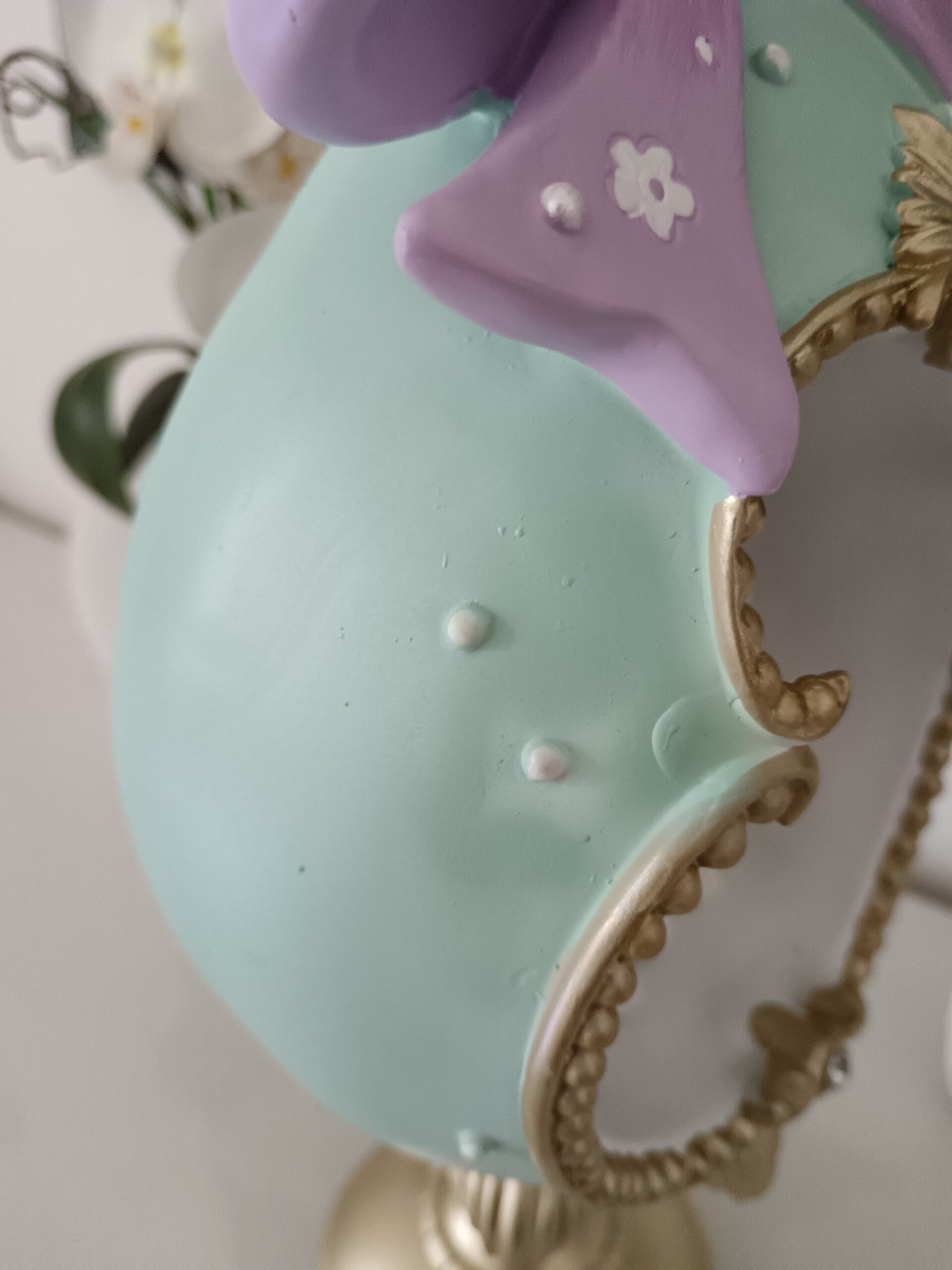 Œuf décoratif pastel sur pied doré, délicatement orné de deux adorables lapins. Ses teintes douces, son élégant nœud et ses finitions raffinées apportent une touche tendre et printanière à votre décoration. Idéal pour Pâques, une vitrine ou comme joli cadeau plein de charme. En polyrésine. Légers défauts de fabrication sur l'arrière.