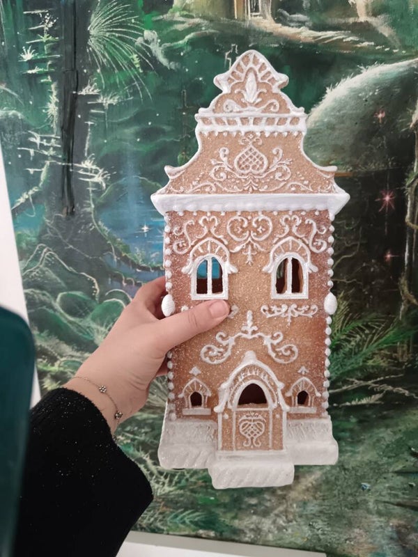 Maison décorative lumineuse au style féerique, finition pailletée et détails blancs délicatement travaillés. Éclairage LED chaud intégré pour une ambiance cosy et hivernale. Idéale pour décorer une étagère, un rebord de fenêtre ou une table pendant les fêtes. En polyrésine.