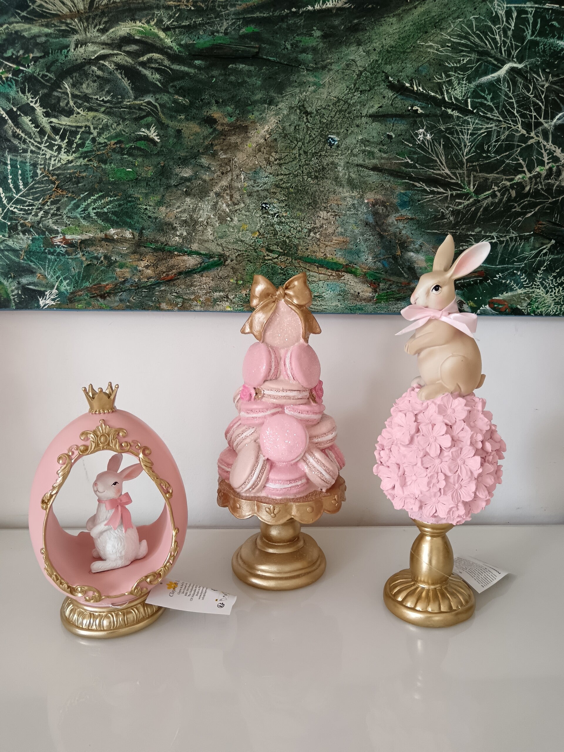 Lapin décoratif sur œuf fleuri, délicatement posé sur un socle doré. Son nœud rose et ses fleurs en relief apportent une touche de douceur et d’élégance à votre décoration. Une pièce raffinée, idéale pour sublimer une ambiance printanière ou une décoration de Pâques. En polyrésine.