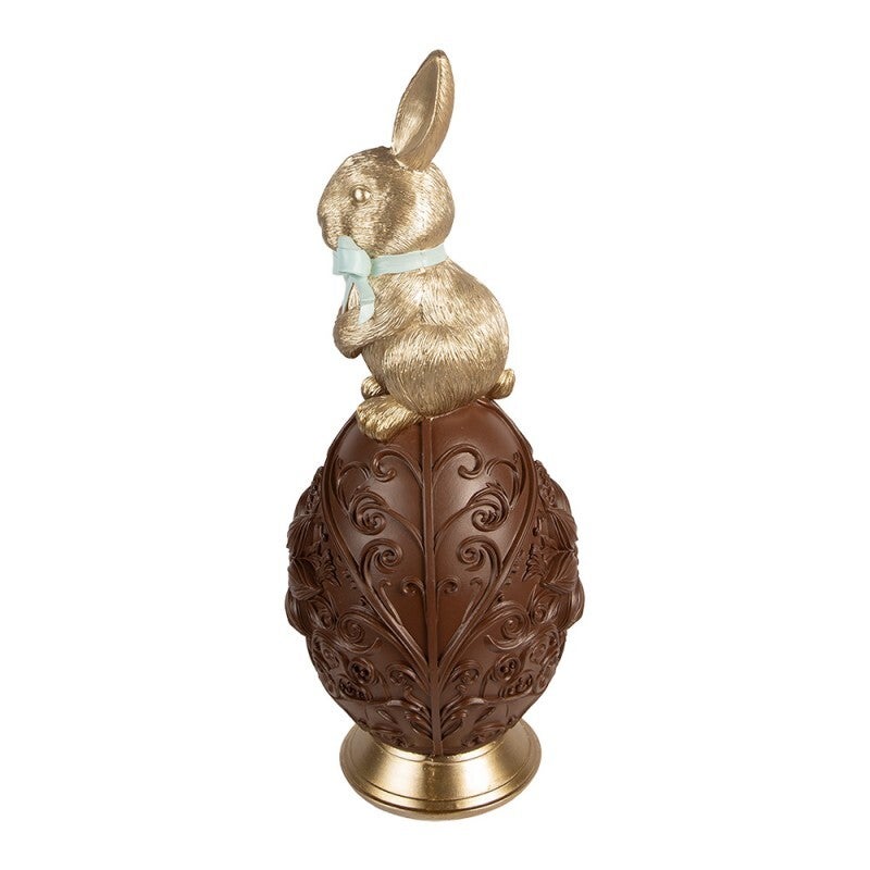 Élégante et raffinée, cette grande pièce décorative de 62 cm de haut associe un lapin doré aux détails finement sculptés, posé sur un œuf ornemental effet chocolat. Son style chic et ses finitions travaillées en font une décoration idéale pour Pâques, une vitrine ou un intérieur sophistiqué. En polyrésine.