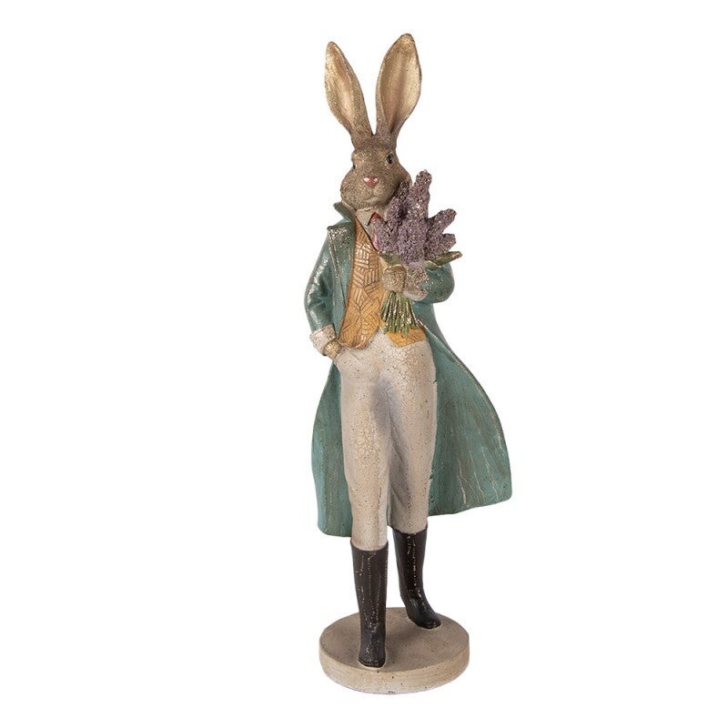 Grand lapin décoratif au style vintage raffiné, vêtu d’un élégant manteau vert et tenant un bouquet de fleurs délicates. Avec ses finitions patinées et son allure distinguée, il apporte charme et caractère à votre décoration de Pâques ou de printemps. Une pièce pleine d’élégance pour sublimer votre intérieur avec authenticité. En polyrésine.