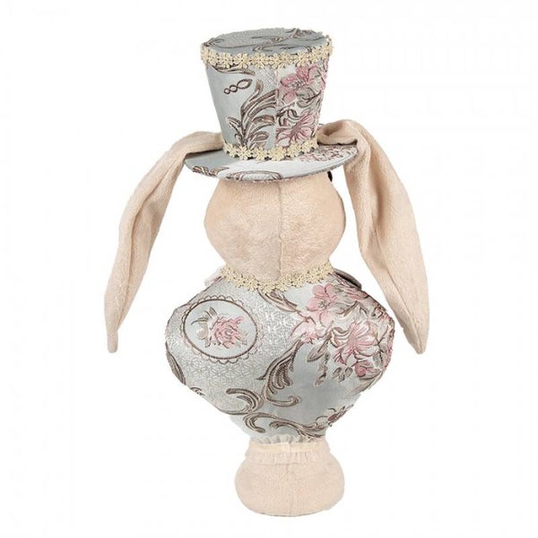 Buste décoratif lapin en textile raffiné, inspiré de l’univers d’Alice au Pays des Merveilles. Habillé d’un élégant haut-de-forme brodé aux motifs floraux et de finitions dorées délicates, ce lapin arbore un col plissé romantique et un costume aux tons doux bleu et rose poudré. Ses détails soignés en font une pièce originale et poétique, idéale pour une décoration de Pâques chic ou une ambiance vintage pleine de charme.