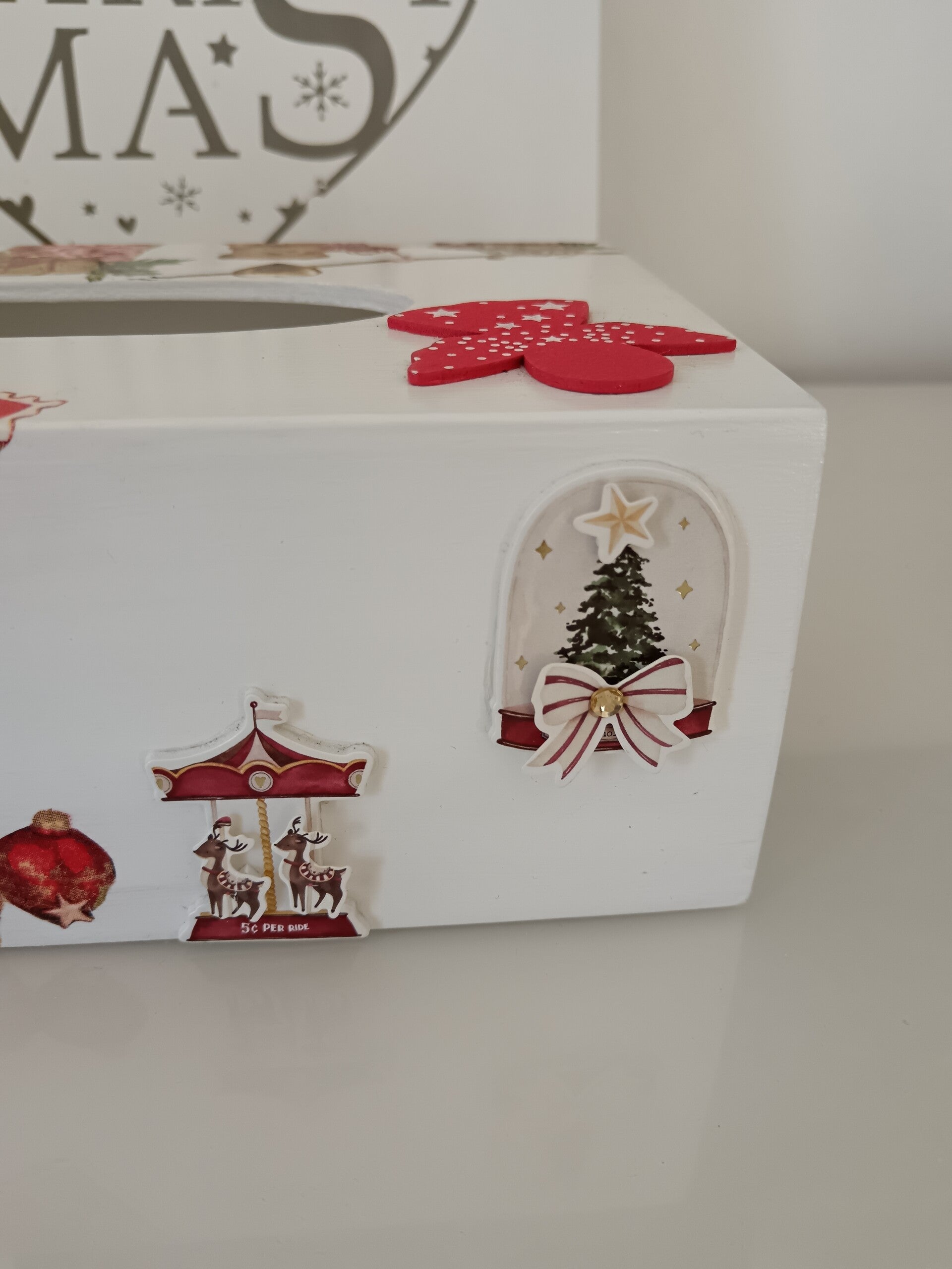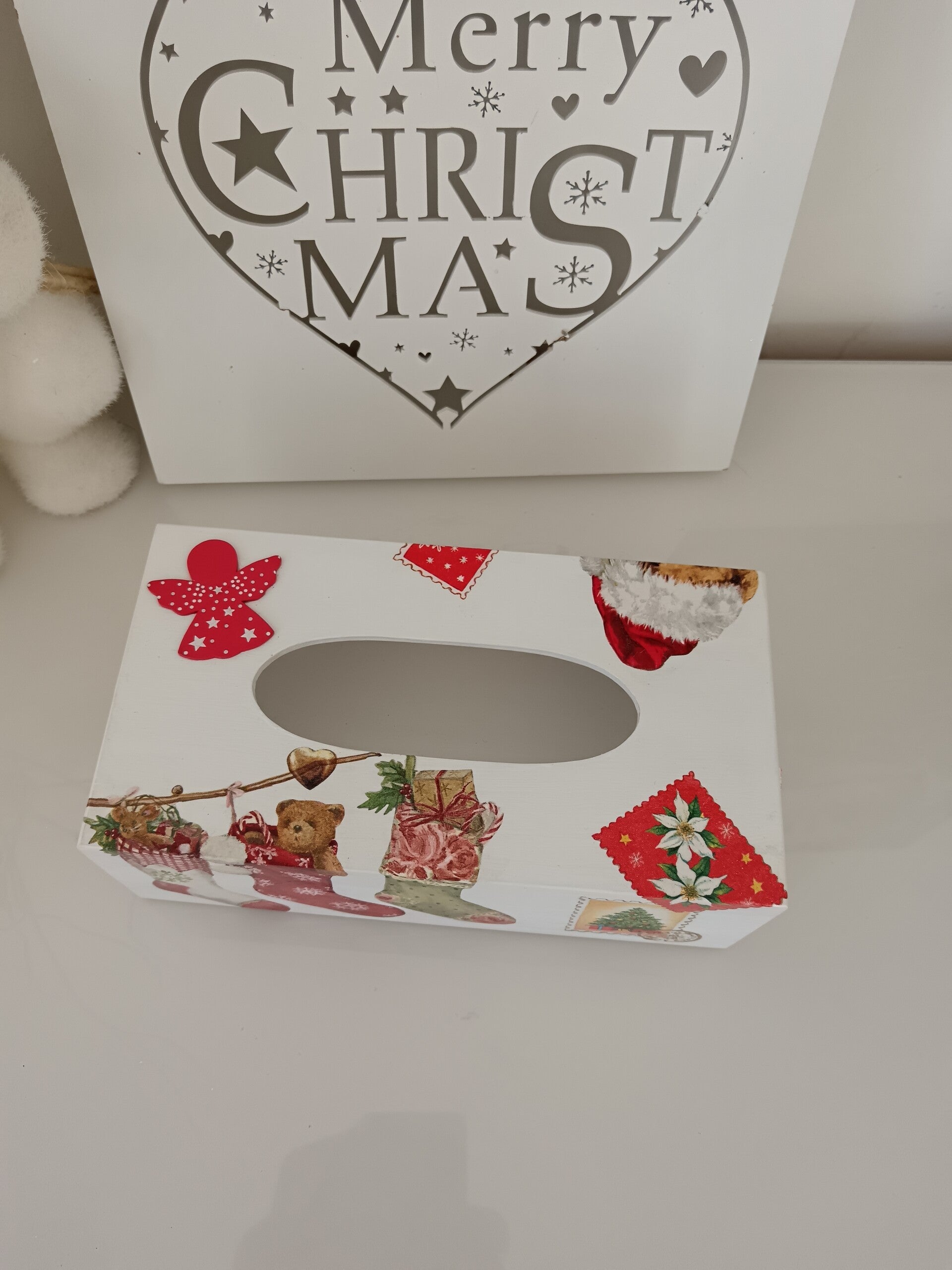 Boîte à mouchoirs en bois peinte en blanc et décorée à la main avec la technique du serviettage. Son univers chaleureux met en scène chaussettes de Noël garnies, ourson festif, timbres vintage et jolis motifs rouges pour une ambiance douce et traditionnelle. Pratique et décorative, elle habille élégamment une boîte de mouchoirs standard et apporte une touche festive à votre intérieur pendant les fêtes. Une création artisanale unique, idéale pour sublimer votre décoration de Noël ou offrir un cadeau original. Protégée par plusieurs couches de vernis.