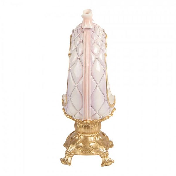 Œuf décoratif matelassé rose poudré sur pied doré, sublimé par un élégant nœud et des finitions raffinées. À l’intérieur, deux adorables lapins blancs entourés de délicates roses apportent une touche tendre et printanière. Une pièce chic et romantique, idéale pour une décoration de Pâques élégante ou un intérieur au charme classique. En polyrésine.