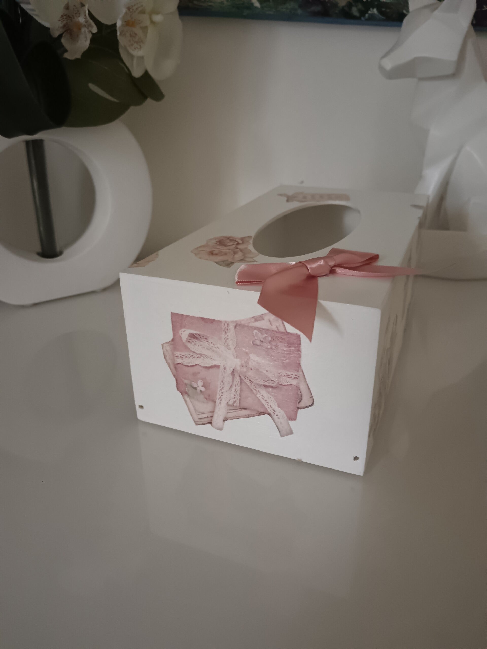 Boîte à mouchoirs en bois, décorée à la main avec la technique du serviettage, dans un esprit romantique et Shabby chic.