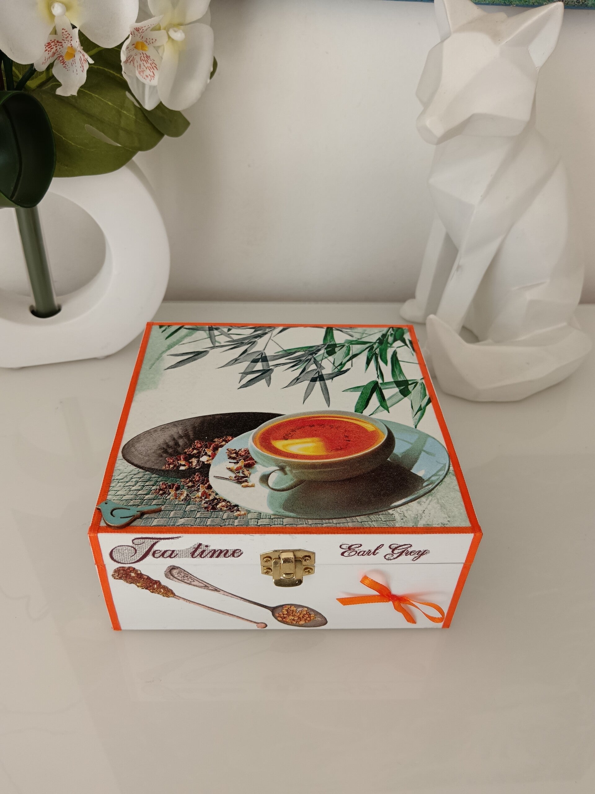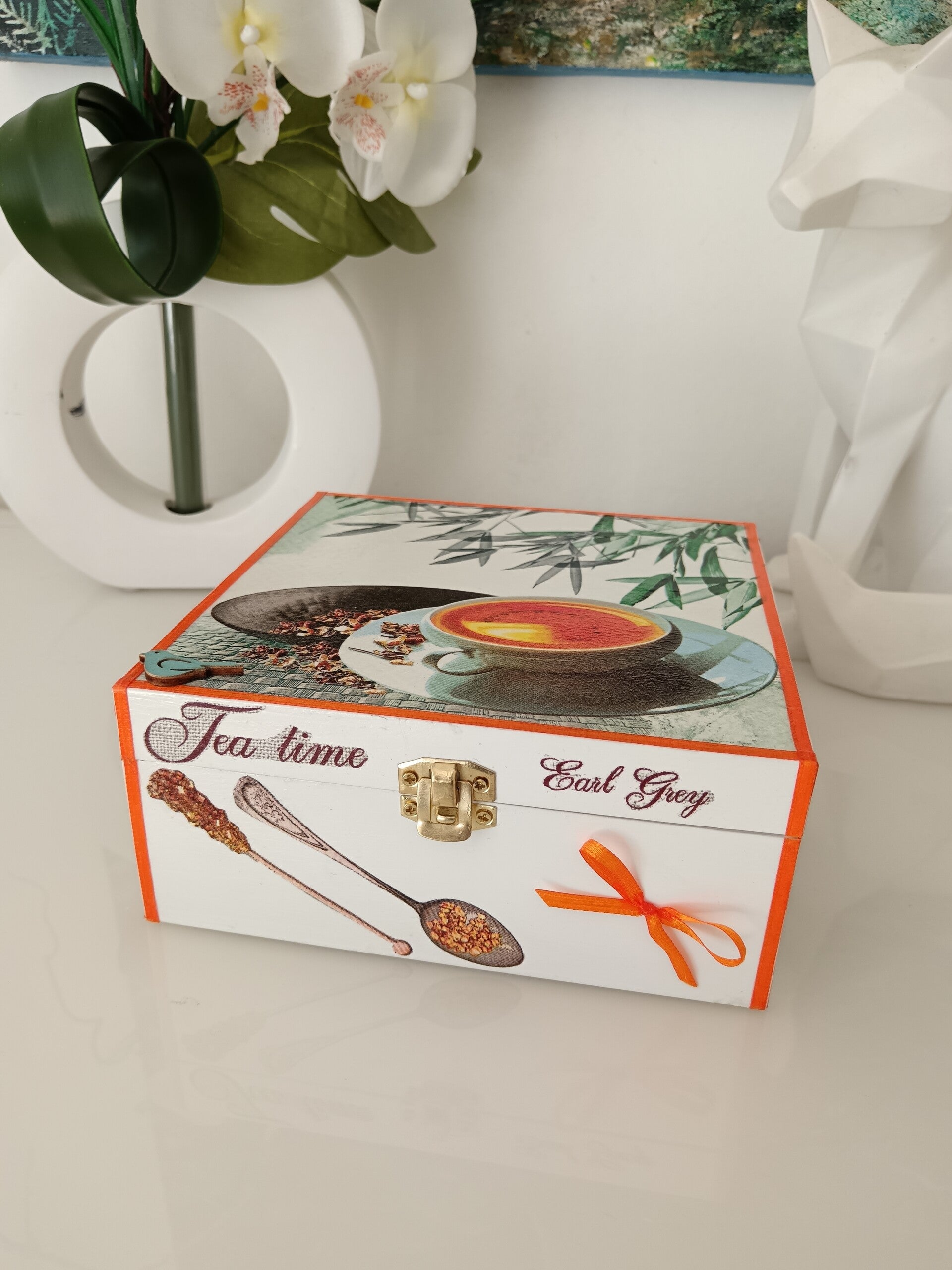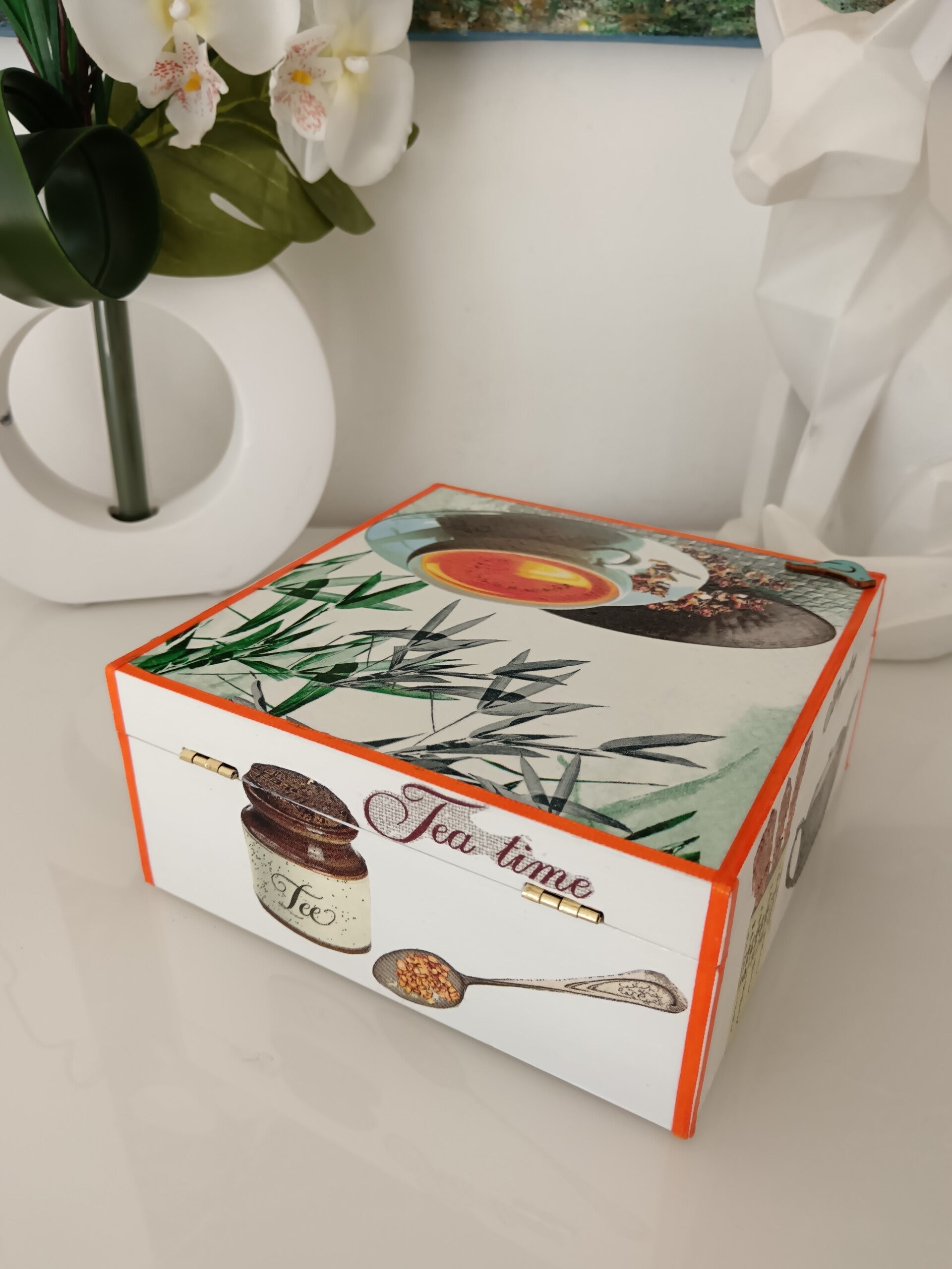 Offrez-vous une pause douceur avec cette élégante boîte à thé décorée à la main. Réalisée avec la technique du serviettage, elle met à l’honneur l’univers du thé dans une ambiance chaleureuse et raffinée. Protégée par plusieurs couches de vernis, elle allie esthétique et durabilité.