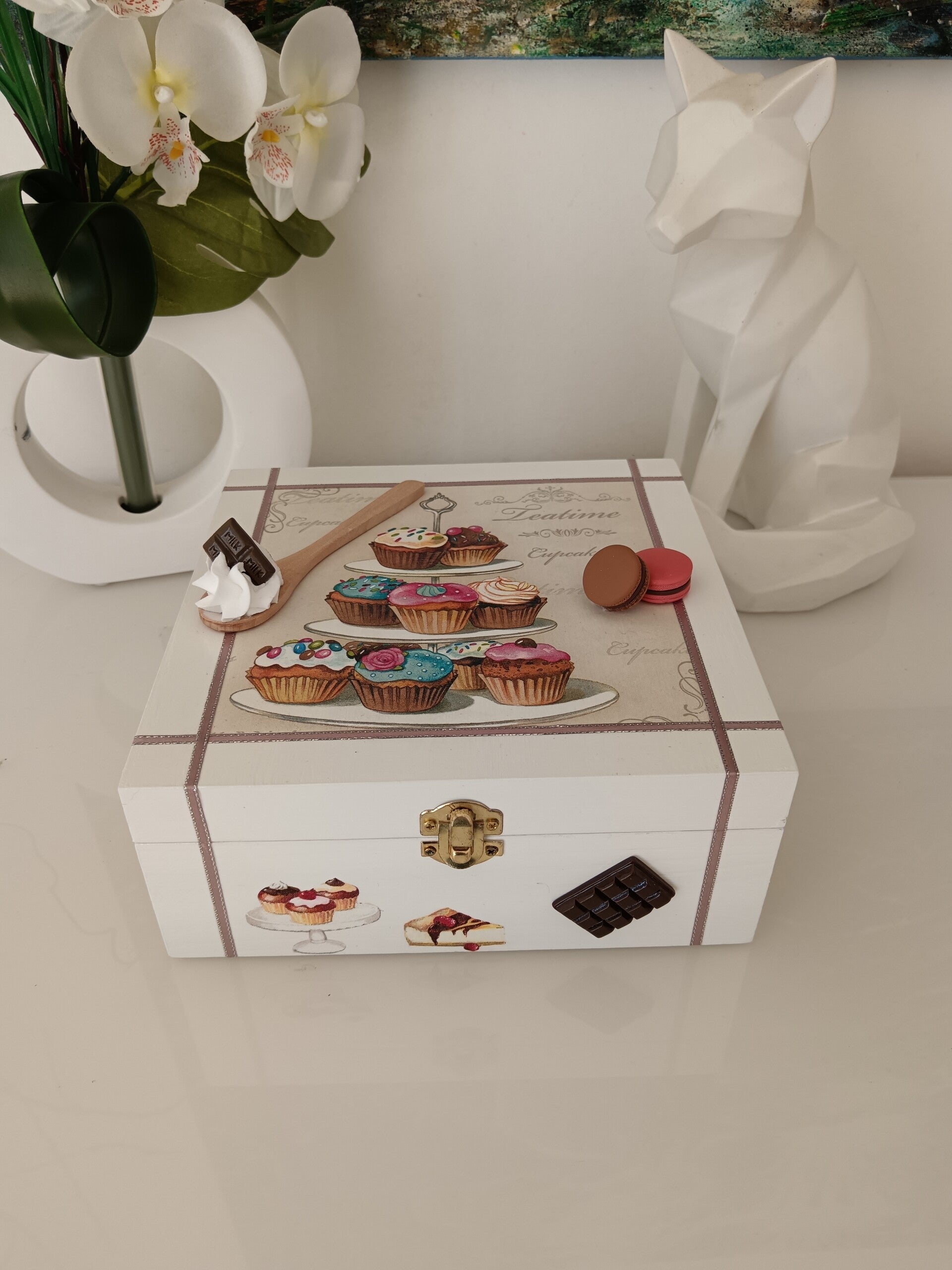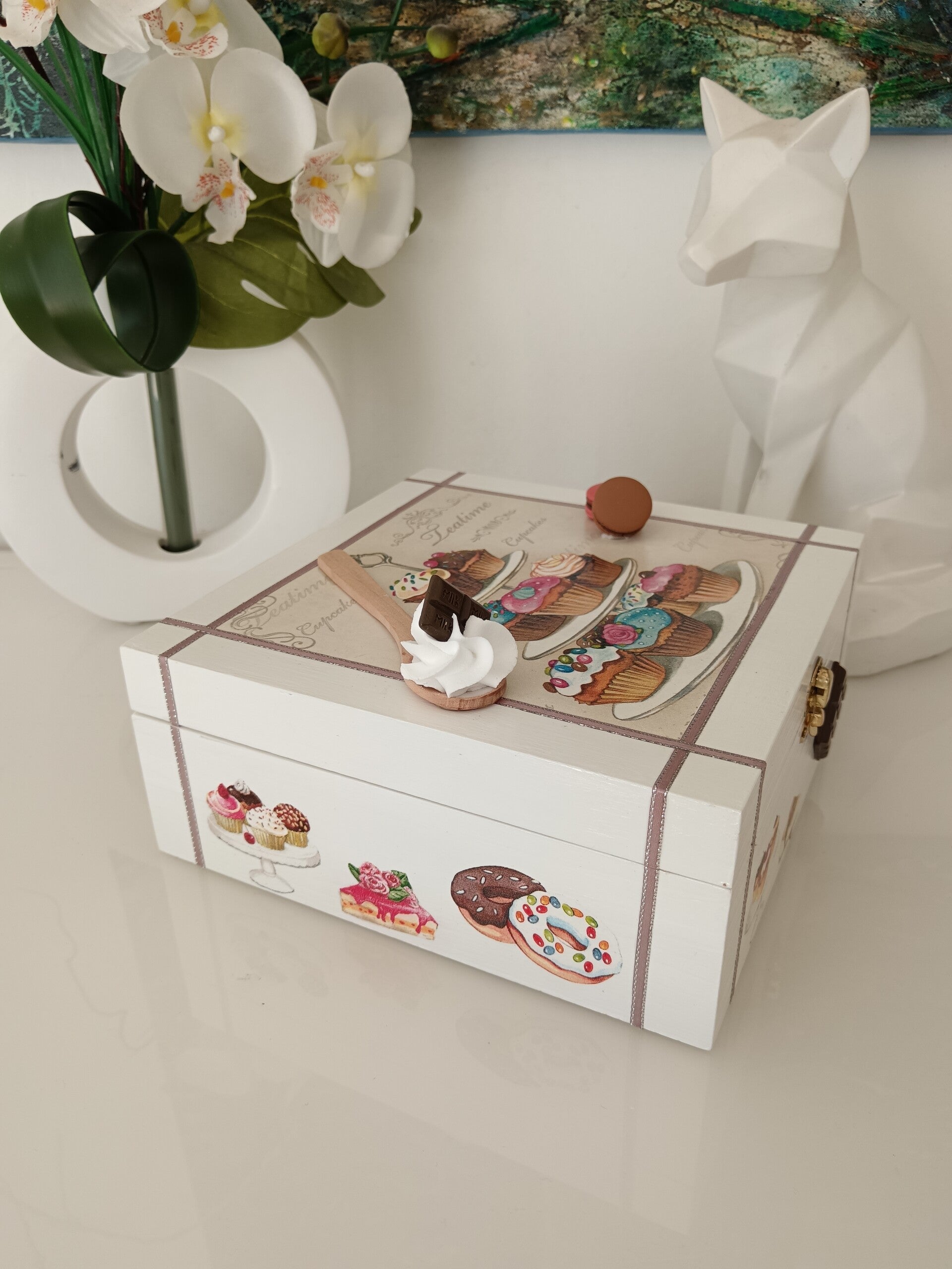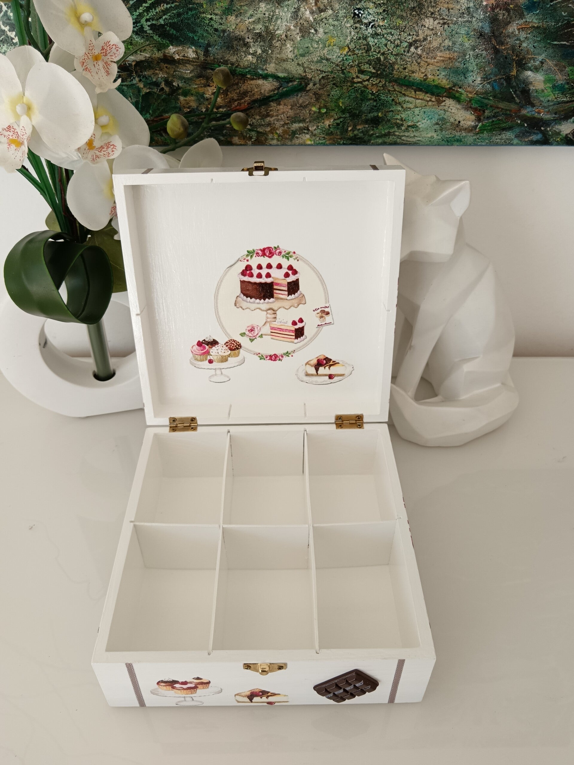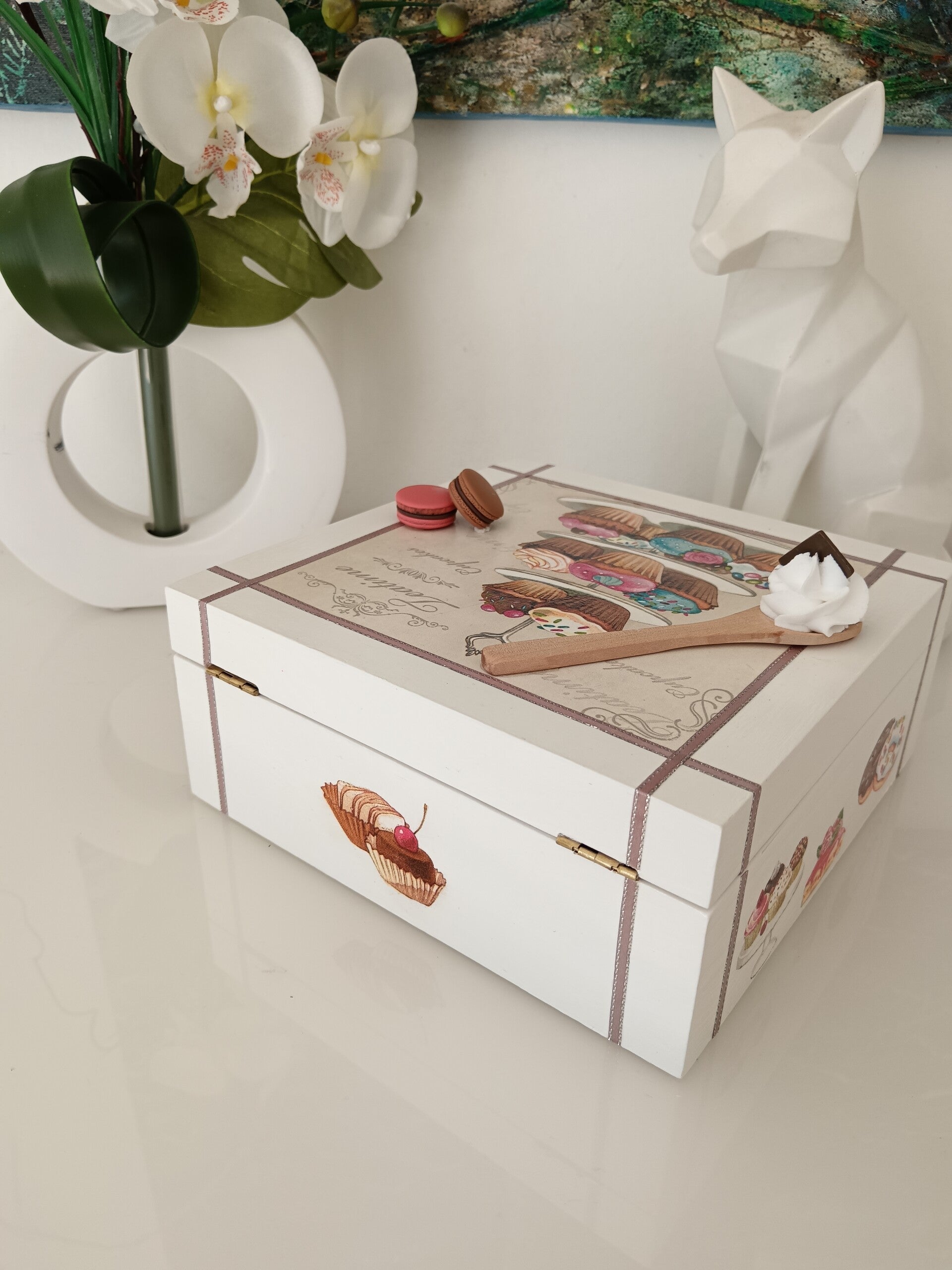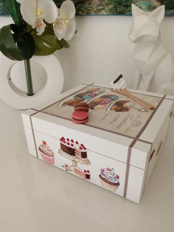 Craquez pour cette jolie boîte en bois décorée à la main, idéale pour les amoureux de douceurs et de moments gourmands. Réalisée avec la technique du serviettage et protégée par plusieurs couches de vernis, elle allie charme, qualité et durabilité. Son intérieur compartimenté permet de ranger facilement thés, bijoux ou petits trésors du quotidien. Un accessoire aussi pratique que décoratif, parfait pour apporter une touche chaleureuse à votre intérieur.