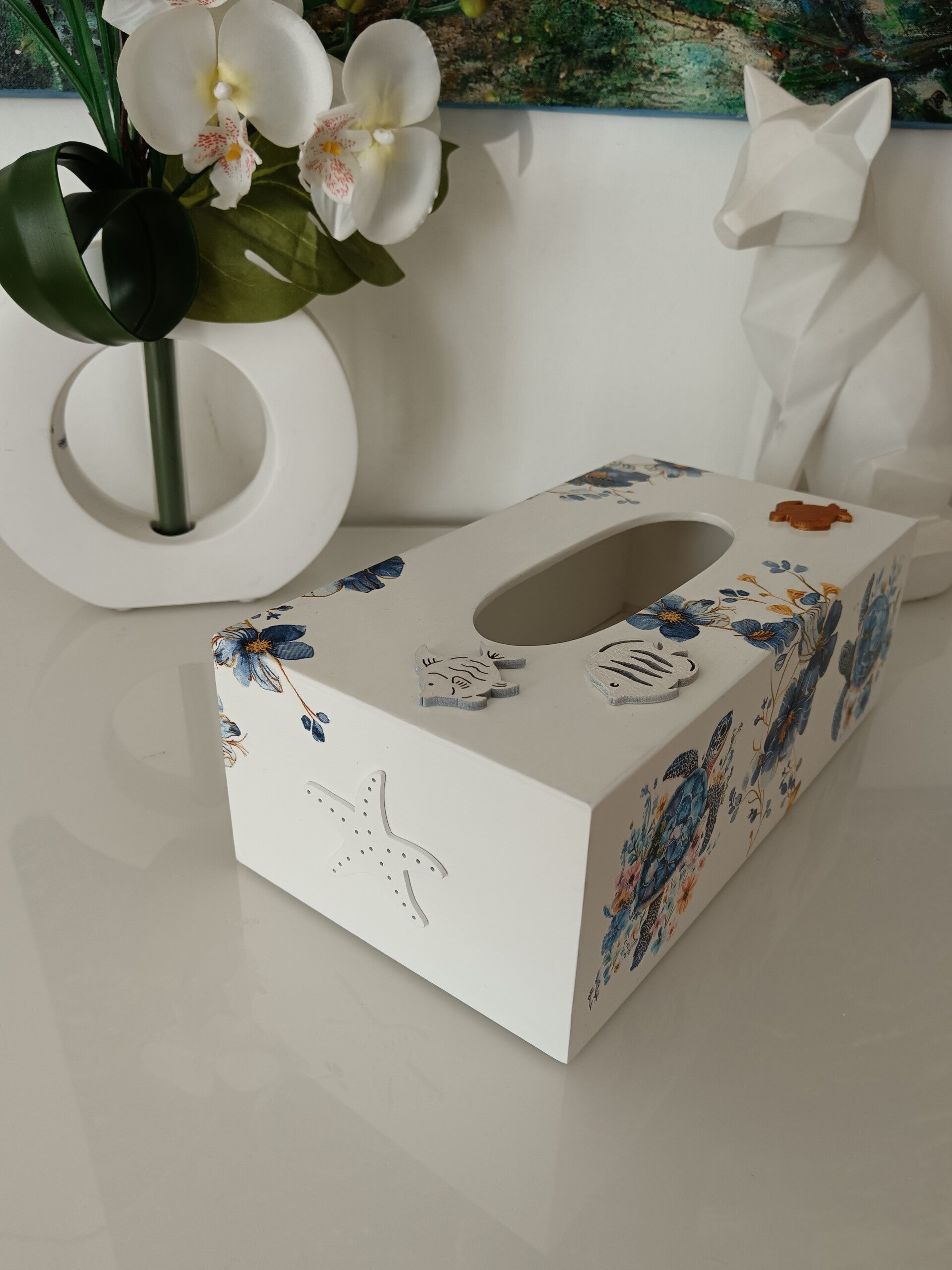 Apportez une touche marine et élégante à votre intérieur avec cette boîte à mouchoirs en bois décorée à la main avec la technique du serviettage. Elle est sublimée par de délicats motifs de tortues et de fleurs bleutées, puis protégée par plusieurs couches de vernis pour une finition durable. À la fois pratique et décorative, elle trouvera facilement sa place dans votre salon, chambre ou salle de bain pour une ambiance douce et apaisante.