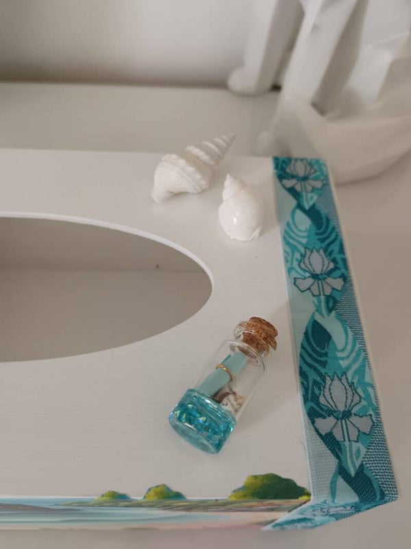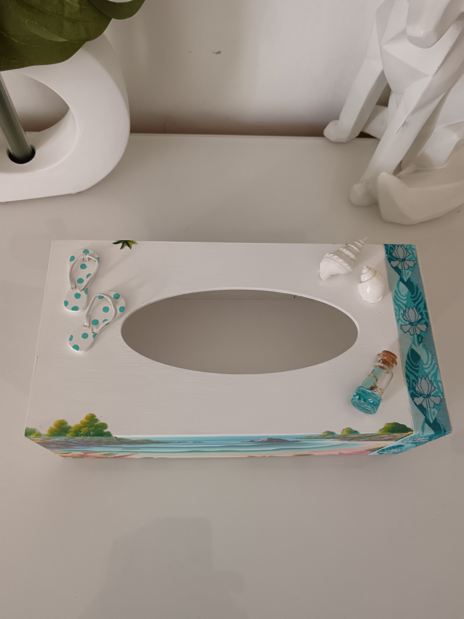 Craquez pour cette boîte à mouchoirs aux airs de vacances. Son décor tropical aux couleurs douces est rehaussé par de délicats éléments en relief : coquillages, tongs et petit flacon en verre.