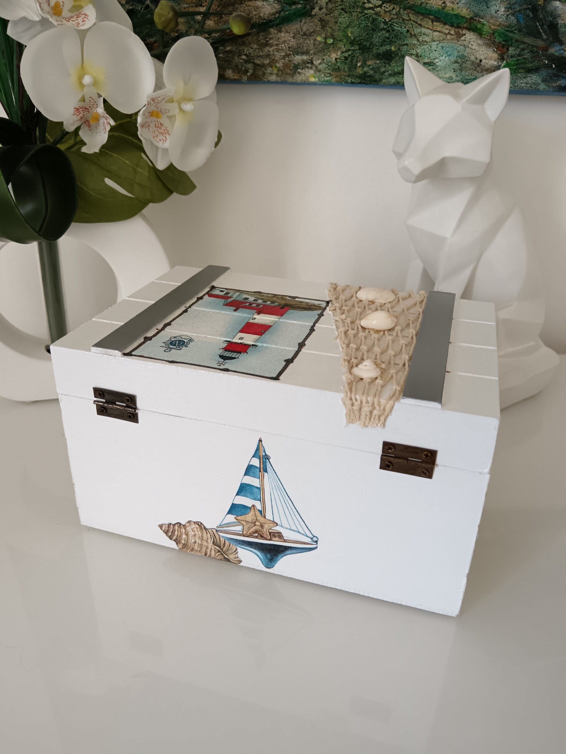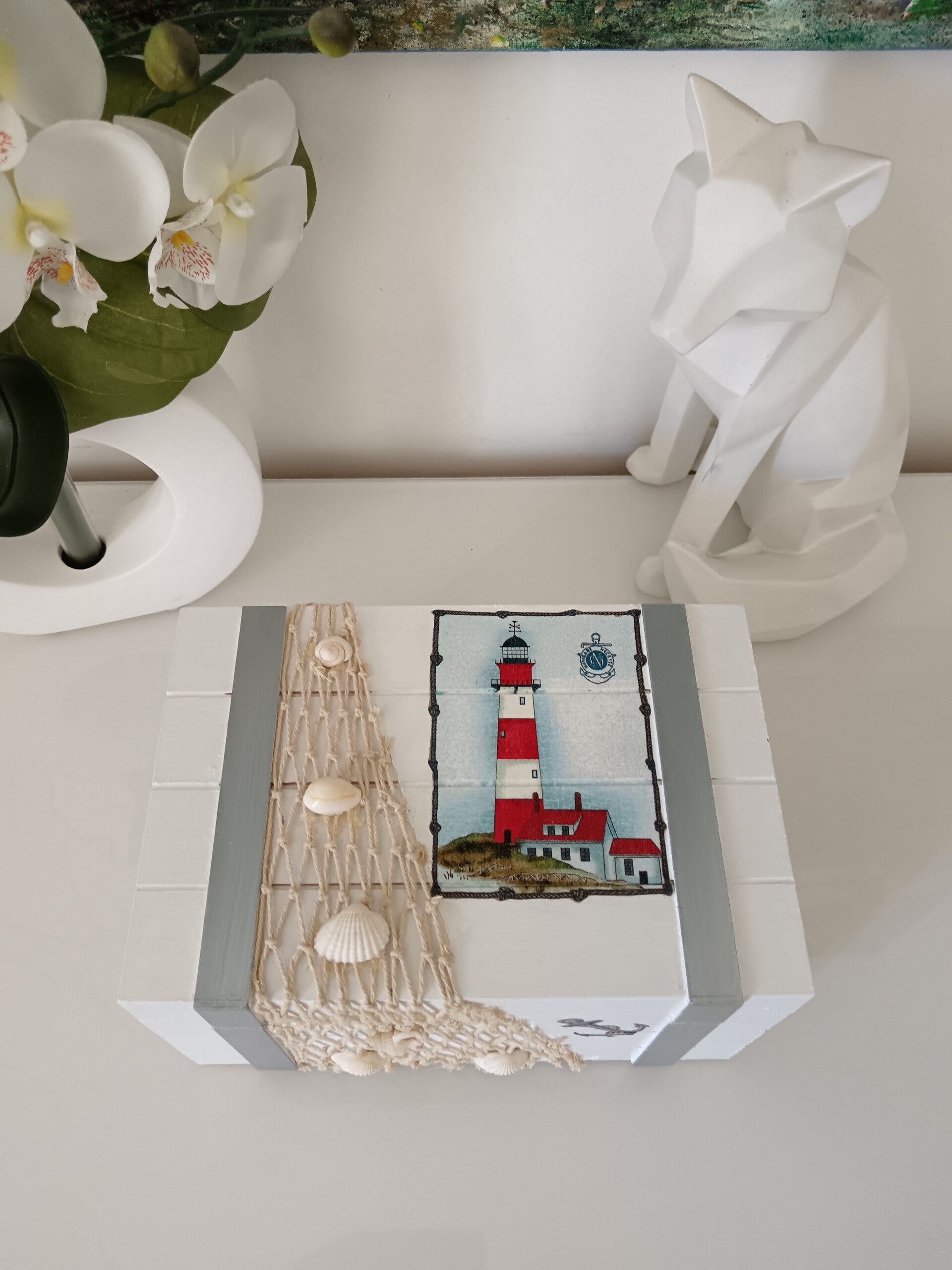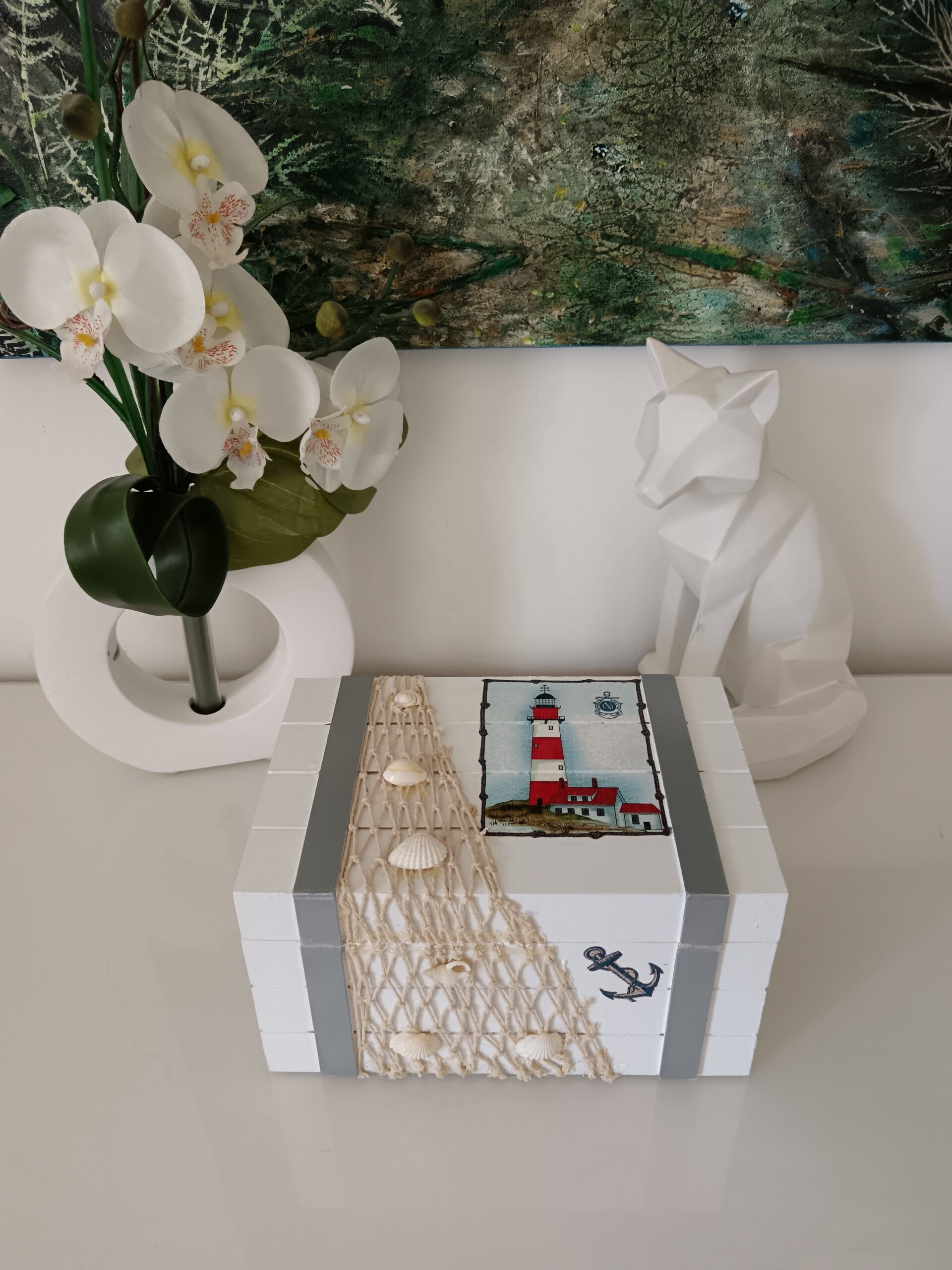 Apportez une touche d’évasion à votre intérieur avec cette élégante boîte en bois décorée à la main, inspirée de l’univers marin. Réalisée avec la technique du serviettage et agrémentée de détails en relief (filet et coquillages), elle est protégée par plusieurs couches de vernis pour une finition soignée et durable.