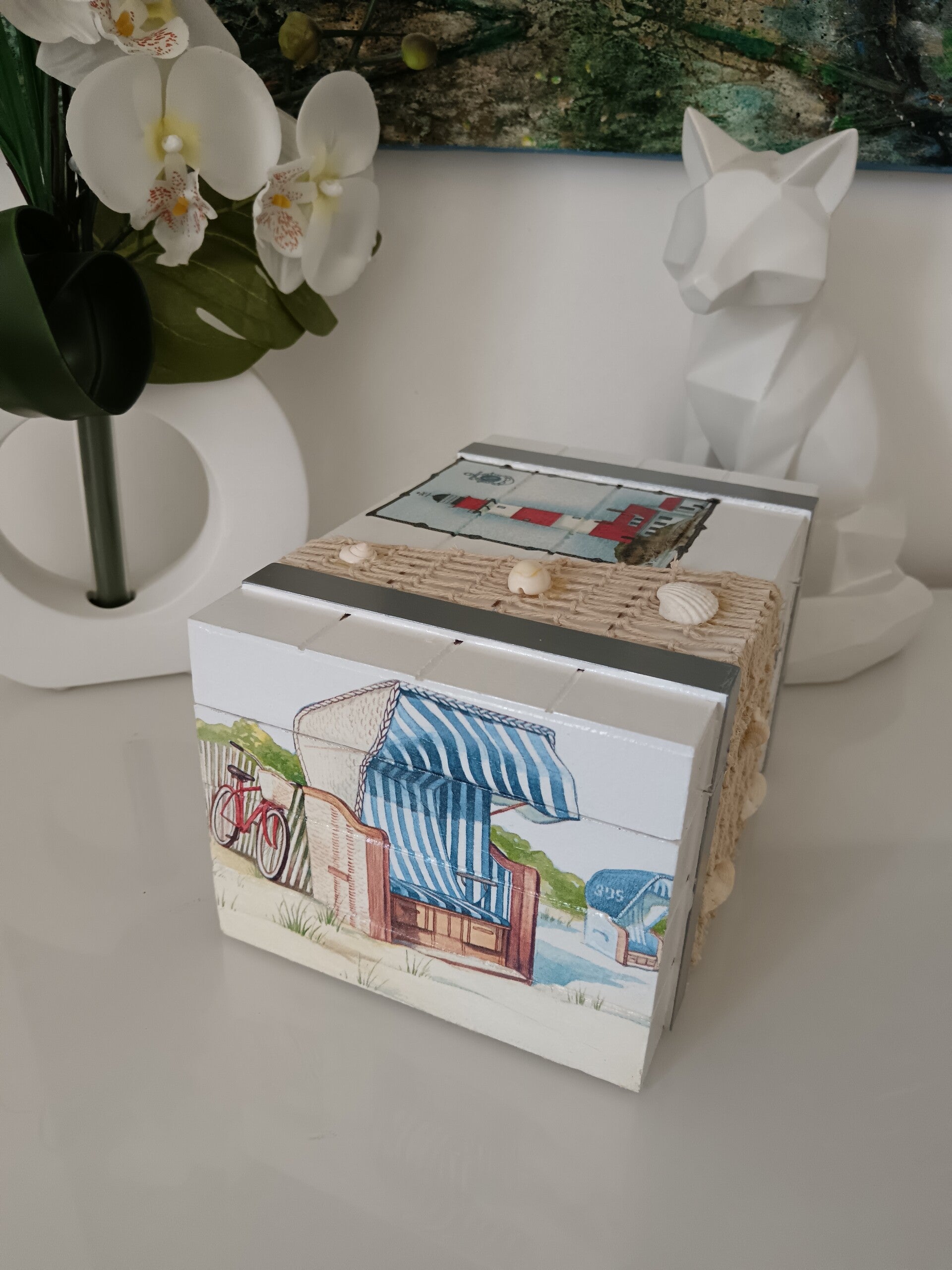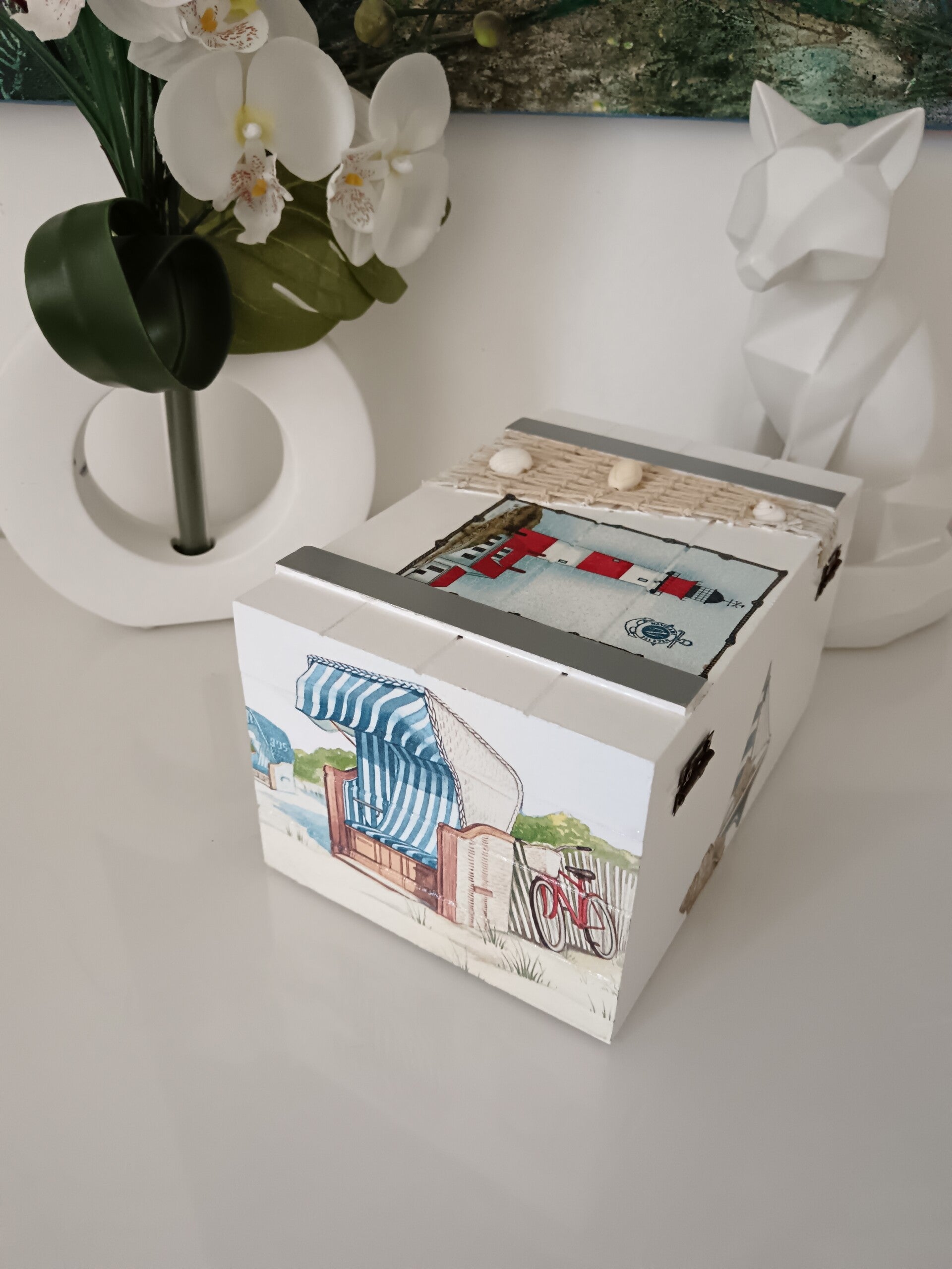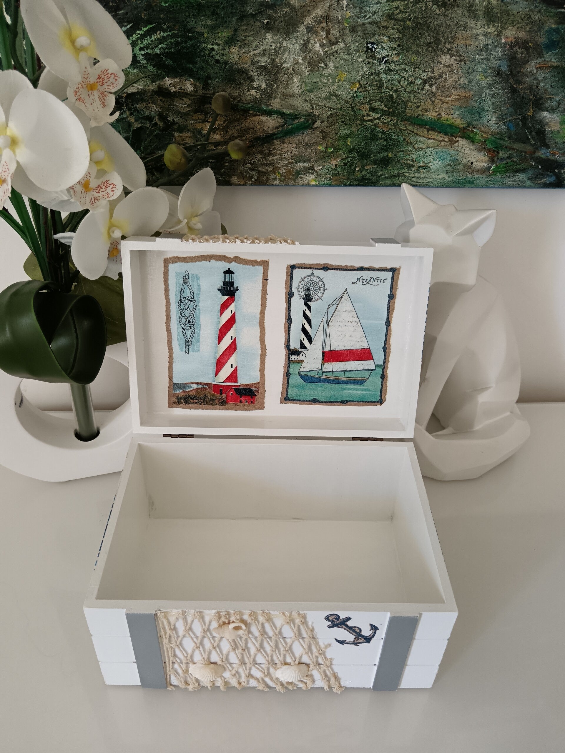 Apportez une touche d’évasion à votre intérieur avec cette élégante boîte en bois décorée à la main, inspirée de l’univers marin. Réalisée avec la technique du serviettage et agrémentée de détails en relief (filet et coquillages), elle est protégée par plusieurs couches de vernis pour une finition soignée et durable.