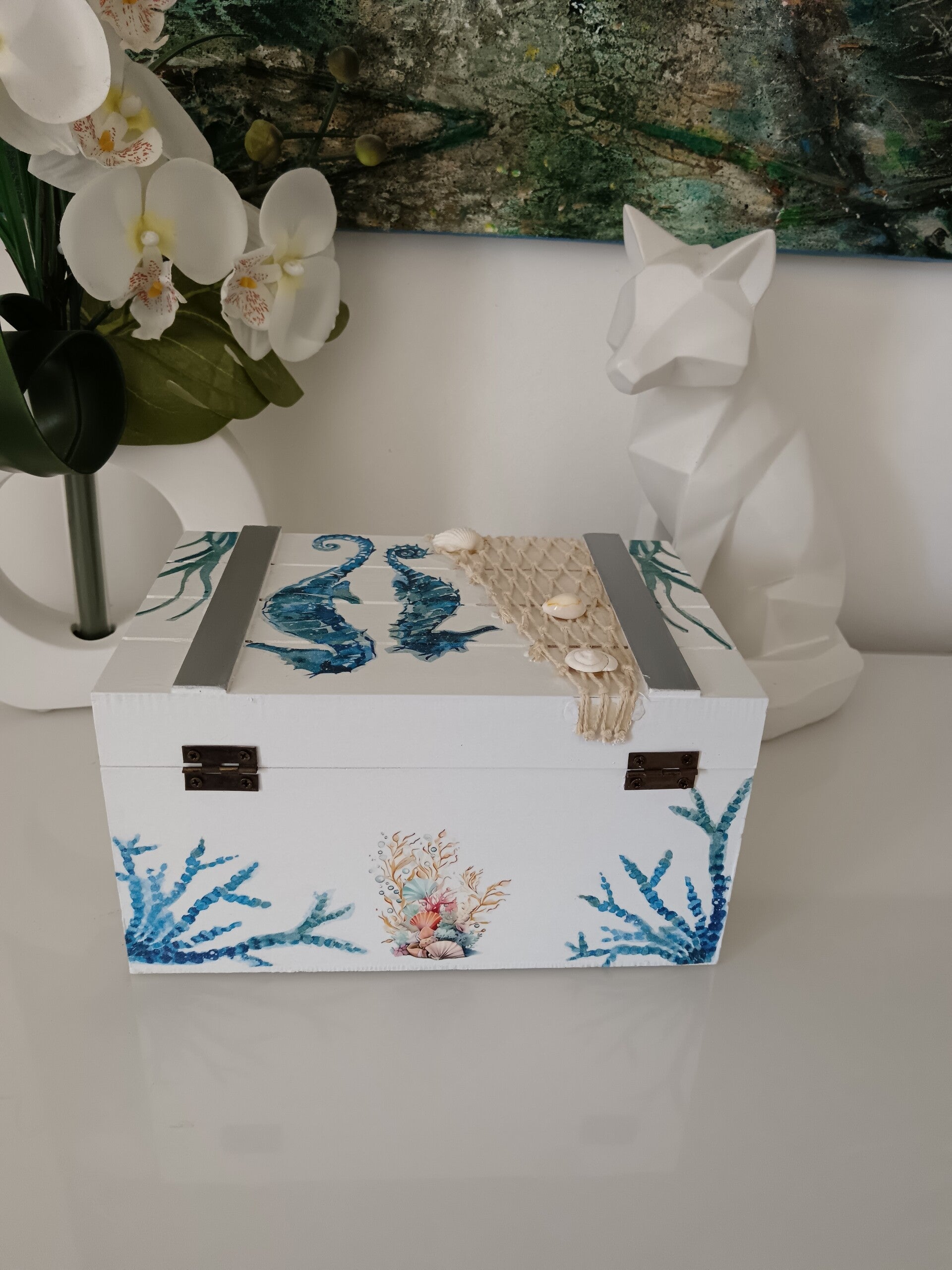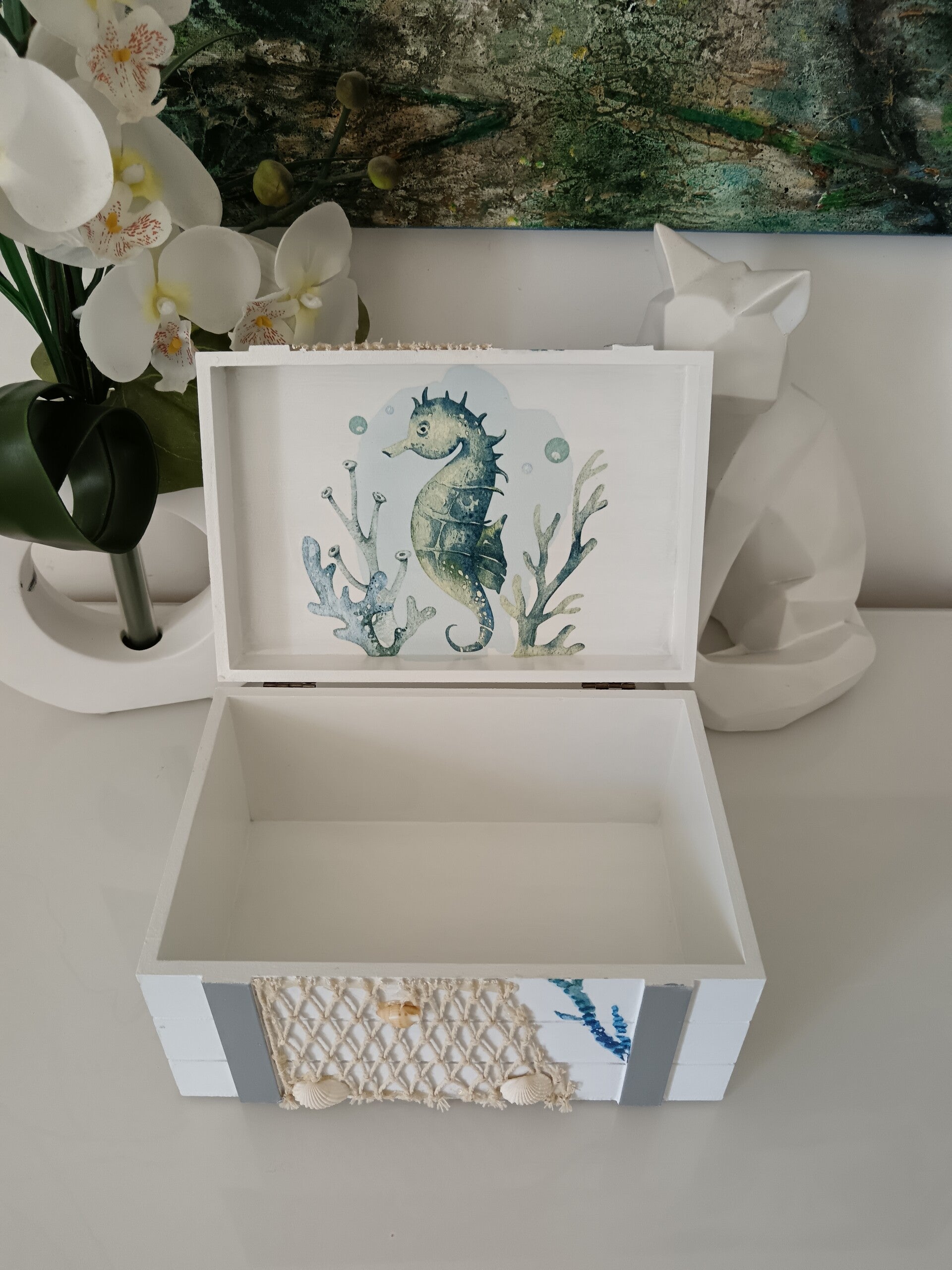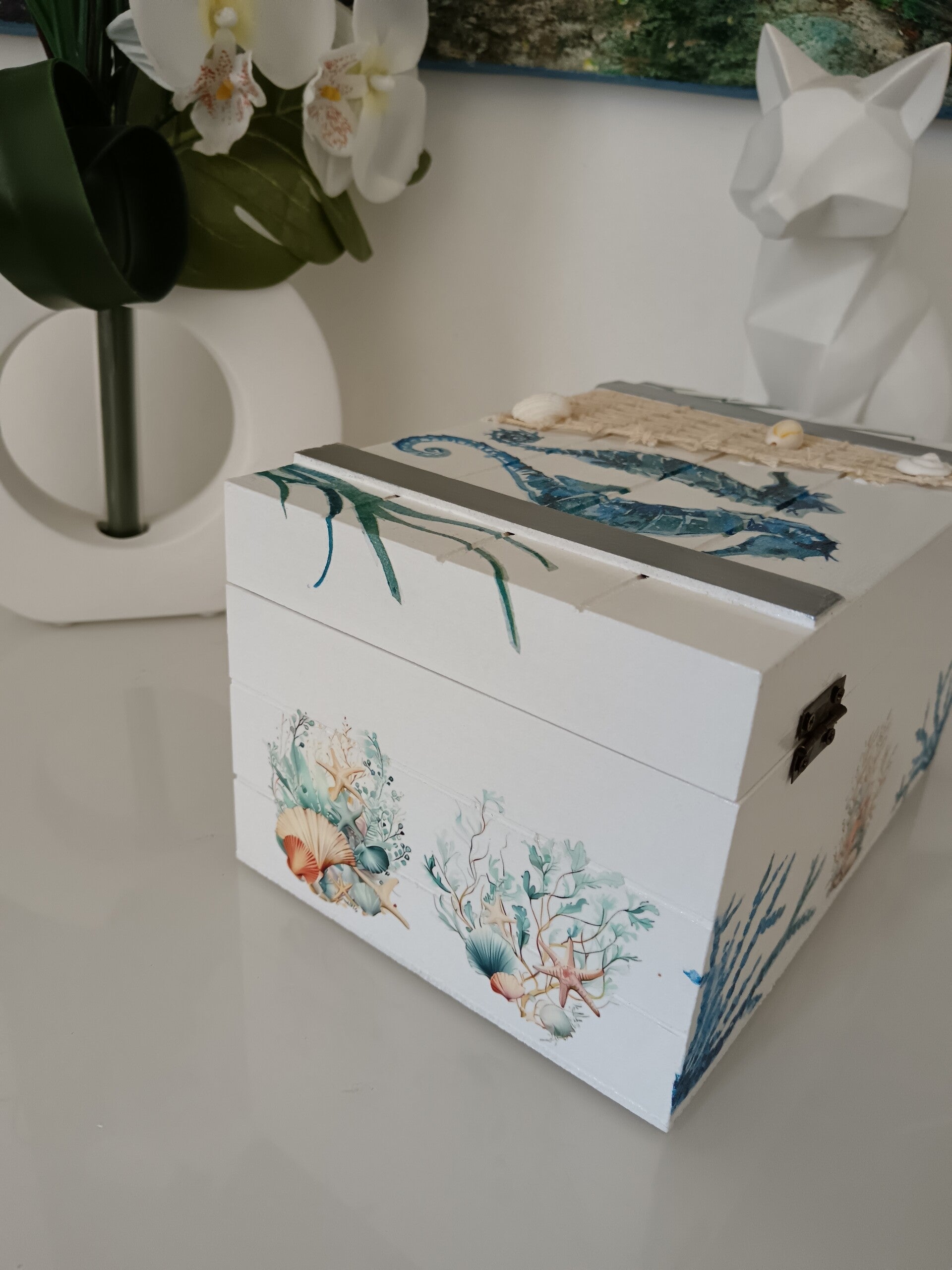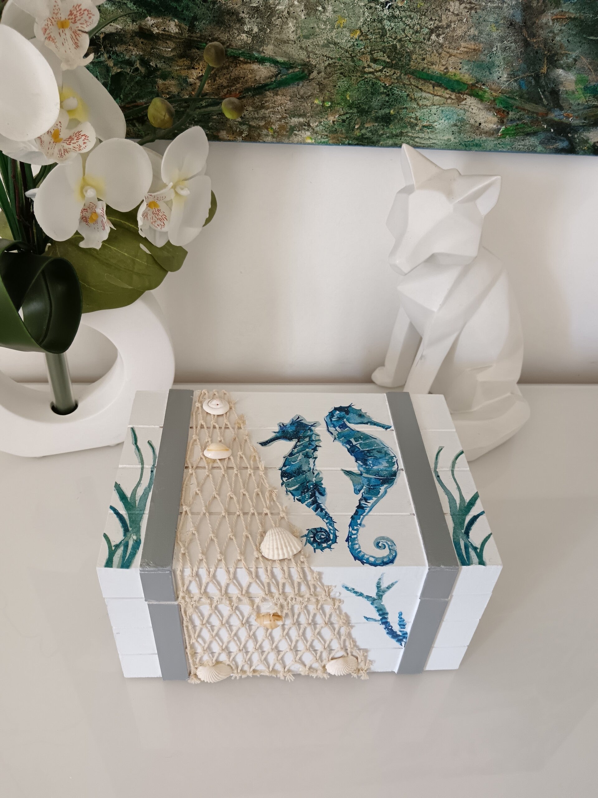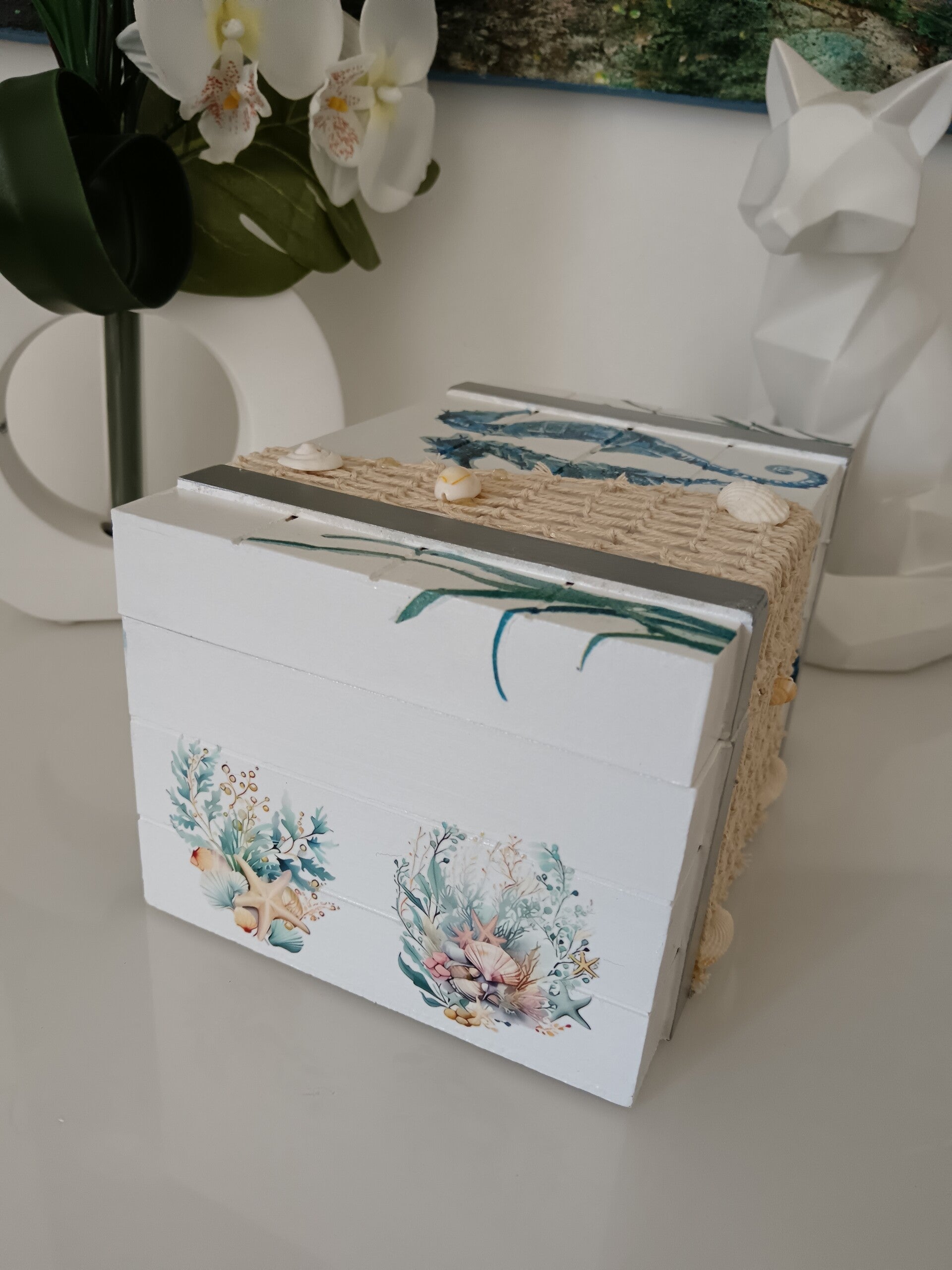 Réalisée avec la technique du serviettage et protégée par plusieurs couches de vernis, cette boîte allie esthétique et durabilité. Idéale pour ranger vos petits trésors, elle devient aussi un véritable objet de décoration inspiré des fonds marins.