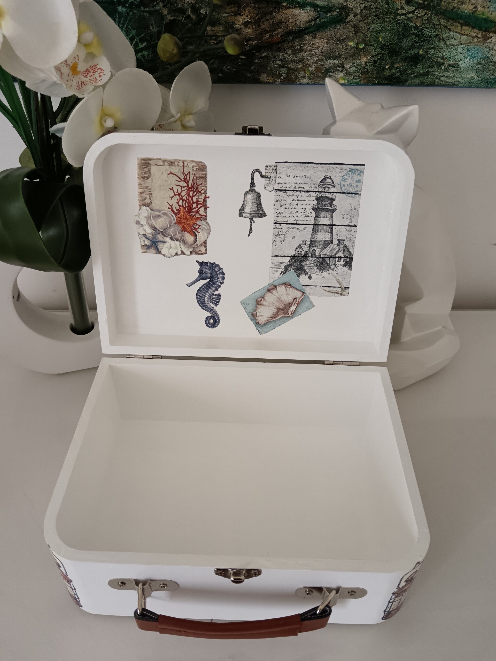 Boîte en bois en forme de valise, décorée à la main dans un élégant style marin et vintage. Illustrations délicates de coquillages, boussole et éléments nautiques qui apportent une touche d’évasion et de charme authentique. Chaque pièce est unique, protégée par plusieurs couches de vernis pour une finition soignée et durable. Idéale pour offrir ou pour ranger vos petits trésors avec style.