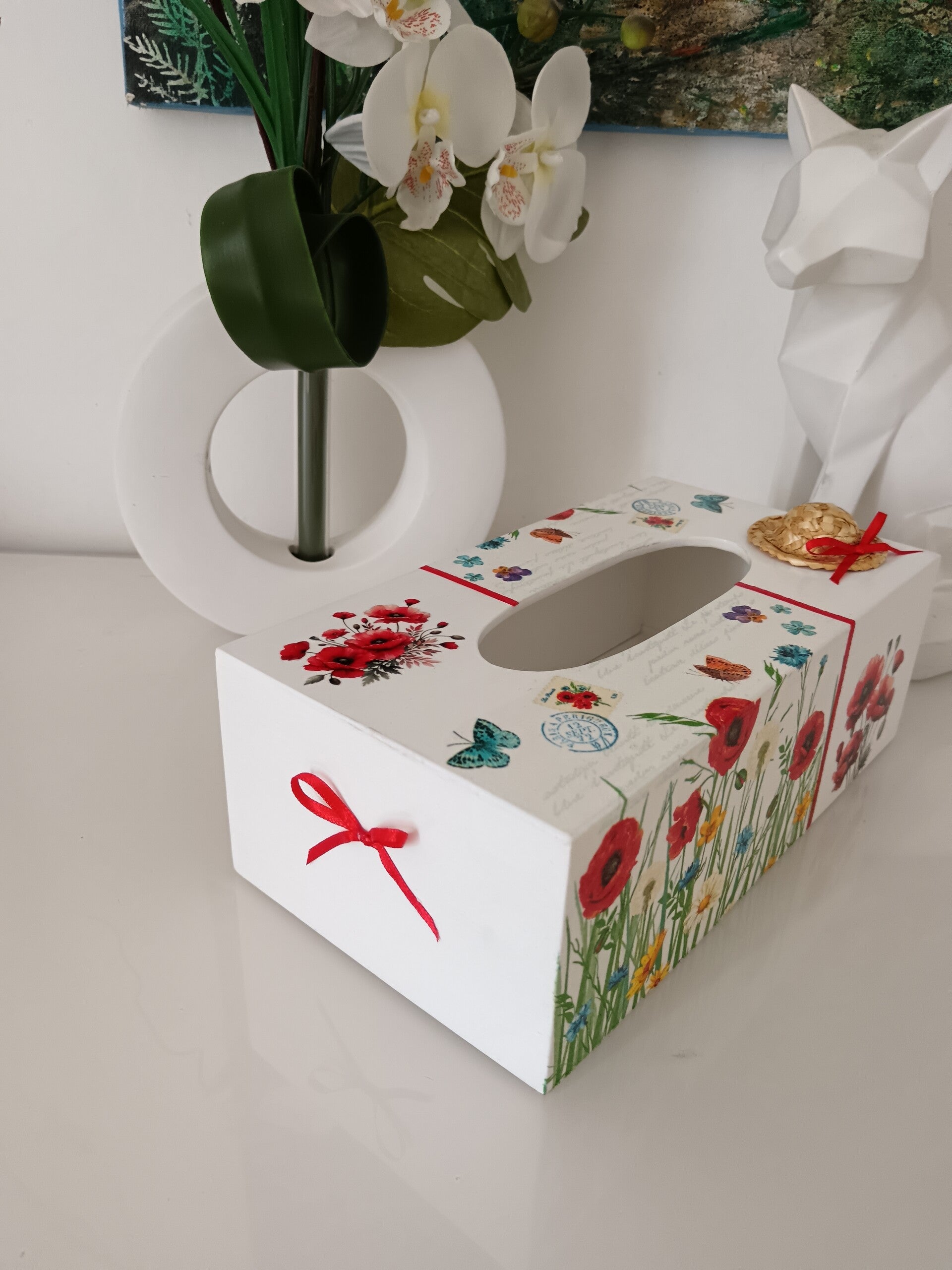 Boîte à mouchoirs en bois, décorée à la main dans un charmant style champêtre et printanier. Motifs délicats de coquelicots, fleurs sauvages et papillons, sublimés par de petits détails décoratifs qui apportent douceur et poésie. Chaque pièce est unique et protégée par plusieurs couches de vernis pour une finition durable et soignée. Idéale pour ajouter une touche élégante et nature à votre intérieur.
