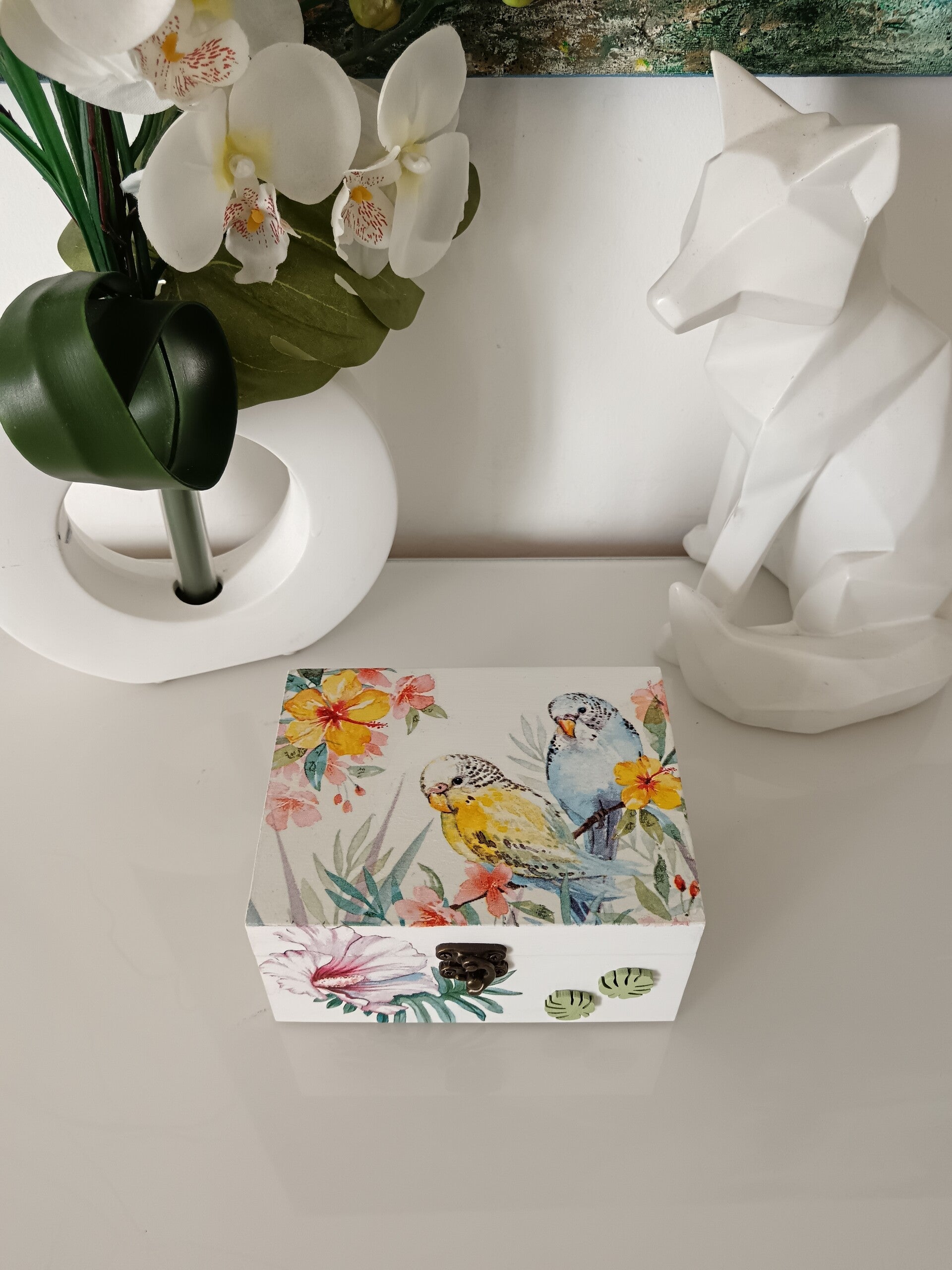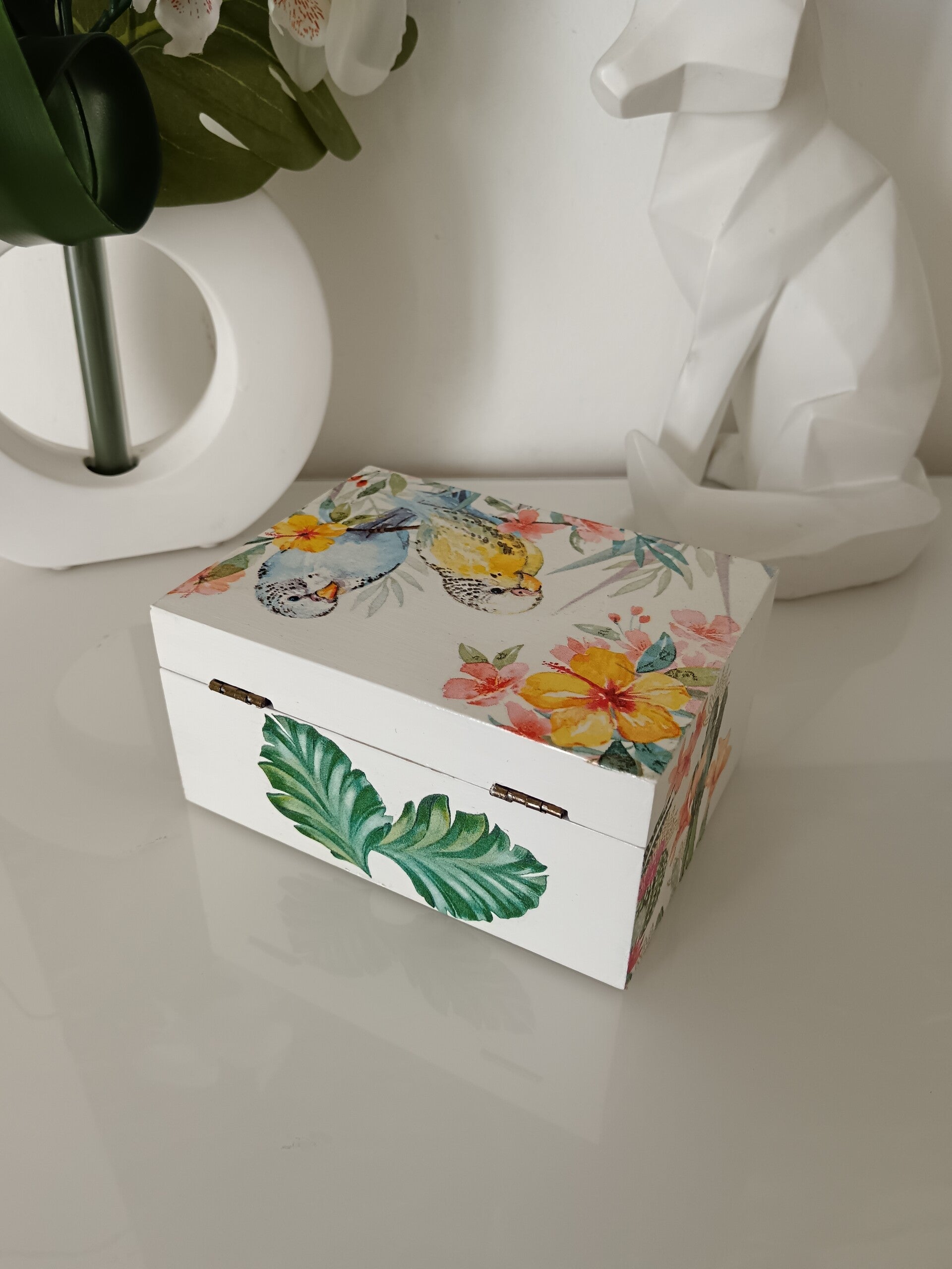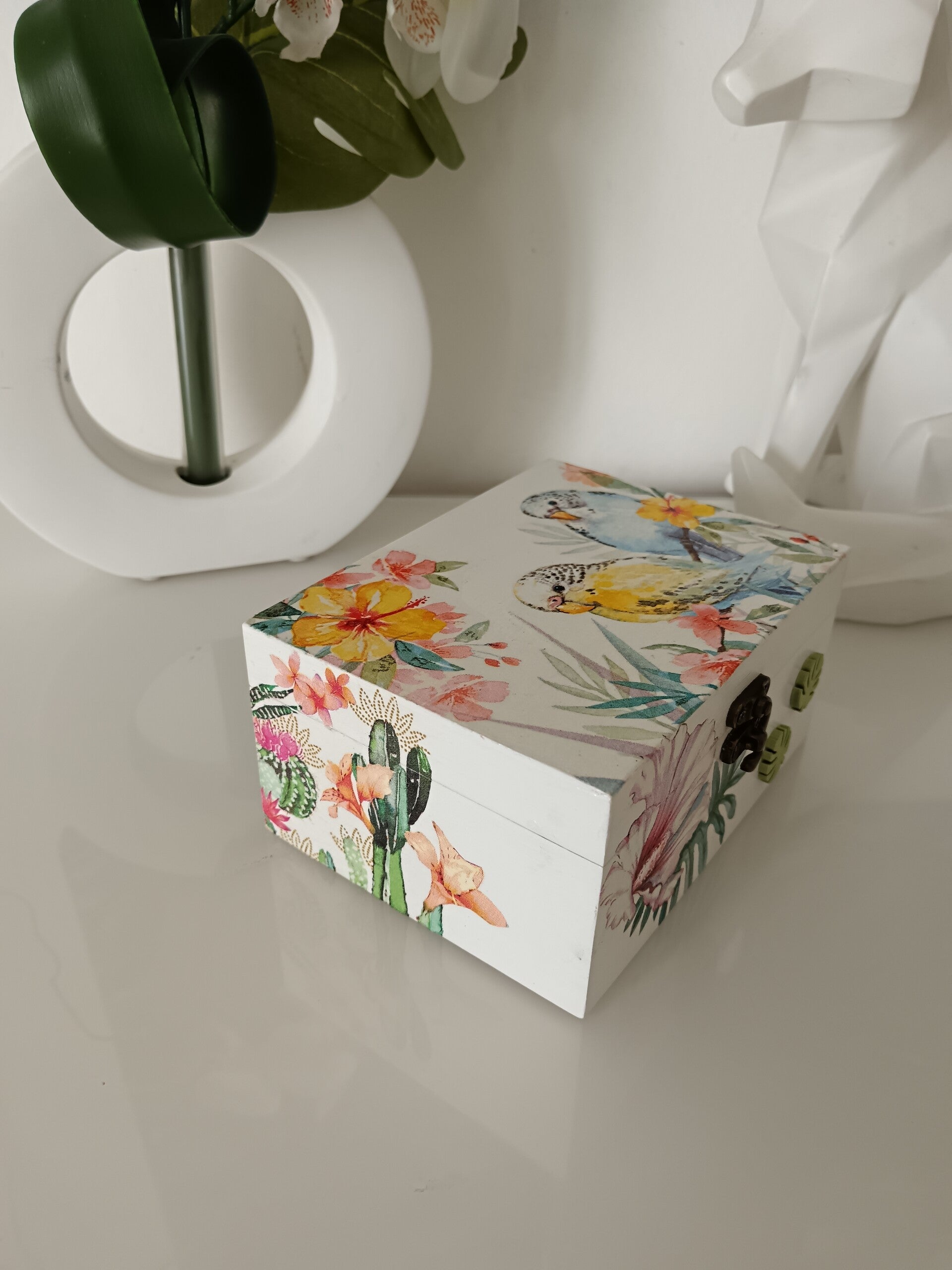 Boîte à thé en bois, décorée à la main avec la technique du serviettage. Style tropical doux et fleuri. Illustrations délicates d’oiseaux exotiques et de fleurs colorées qui apportent une touche de fraîcheur et d’évasion. Intérieur compartimenté pratique pour organiser vos sachets de thé ou petits trésors. Chaque pièce est unique, protégée par plusieurs couches de vernis pour une finition brillante et durable. Idéale pour allier praticité et décoration avec élégance.