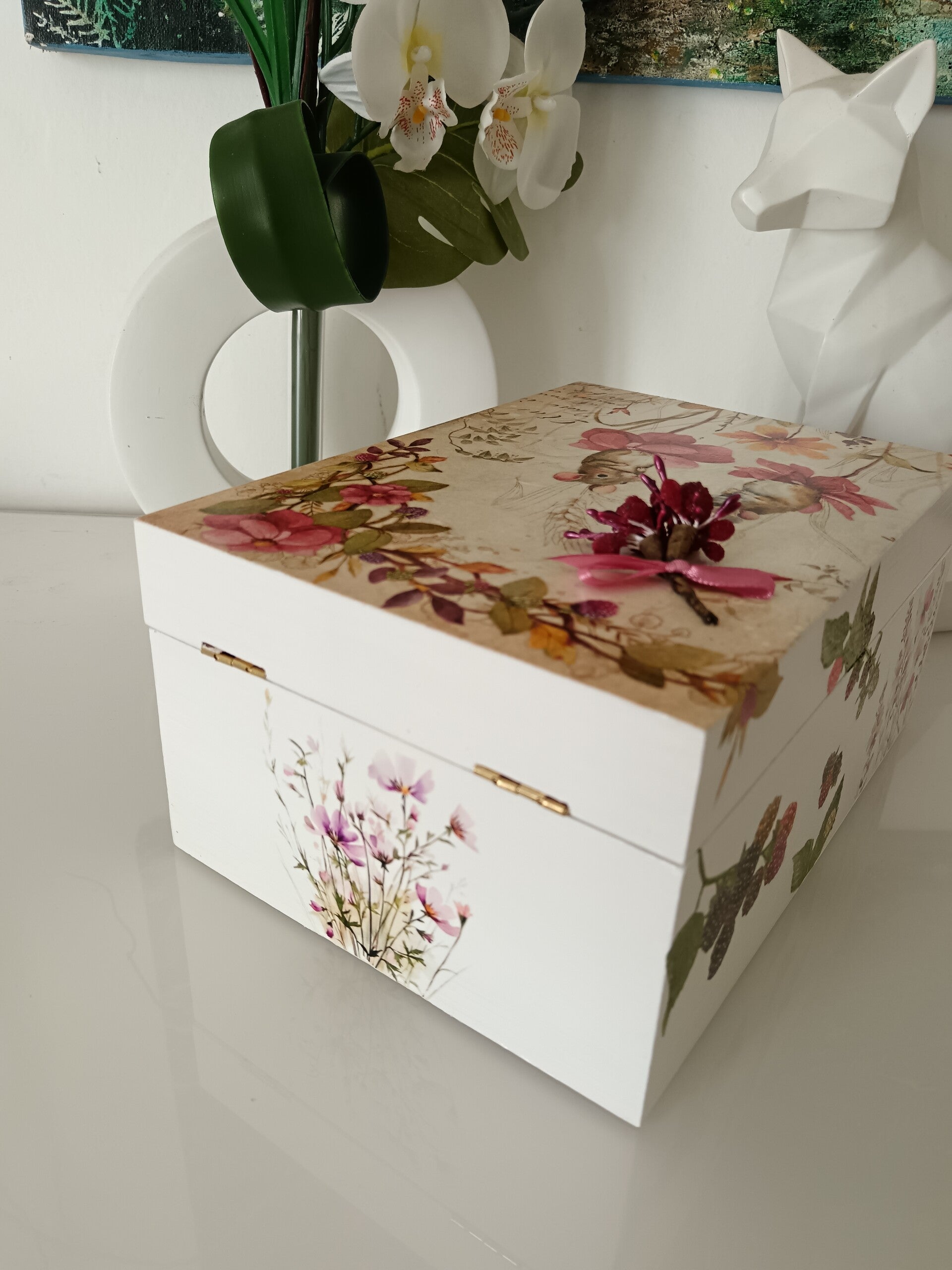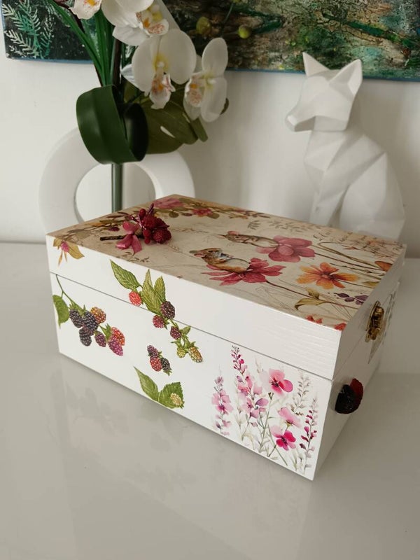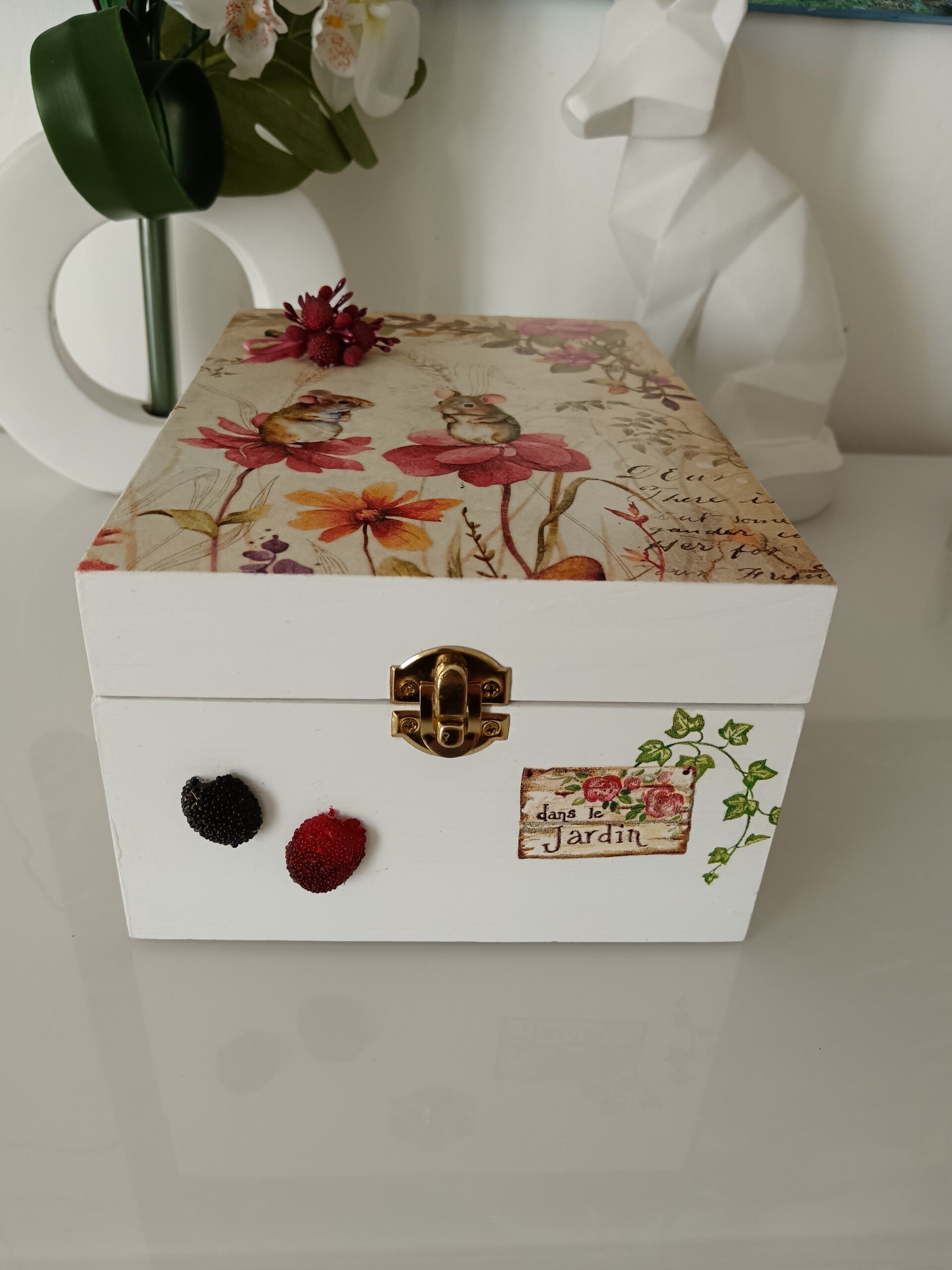 Boîte en bois à 4 compartiments, décorée à la main avec la technique du serviettage dans un esprit doux et champêtre. Adorable illustration de petits animaux et fleurs délicates, sublimée par des détails en relief pour une finition pleine de charme.