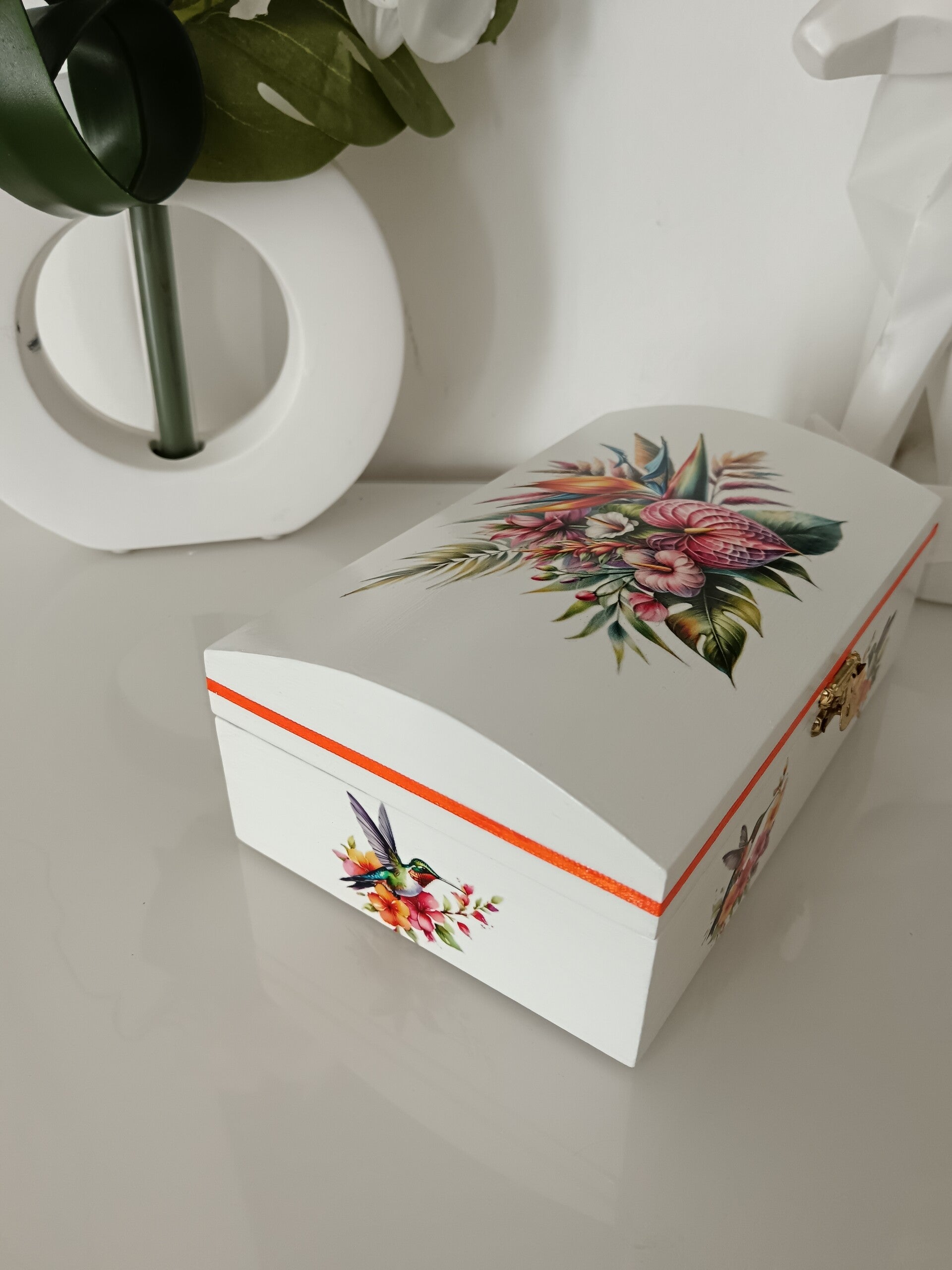 Coffre en bois en bois décoré à la main, sublimé par de délicats motifs floraux exotiques et de jolis colibris aux couleurs éclatantes. Chaque détail est soigneusement travaillé pour offrir une pièce unique, alliant élégance et originalité. Protégé par plusieurs couches de vernis.