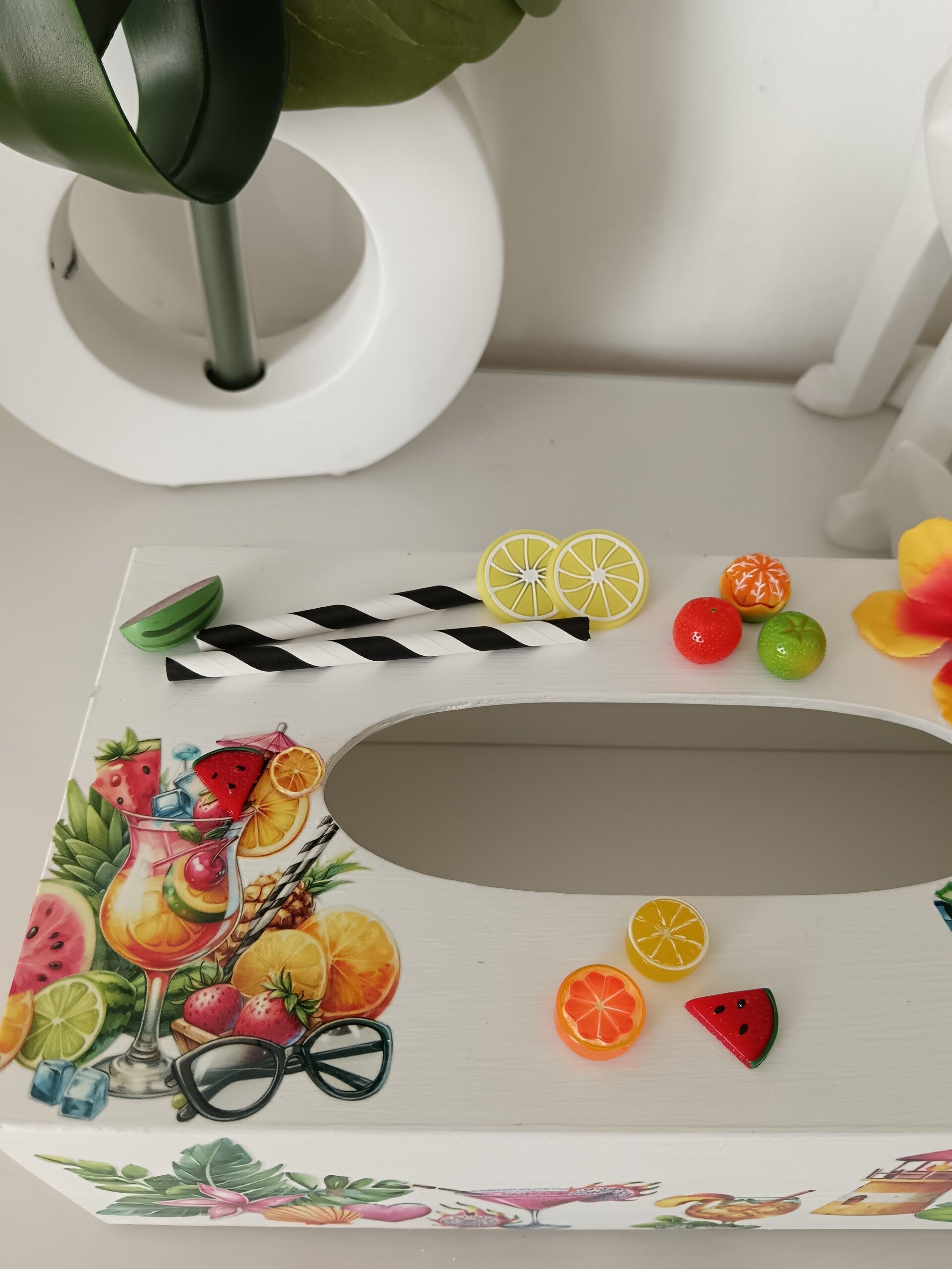 Apportez une touche tropicale et pleine de fraîcheur à votre intérieur avec cette boîte à mouchoirs en bois, décorée à la main avec soin. Ses motifs colorés inspirés de l’été (fruits, cocktails, fleurs exotiques) en font un véritable objet déco, aussi pratique qu’esthétique. Unique et originale, elle habille élégamment votre salon, chambre ou bureau tout en gardant vos mouchoirs à portée de main. Un accessoire artisanal qui allie charme, qualité et bonne humeur. Protégée par plusieurs couches de vernis.